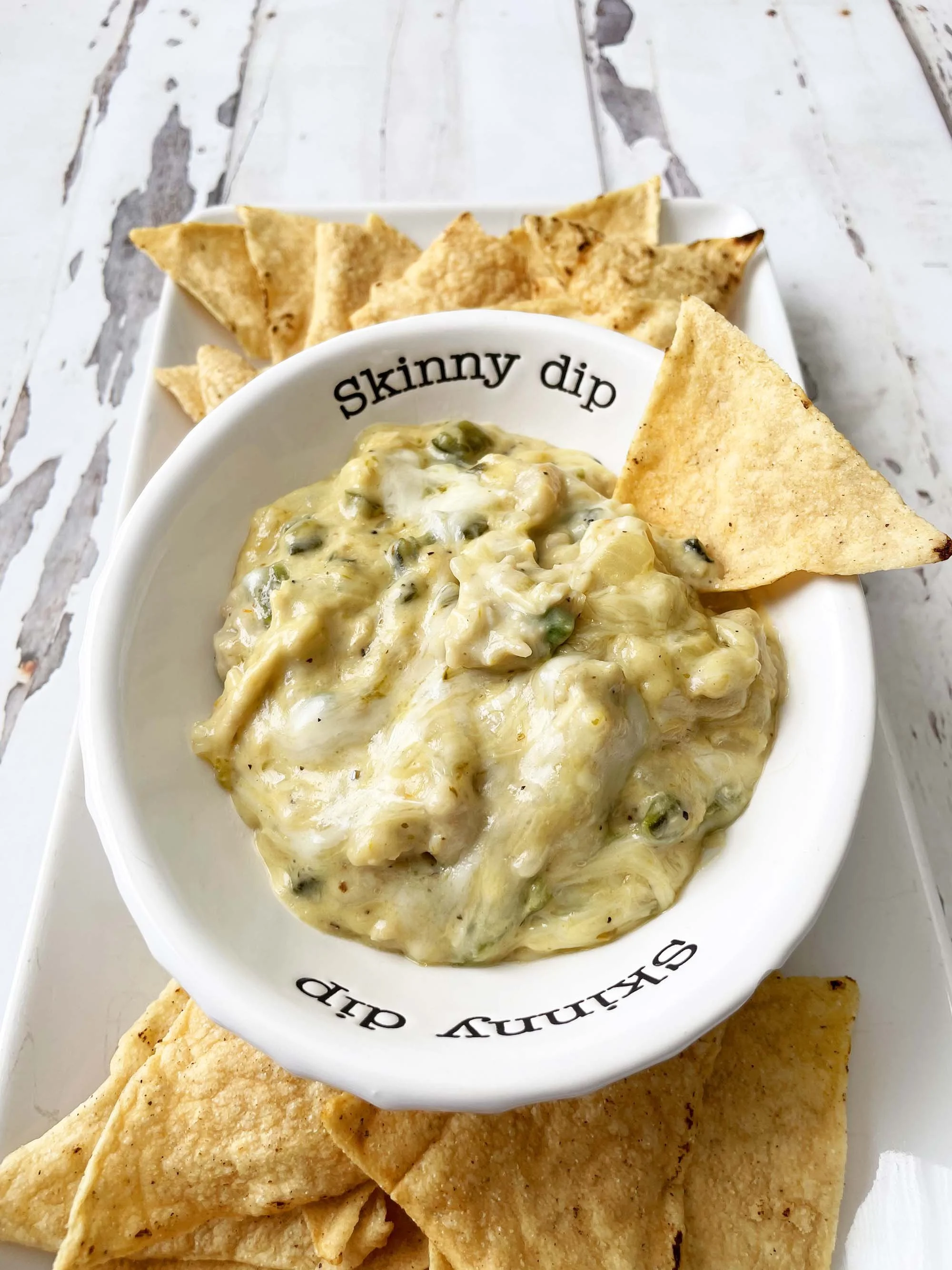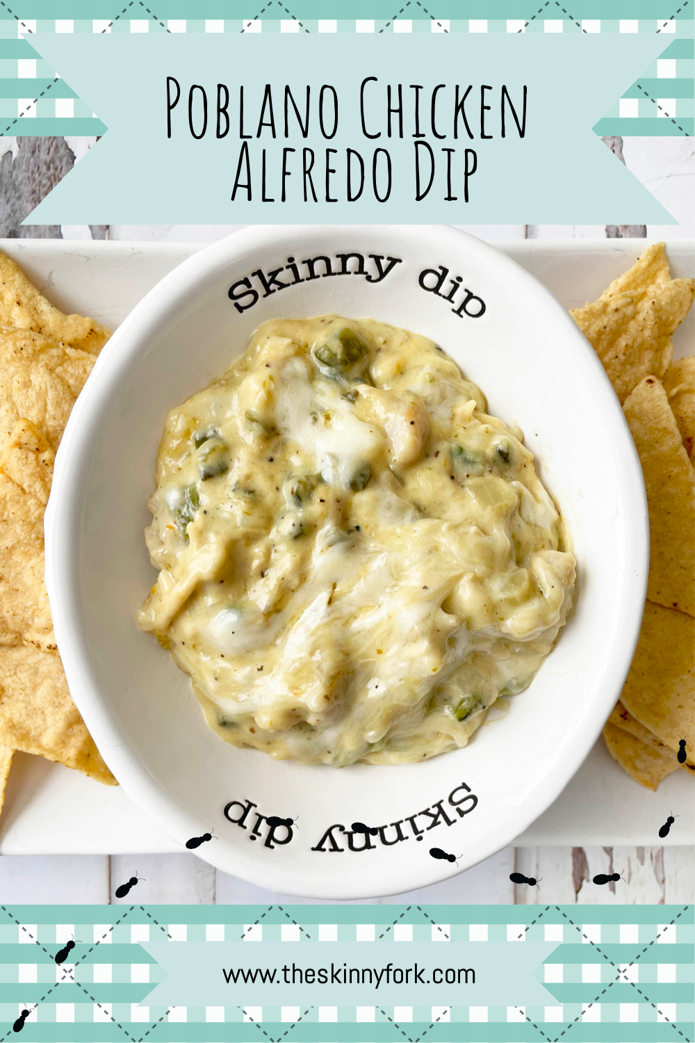 This twist on a classic dip is creamy, flavorful, and healthier than the original. Instead of using heavy cream and tons of cheese, this version a remade light alfredo sauce. The addition of poblano peppers and chicken gives the dip more depth of flavor and a boost of protein.