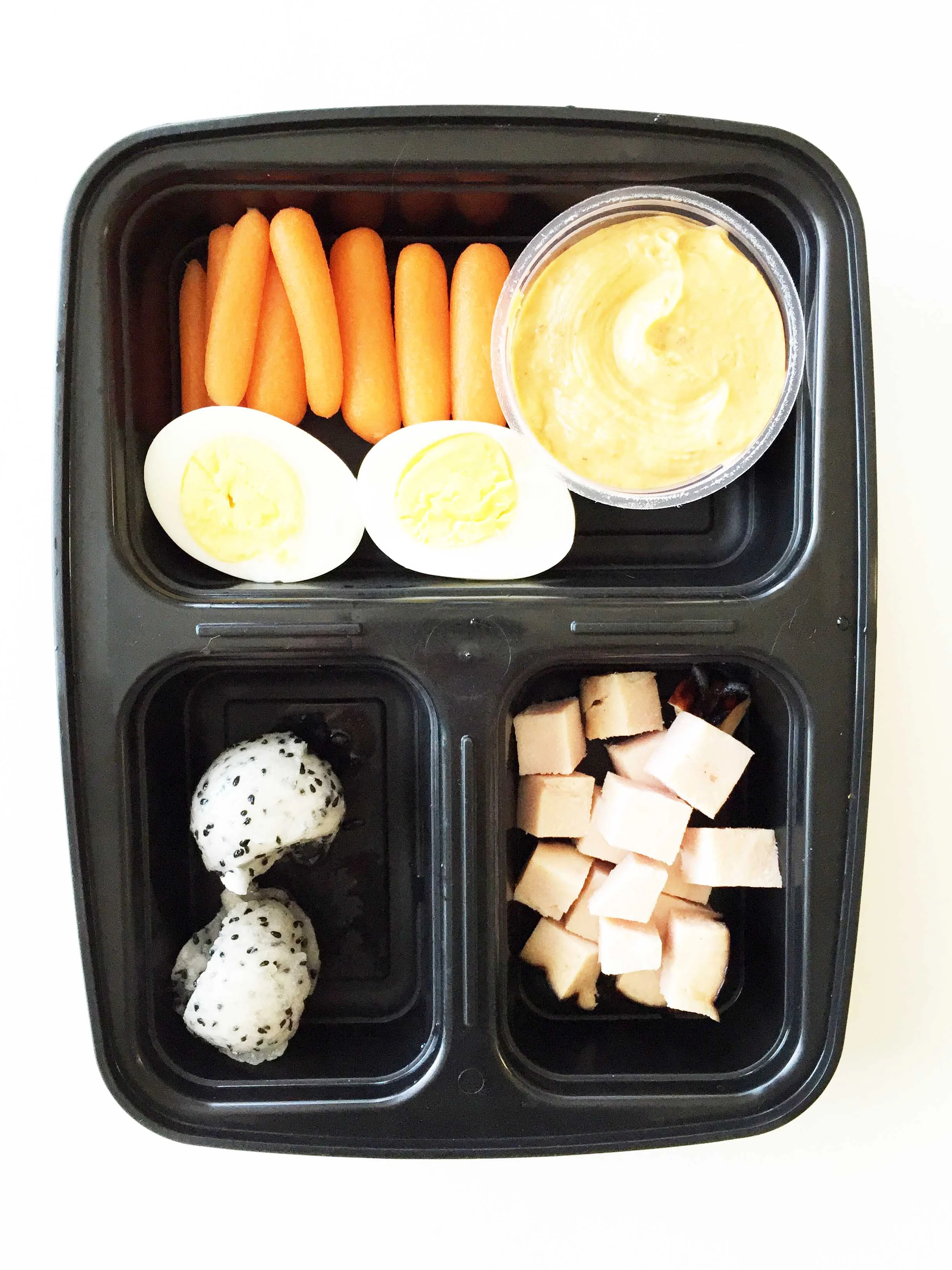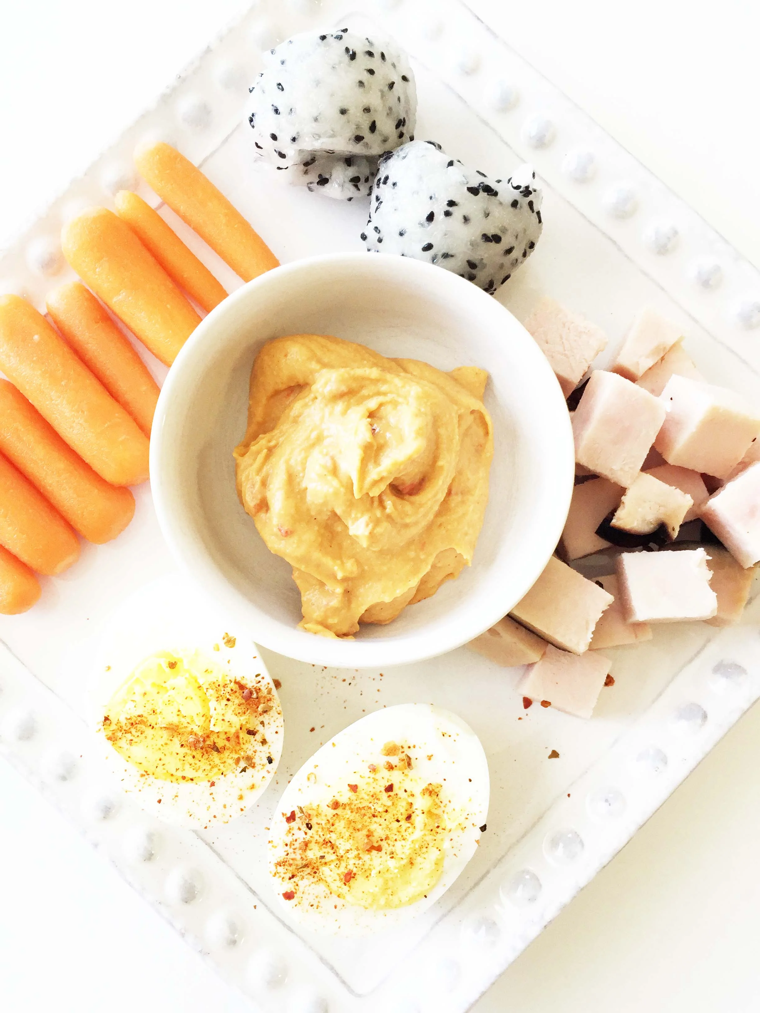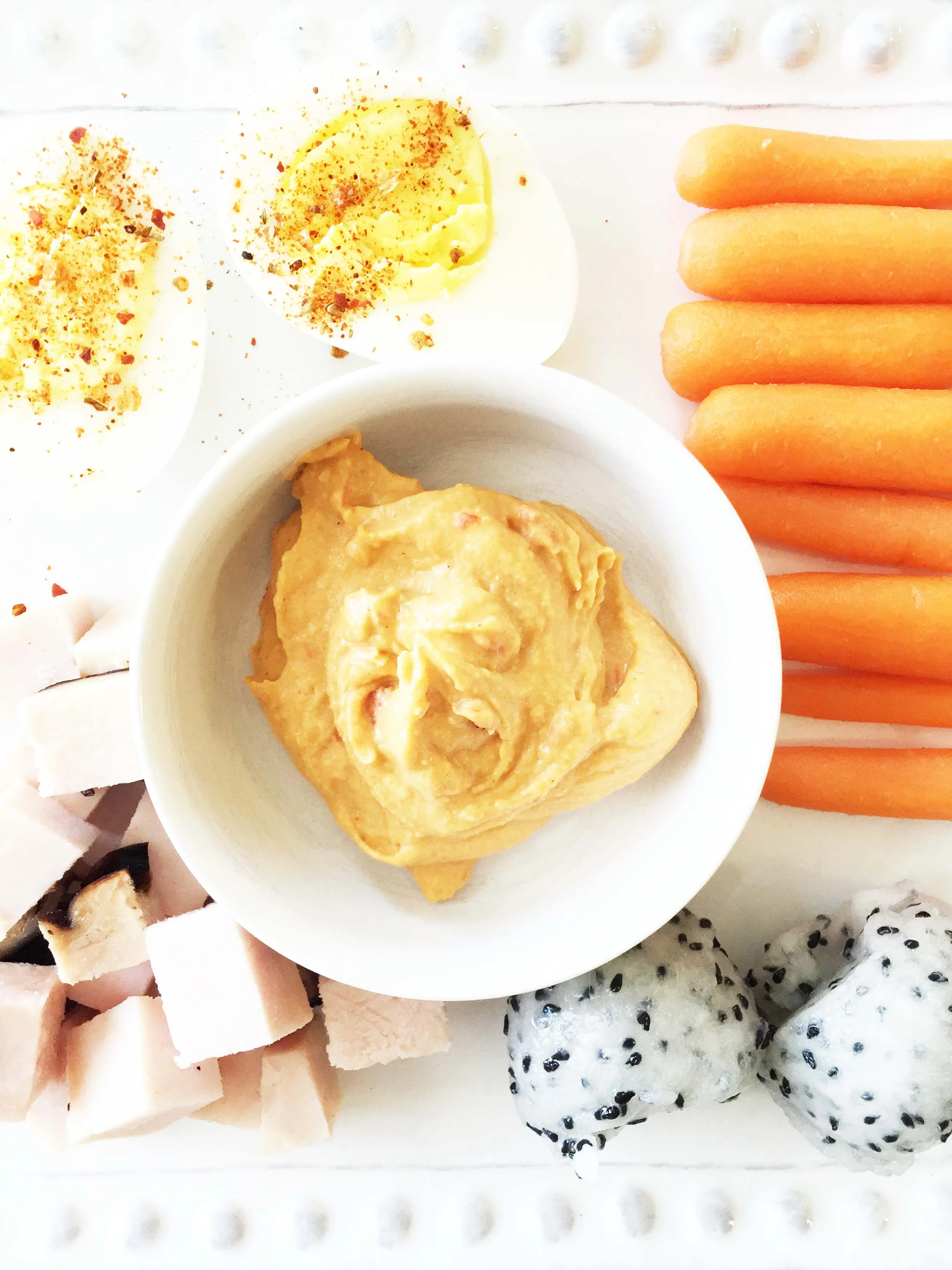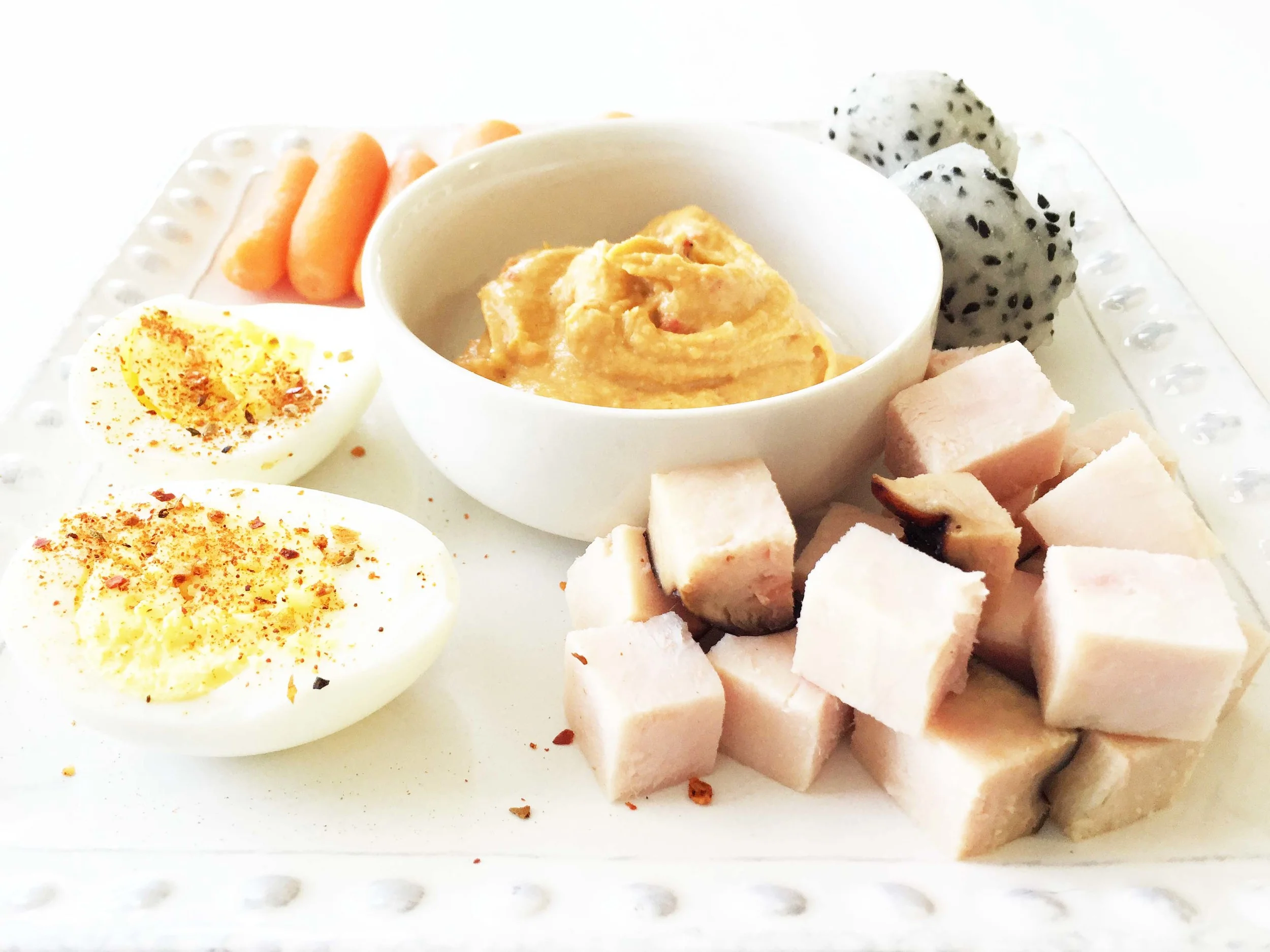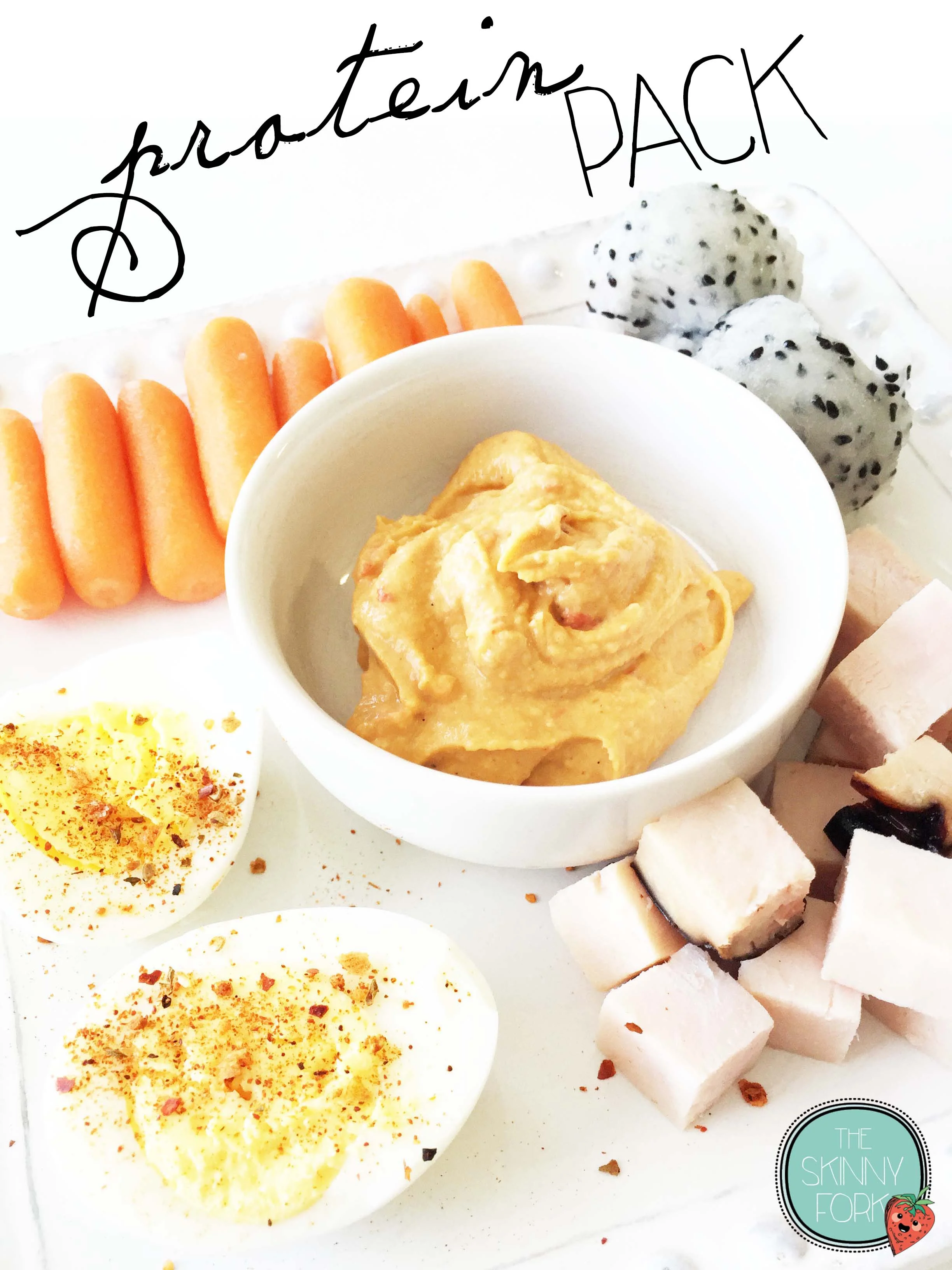 For this protein pack, I started with some Roasted Red Pepper Hummus. Store-bought or homemade will work just the same, so whichever you prefer will do! The deli turkey and hardboiled egg are where you get the power punch of protein from.