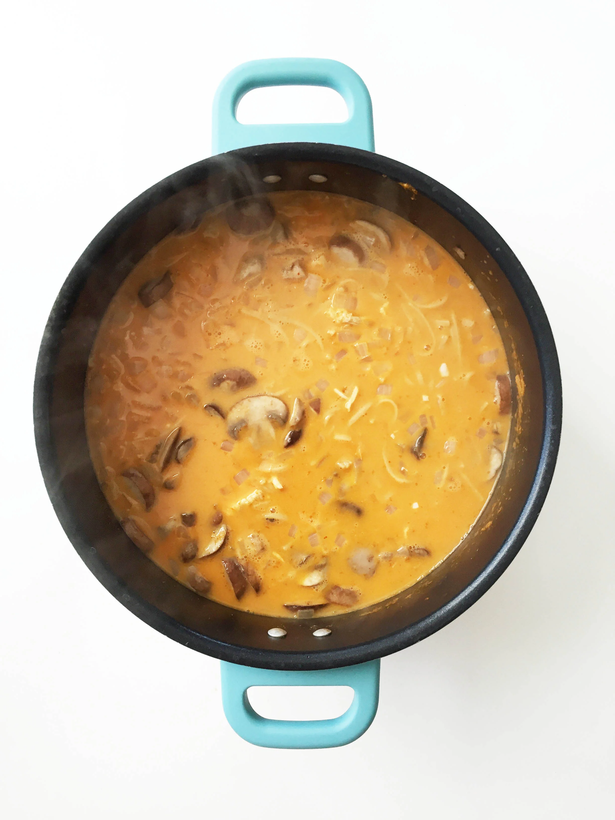 Once the veggies are done, stir in the broth, chicken, mushrooms, coconut milk and pumpkin puree to the pot.