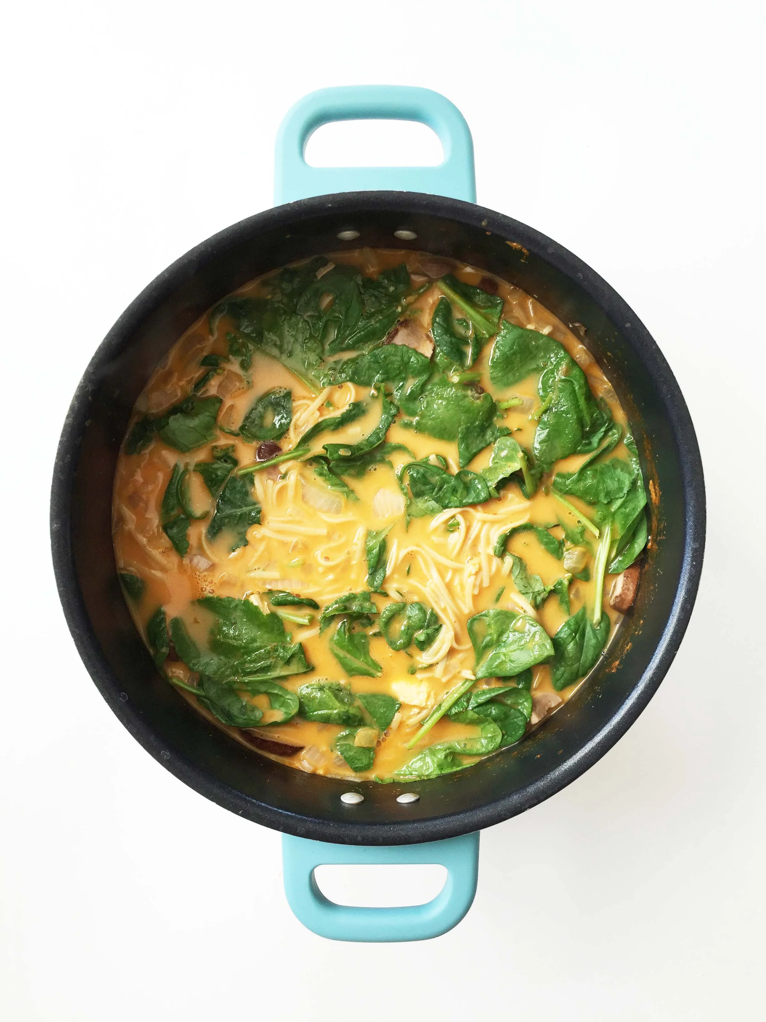 When the soup is hot and boiling, add the noodles and greens to the pot and allow it all to heat back through to a simmer; allowing the greens to wilt as well.