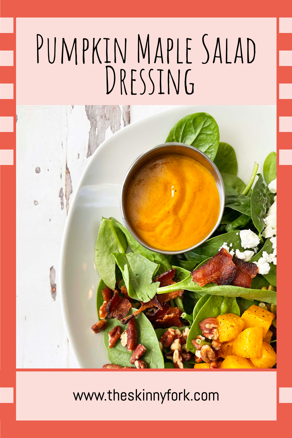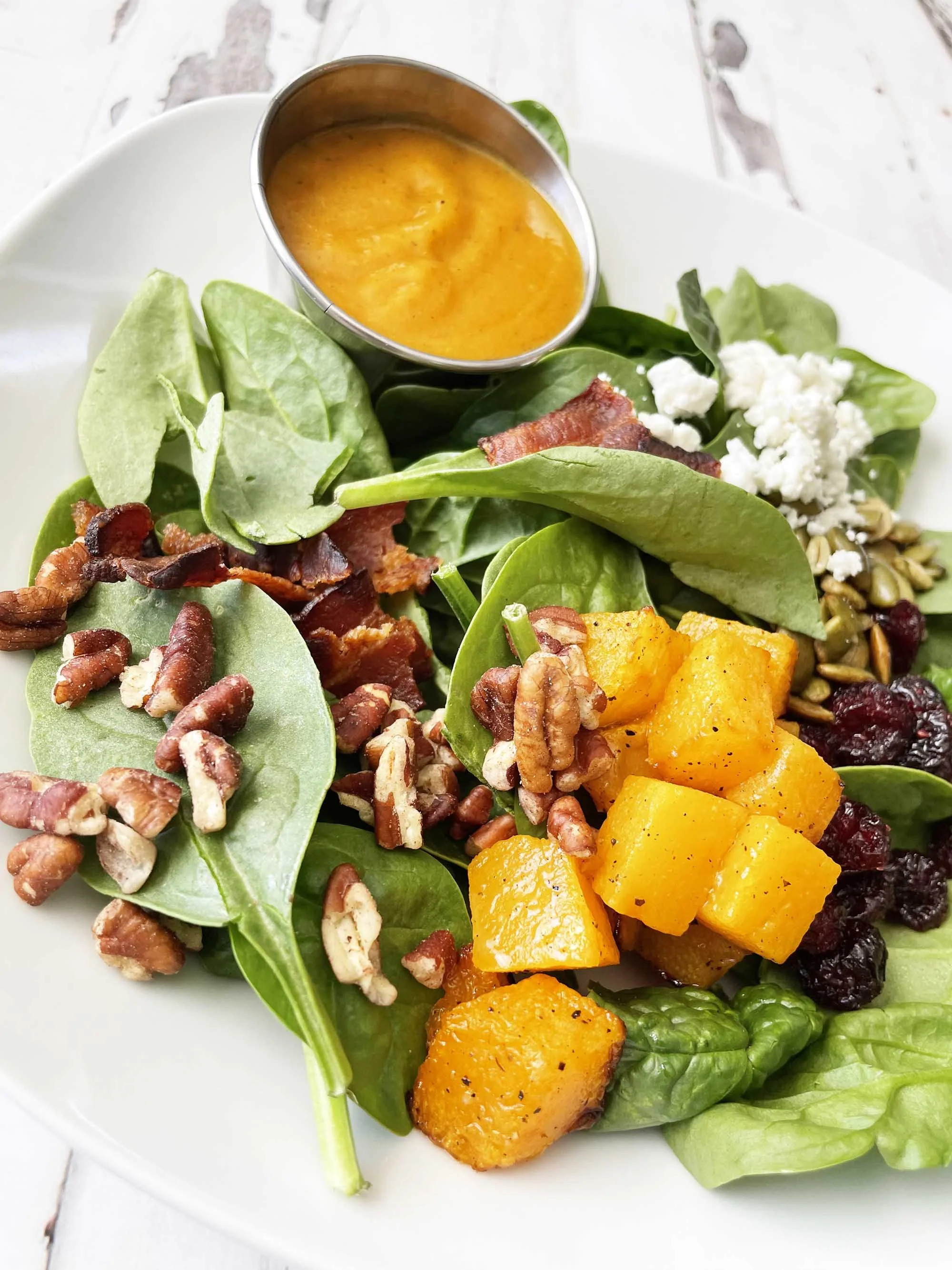 I used this dressing with a simple fall inspired salad with a base of baby spinach that’s topped with roasted butternut squash, dried cranberries, pecans, and goat cheese. It was a super easy dish that is great as a lunch or even a side salad as part of a dinner.