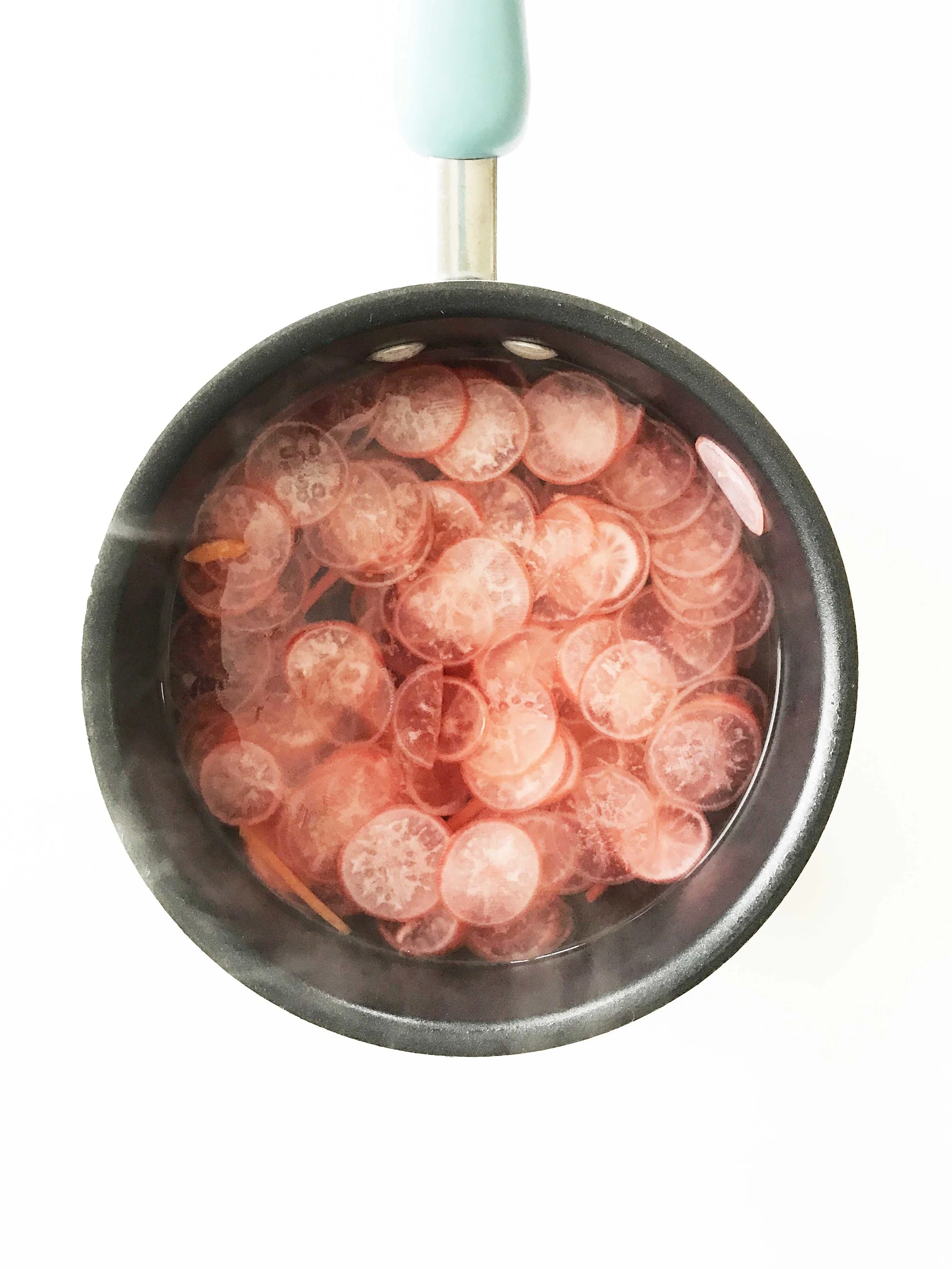 Place the 2 C. Water, 2 C. Distilled White Vinegar, 1 Bunch of Radishes, 1/2 C. Carrots, 1 Tbsp. Sugar and 1/2 Tbsp. Sea Salt into a large pot together and give it a good stir.