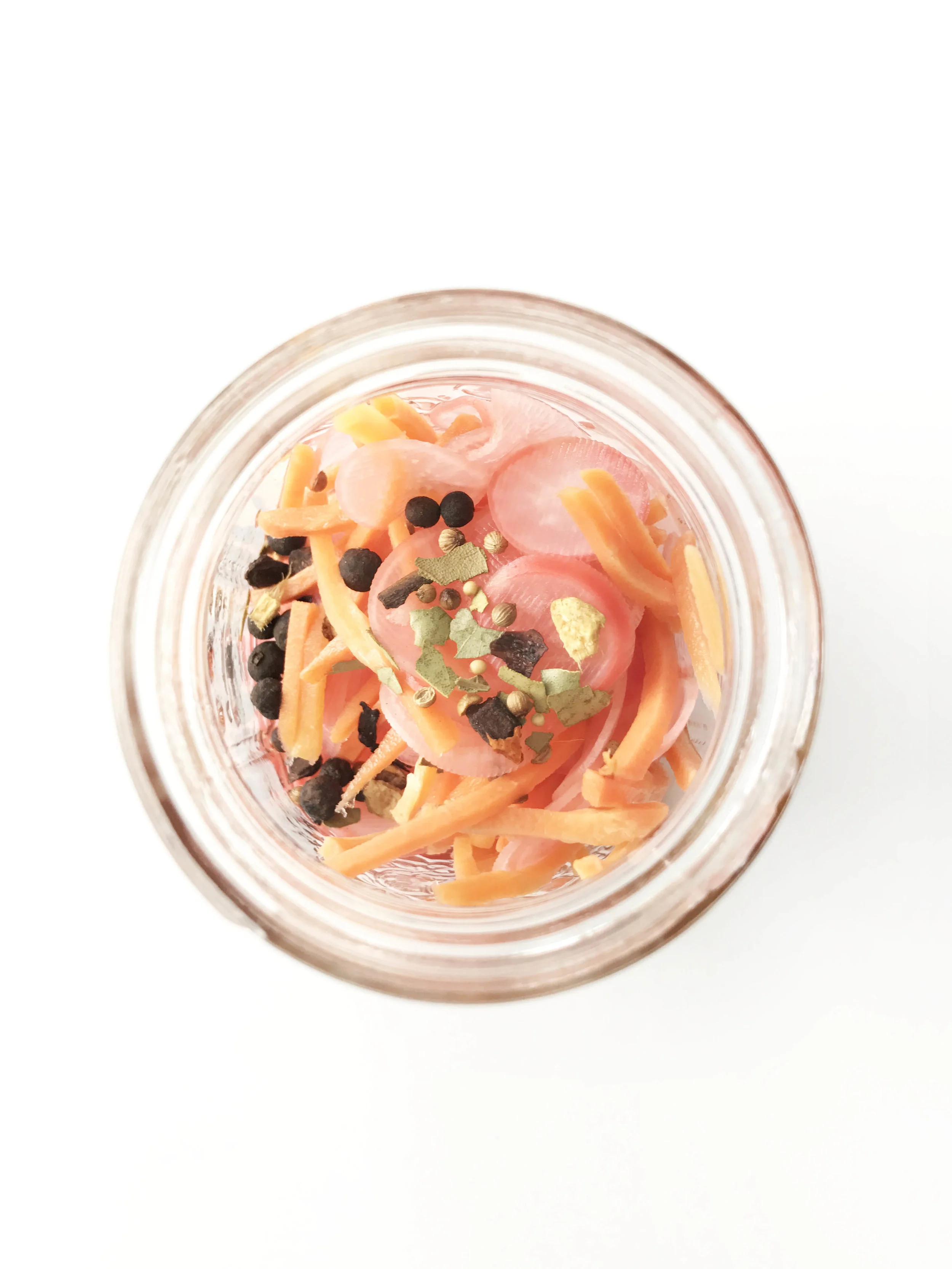 If you're wanting to add more spice to your life, try adding in a sliced jalapeño or some garlic to the veggies to pickle with them. I wasn't quite that brave myself today, because jalapeños can be so unpredictable in the heat department and I wasn't prepared to burn my tastebuds off today. Maybe next time though!