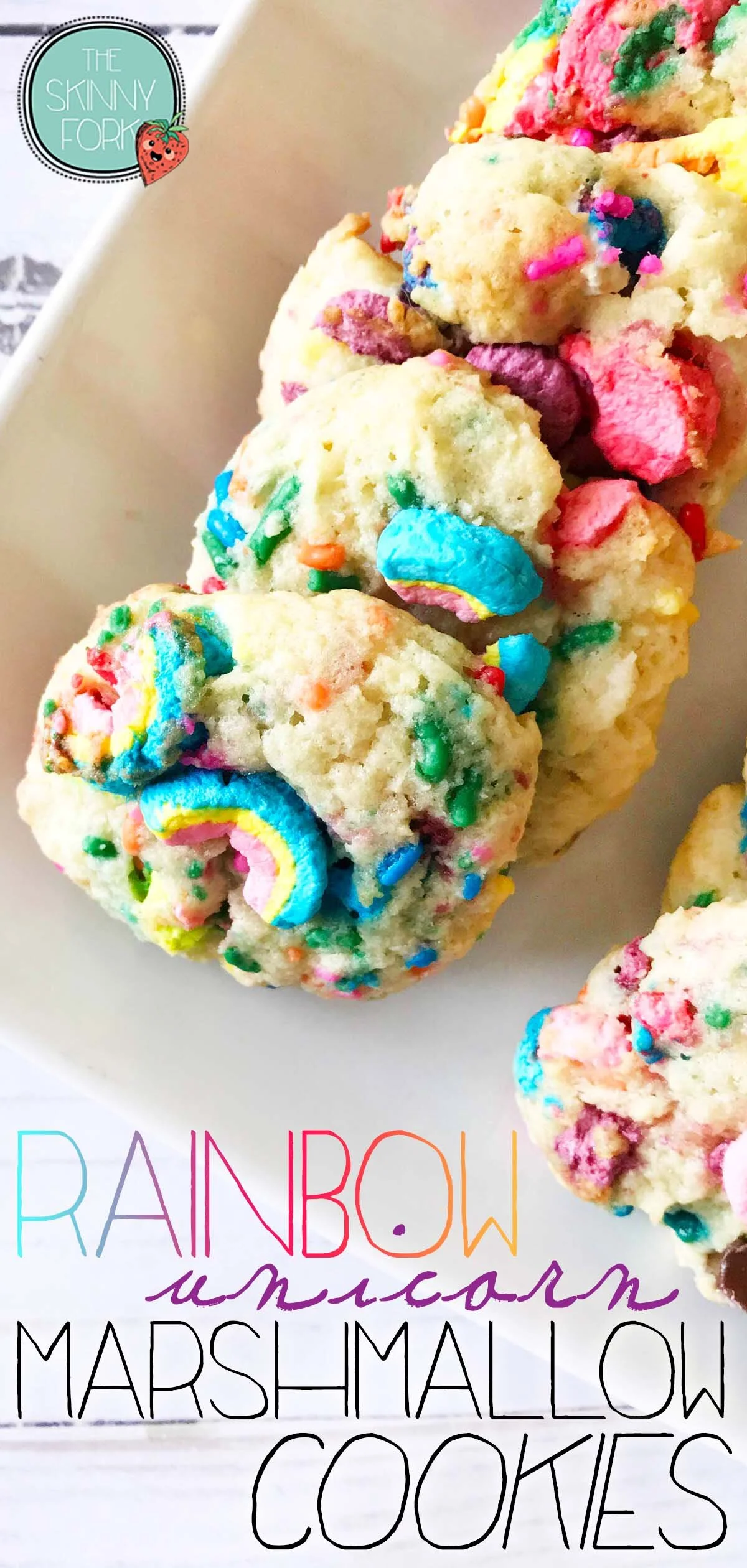 TheSkinnyFork.com Everything anyone could love. Rainbows. Unicorns. And Marshmallows. These cookies have it all! Easy to make and only one bowl needed. Prep Time: 10 Minutes • Cook Time: 10 Minutes