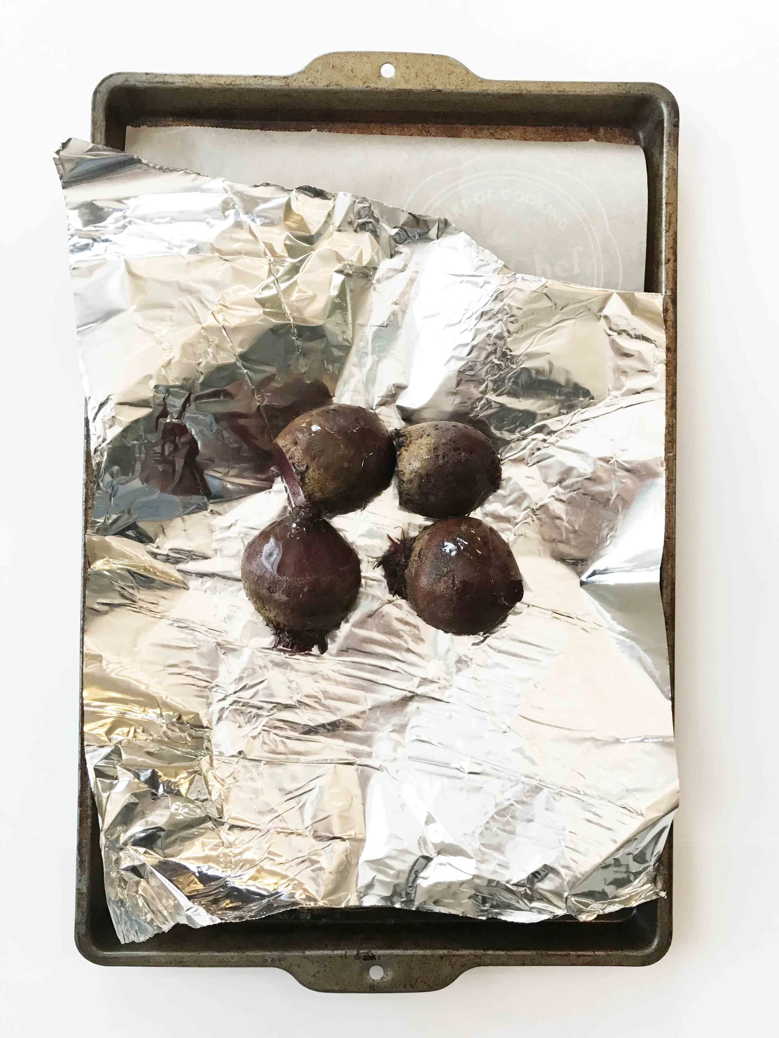 Wrap the beets up in the foil to seal them inside and place the wrapped up beets onto a baking sheet.