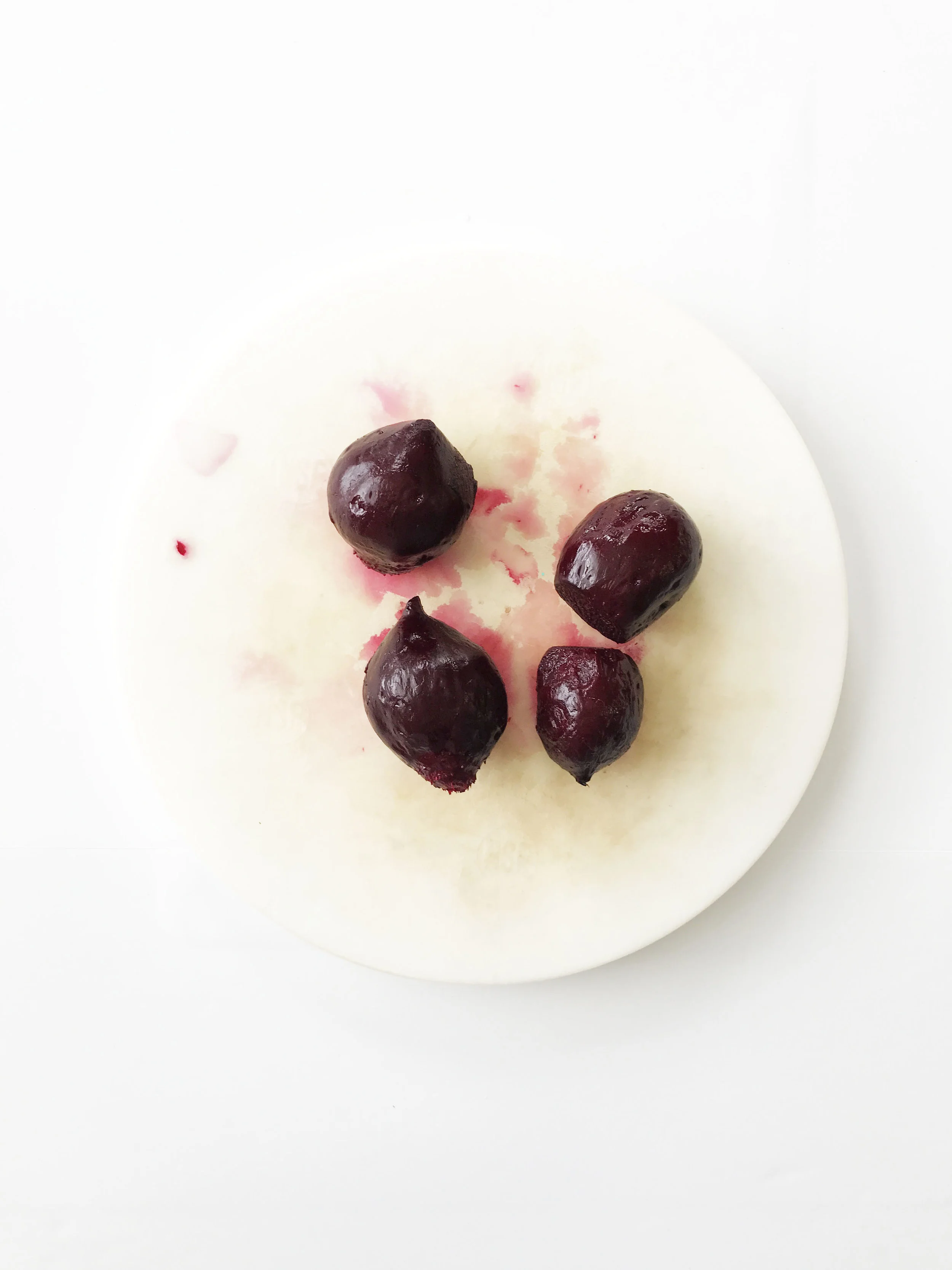 Once cool enough, carefully rub the skins off of the beets. The skin should just slip right off.