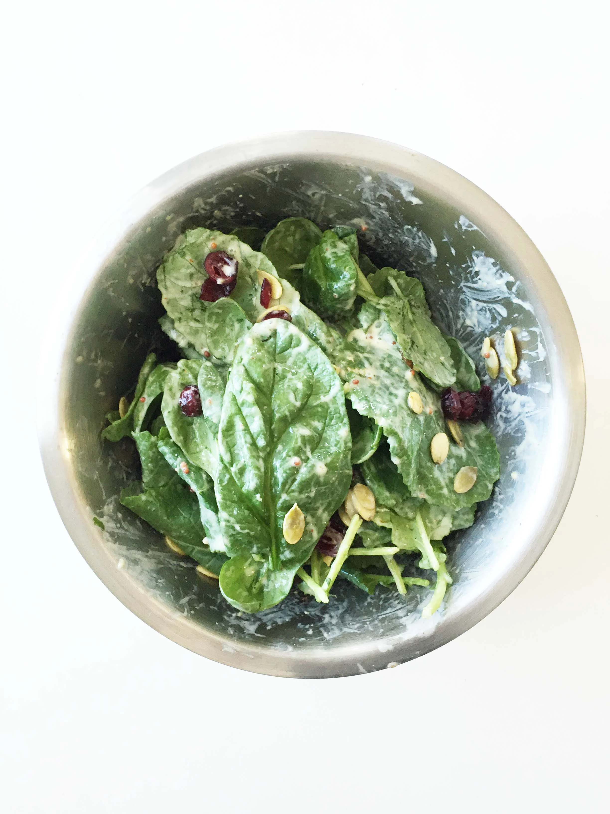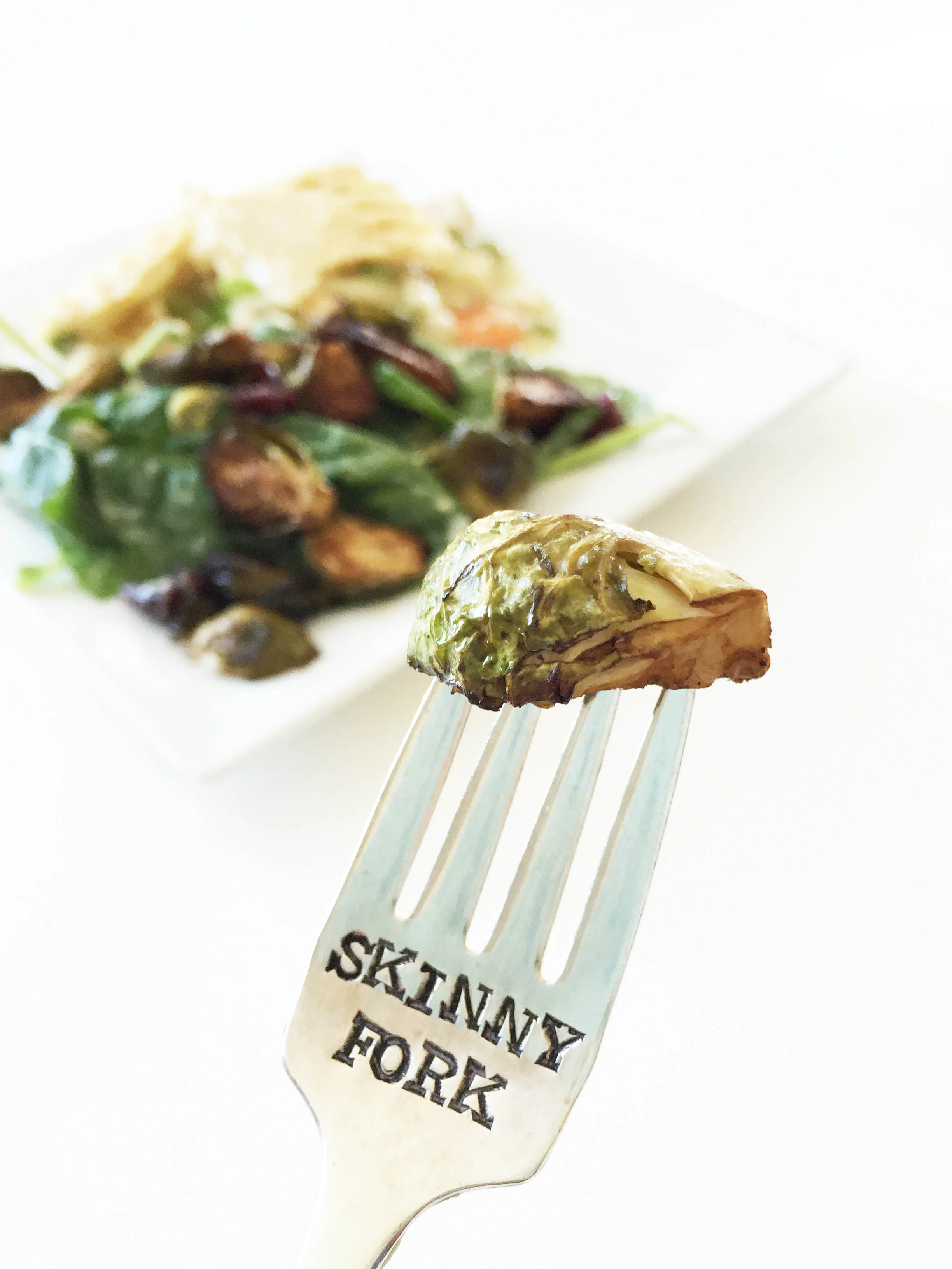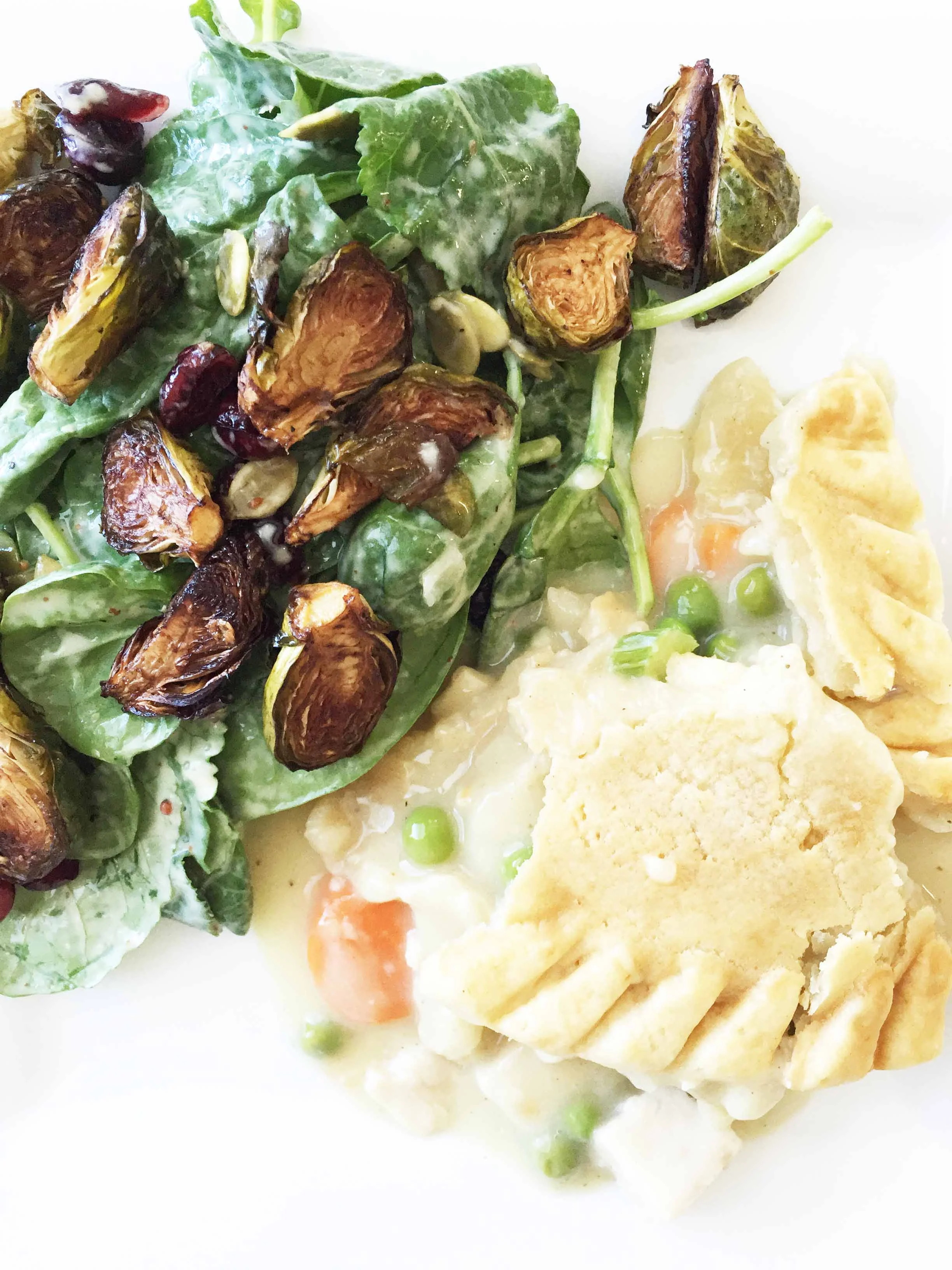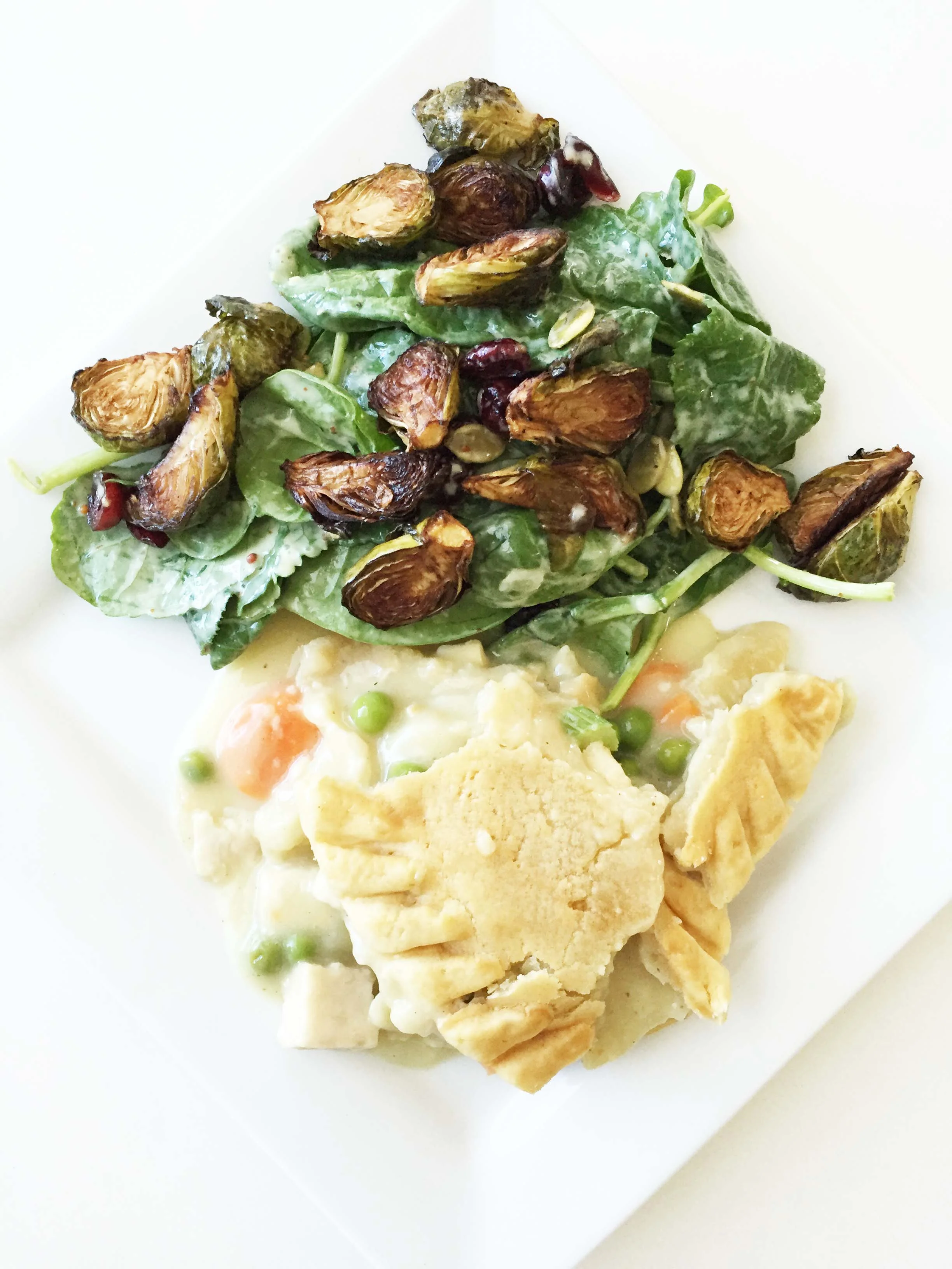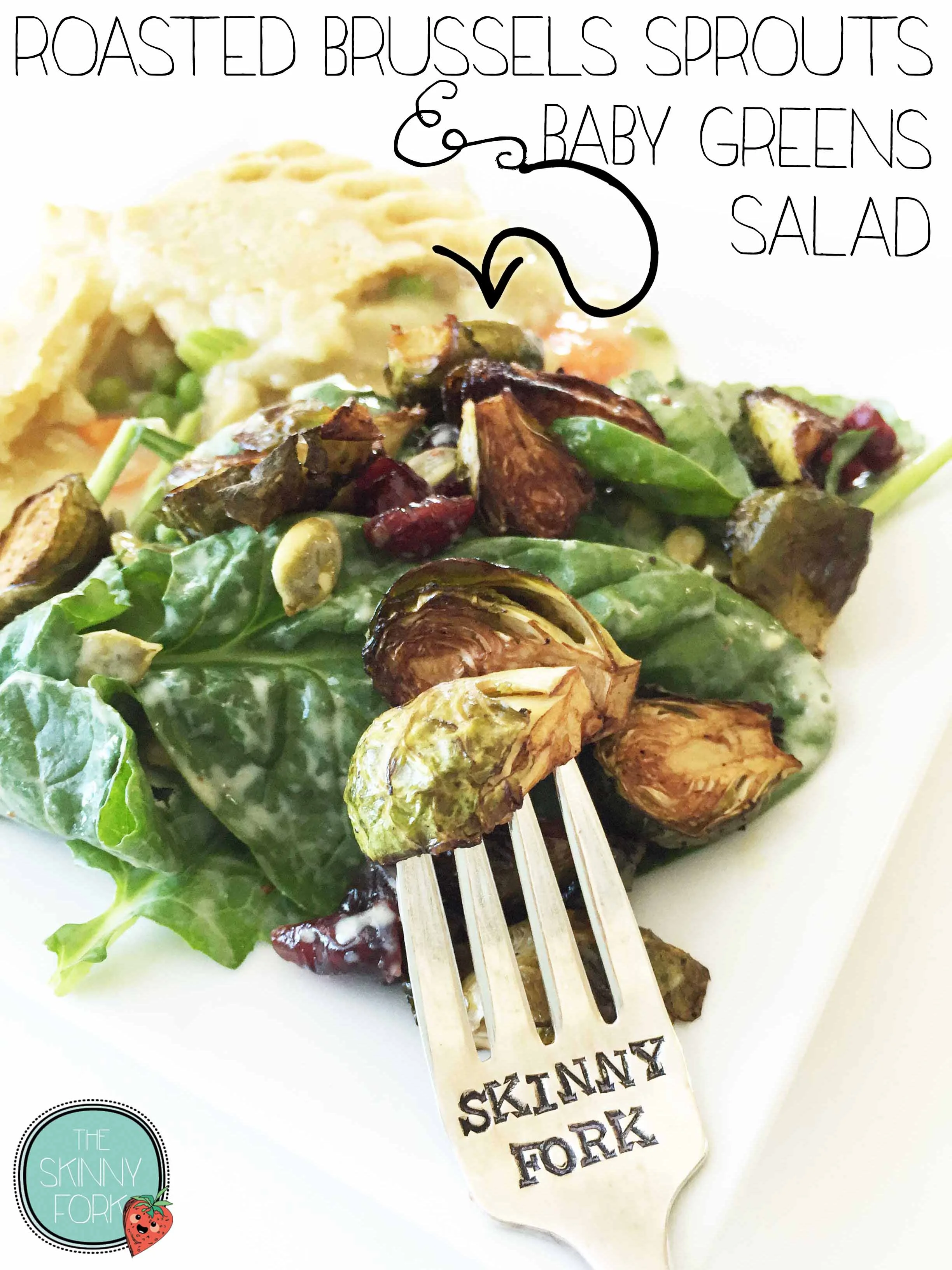 I thought that this Roasted Brussels Sprouts & Baby Green Salad was a perfect pairing for the pot pie. Naturally when I think of turkey, I think of cranberries. I chose to go with pipitas (pumpkin seeds) to stick with the fall theme of the turkey and cranberries, while adding the nice warm crisp and tender roasted brussels sprouts.