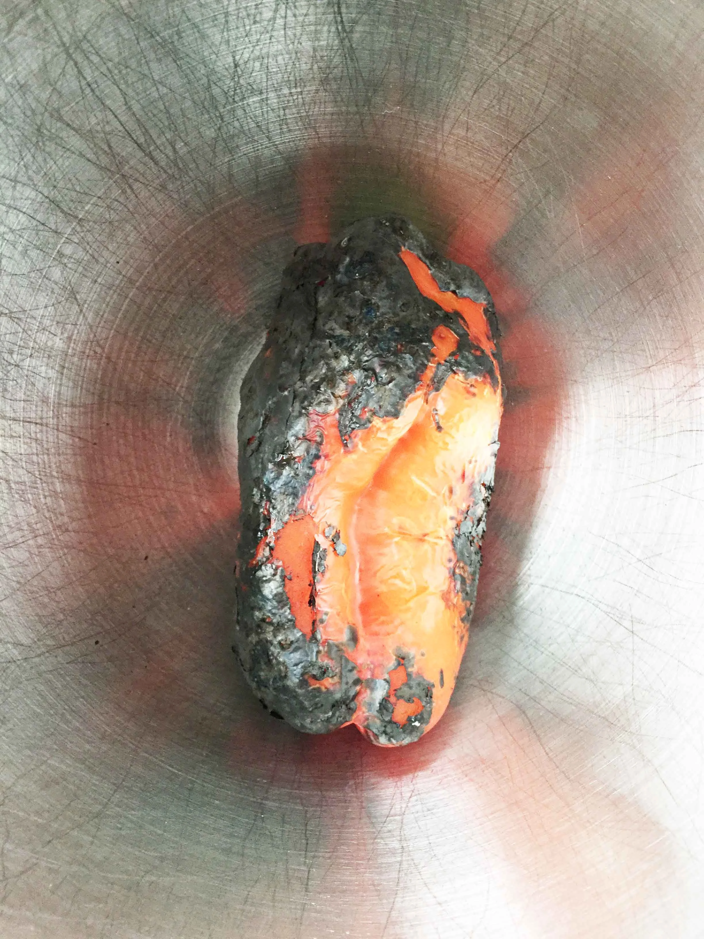 When the pepper has sweat for a while and cooled, carefully remove it from the bowl and remove the charred skin. It should come off rather easily.