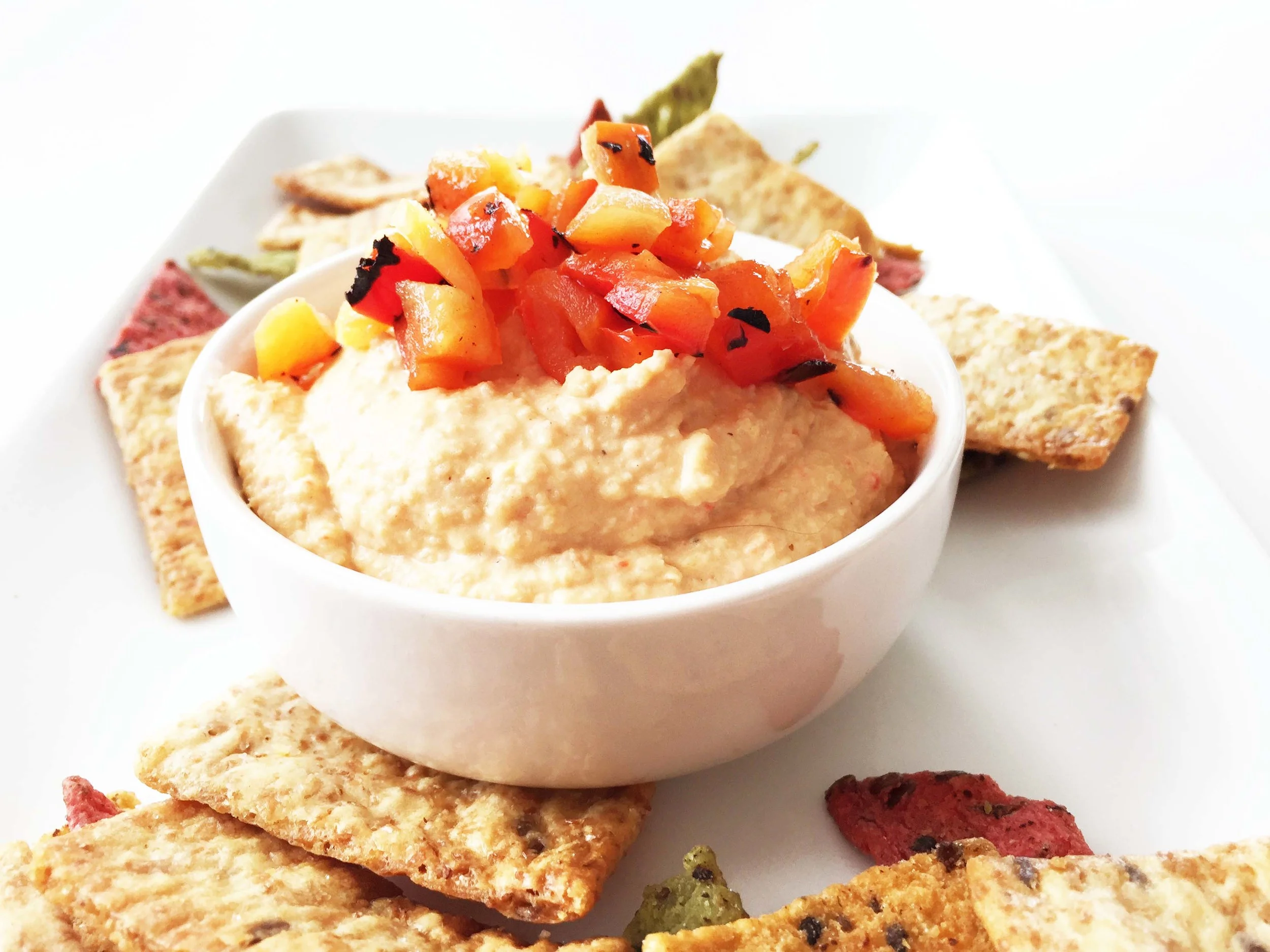 Did you know that it only takes a handful of ingredients and about 1 minute to make yourself your own fresh homemade hummus? Yep. A few more bonus minutes to roast and sweat your bell pepper yourself and you're all set.