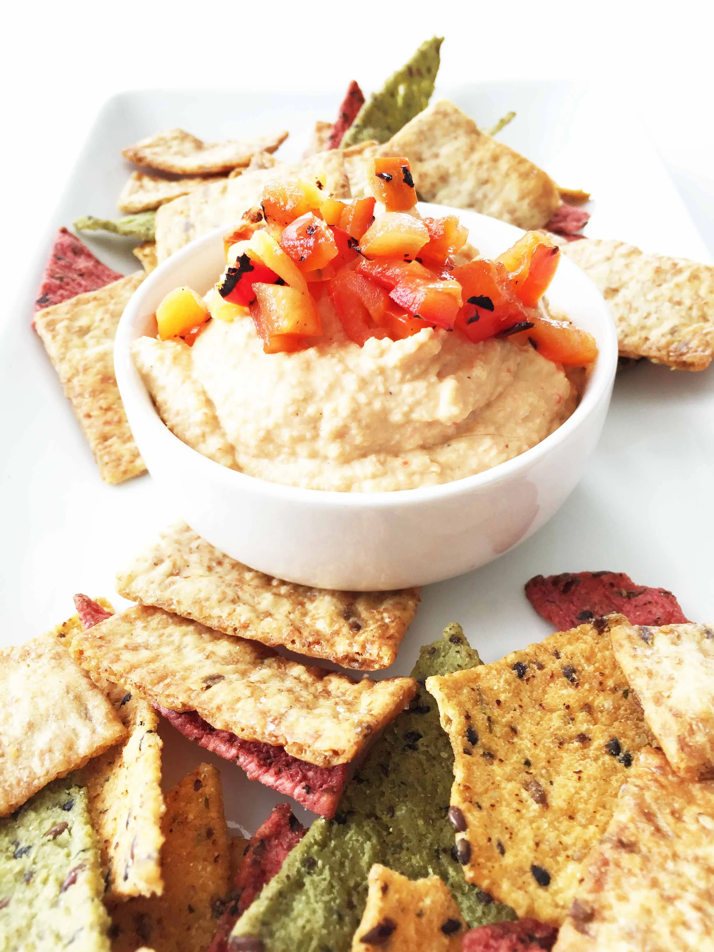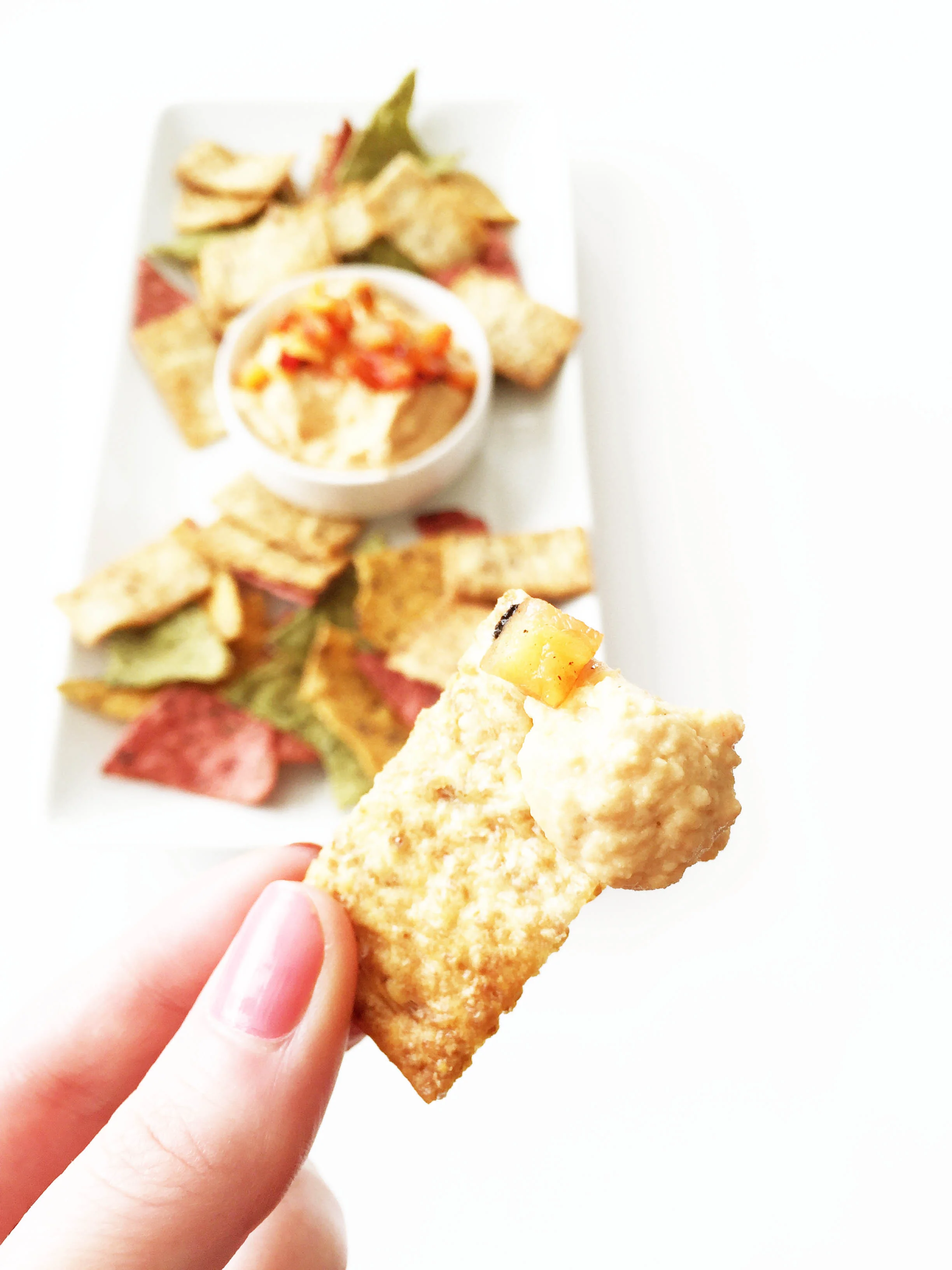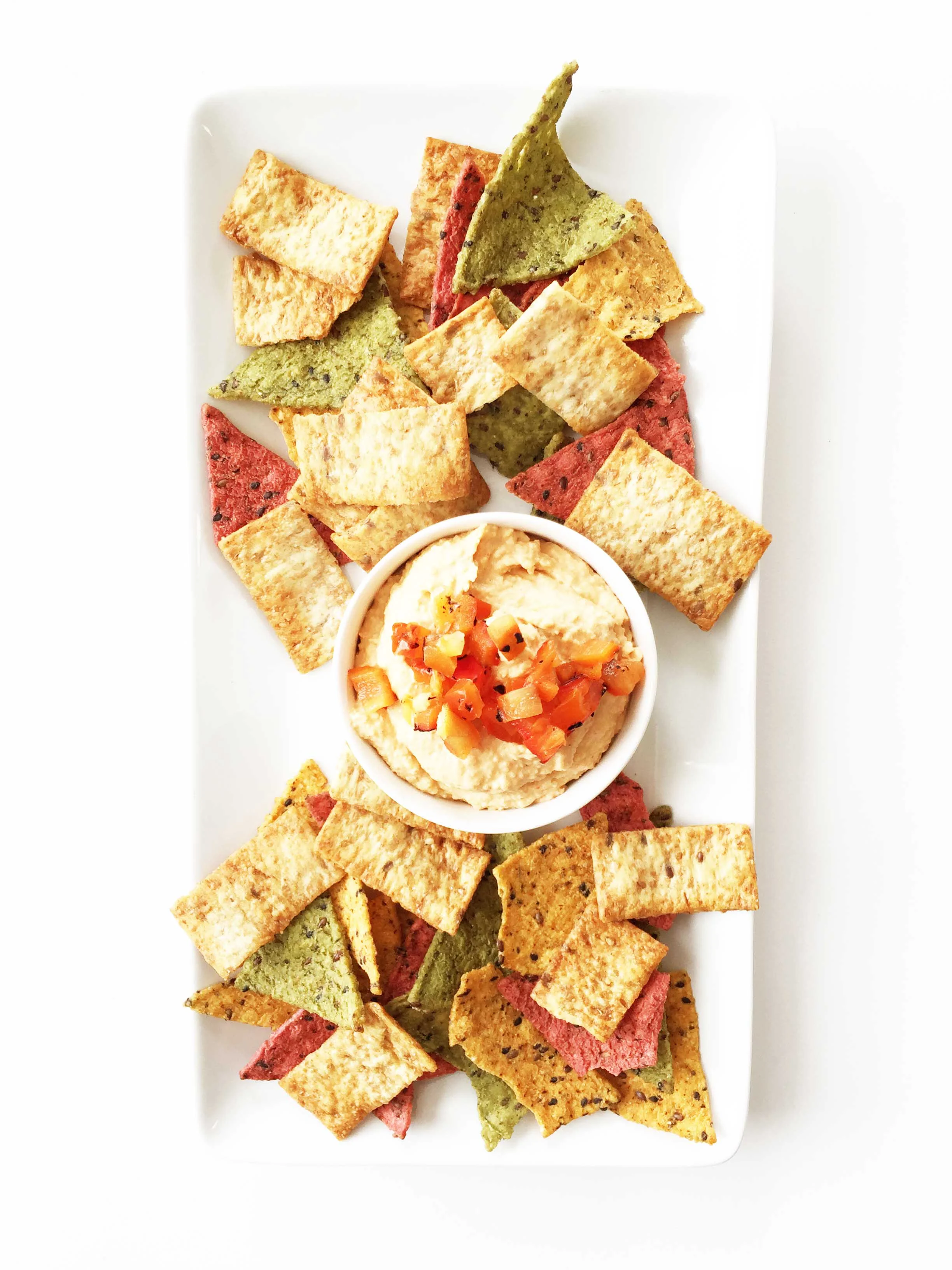 Today I served my hummus with some multi-grain and seed tortilla chips and some pita crisps, but I also have plans to use it in a fun little wrap for lunch this week!
