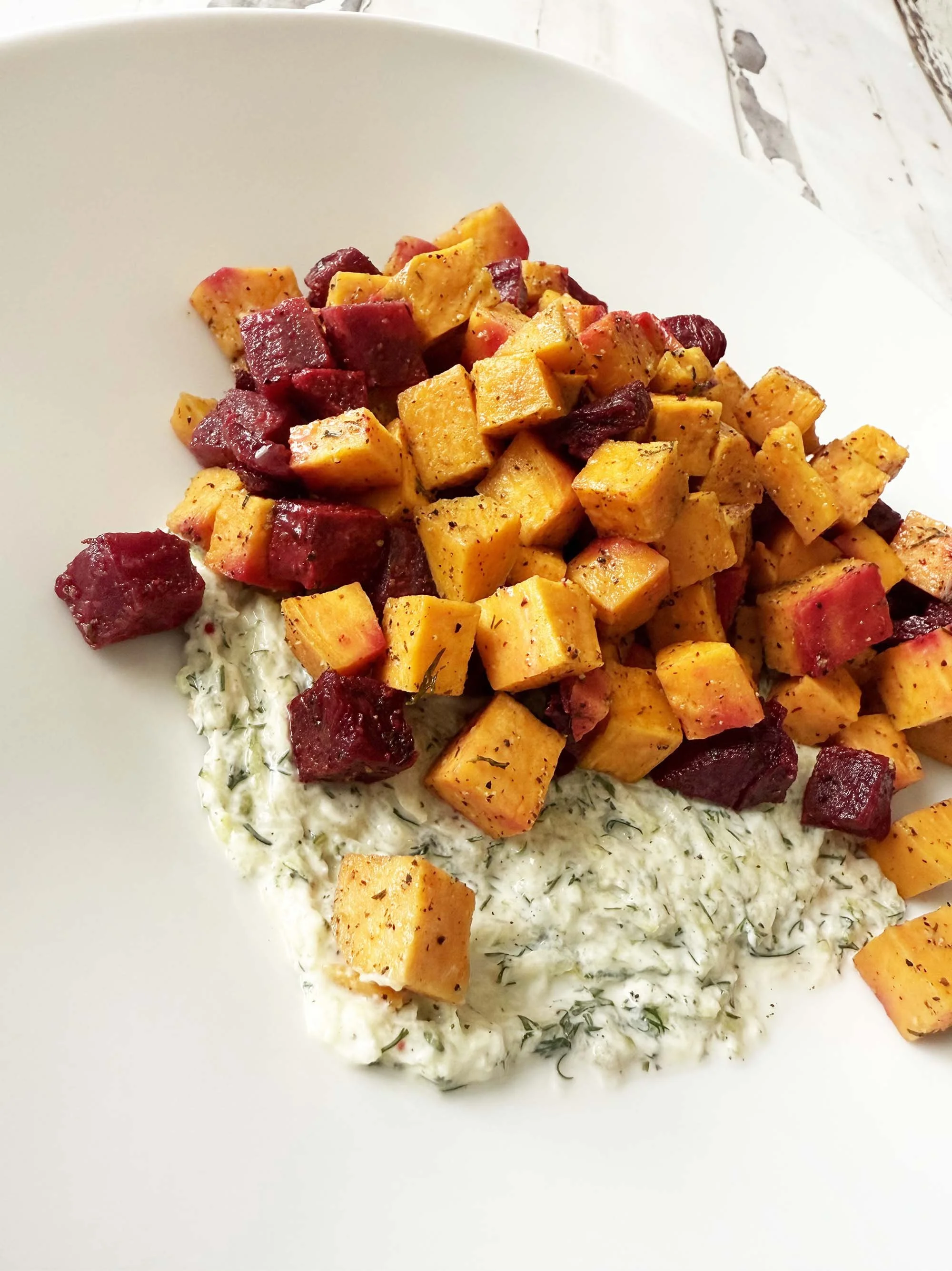 - Line plates with the Zucchini Dill Dressing divided evenly and then top with the beets and sweet potatoes. Enjoy right away!