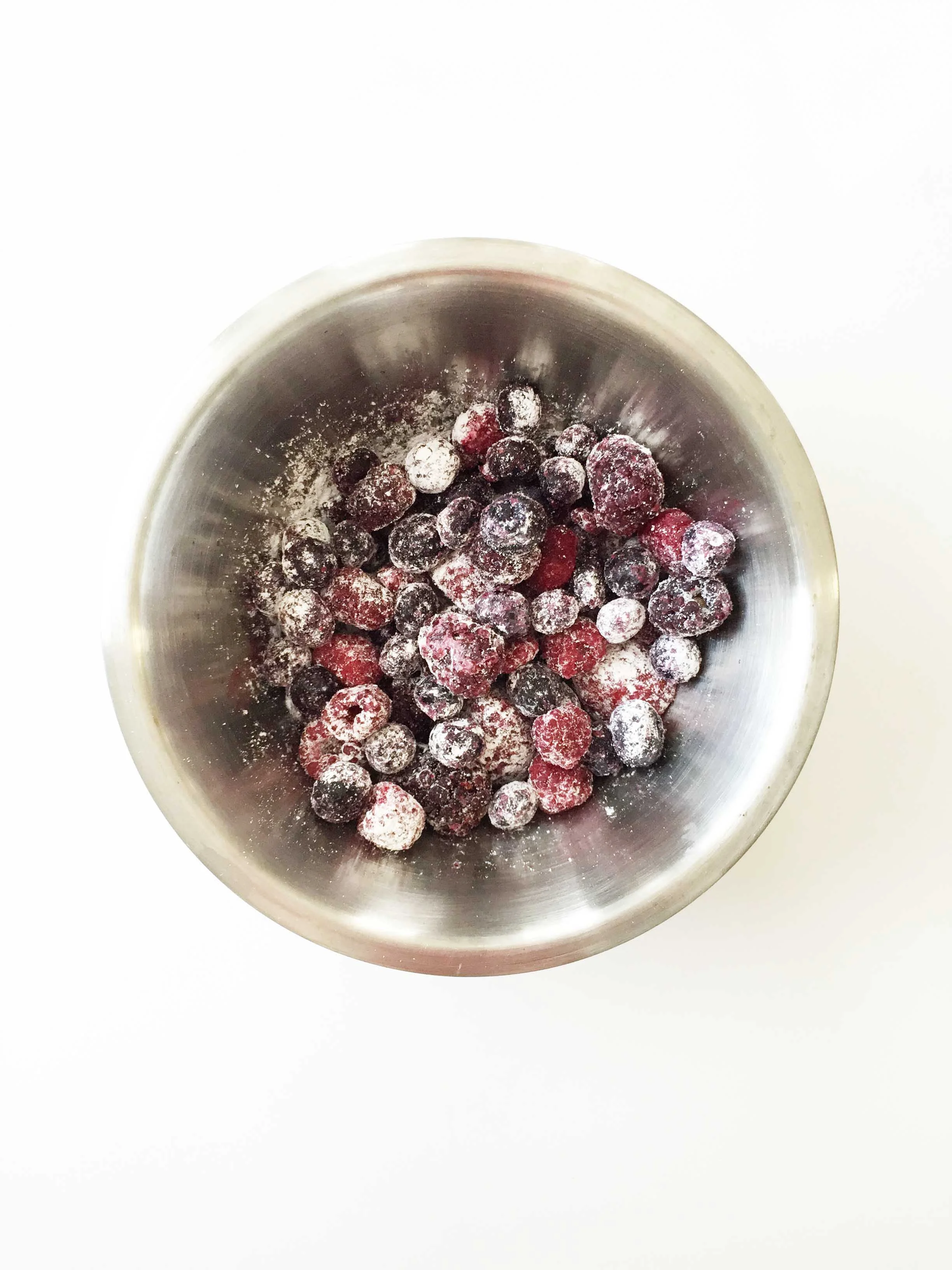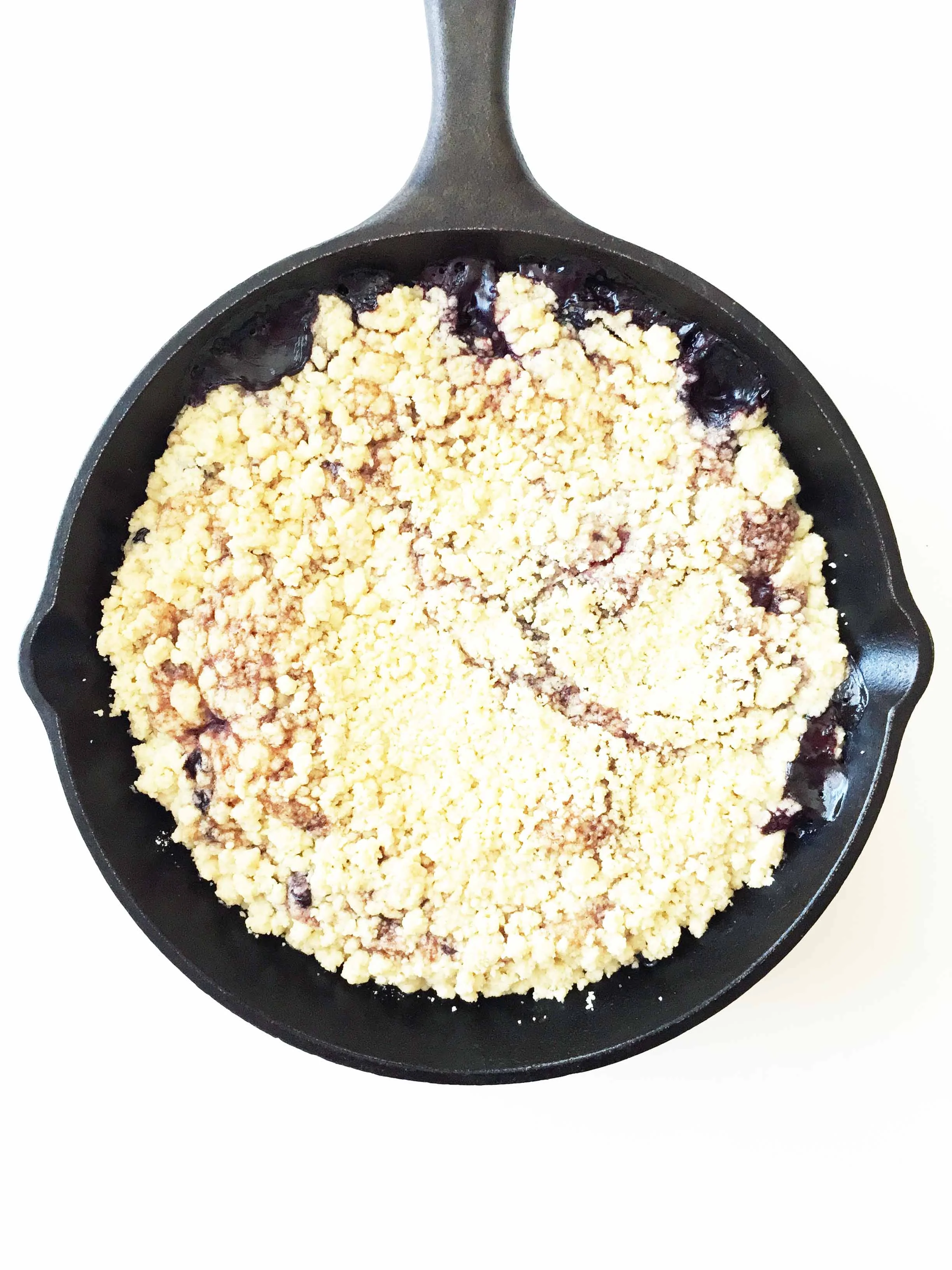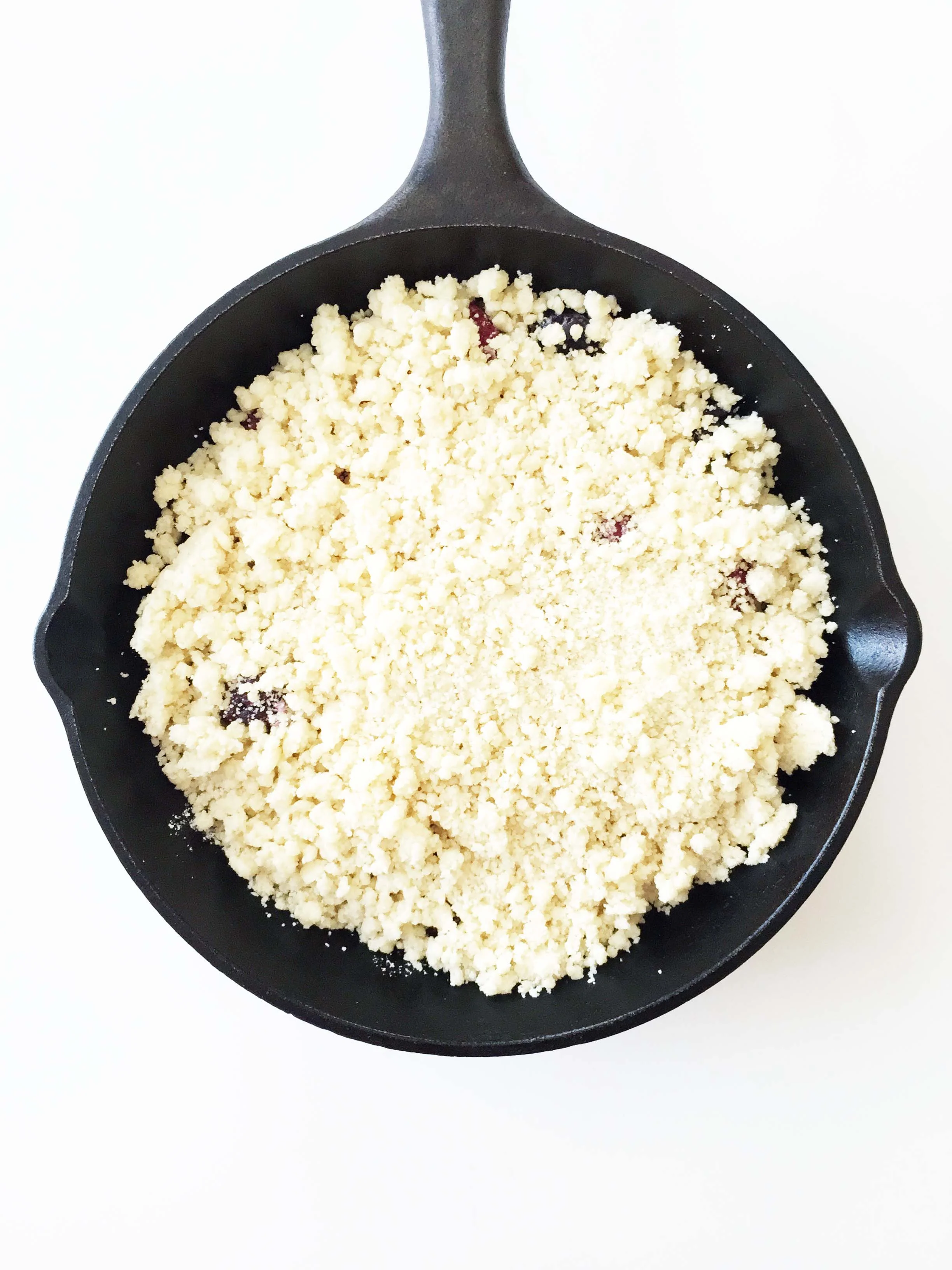 Combine your berries with the sugar and sweetener and transfer into the bottom of your oven safe skillet or cast iron baking dish.