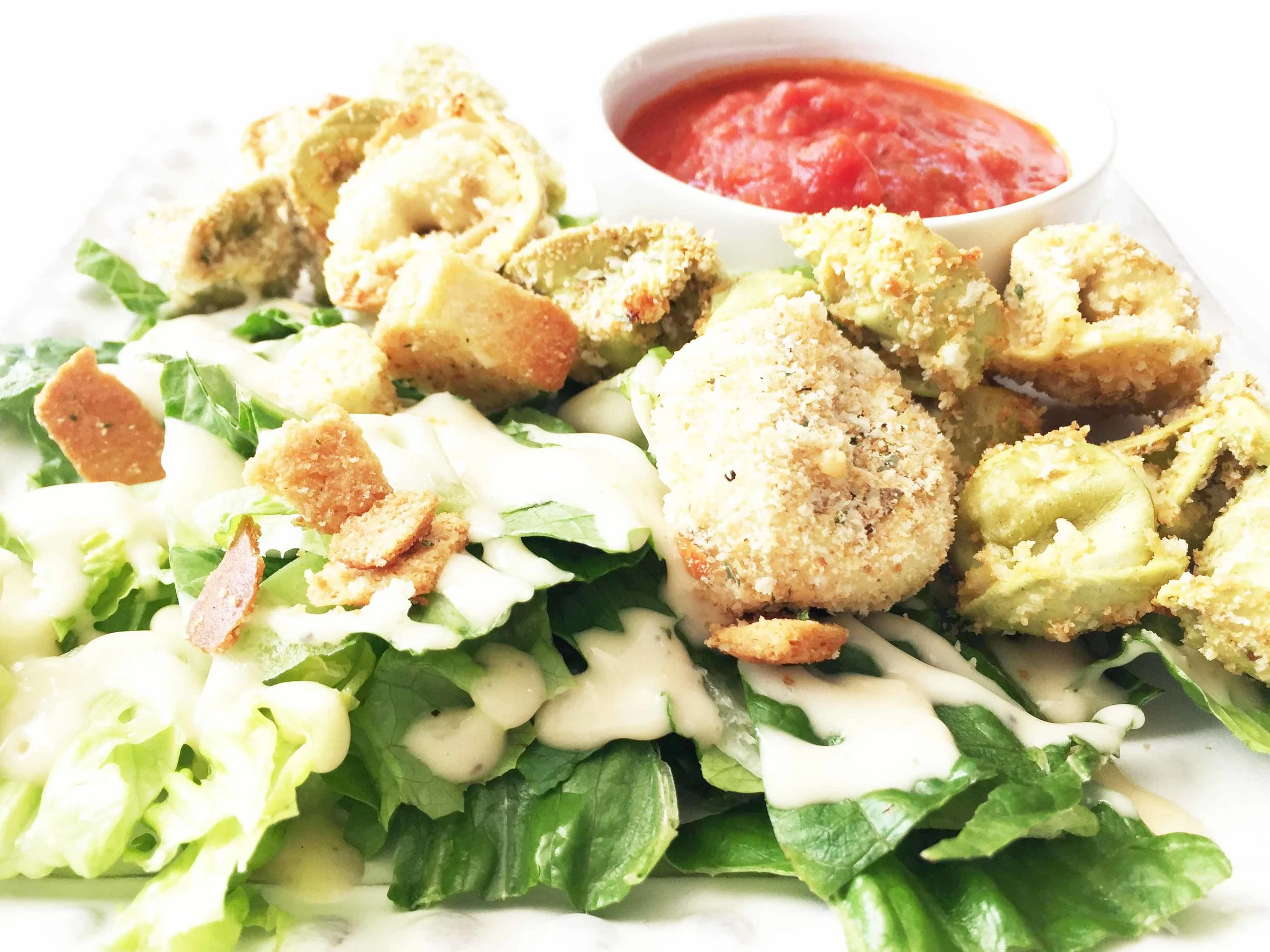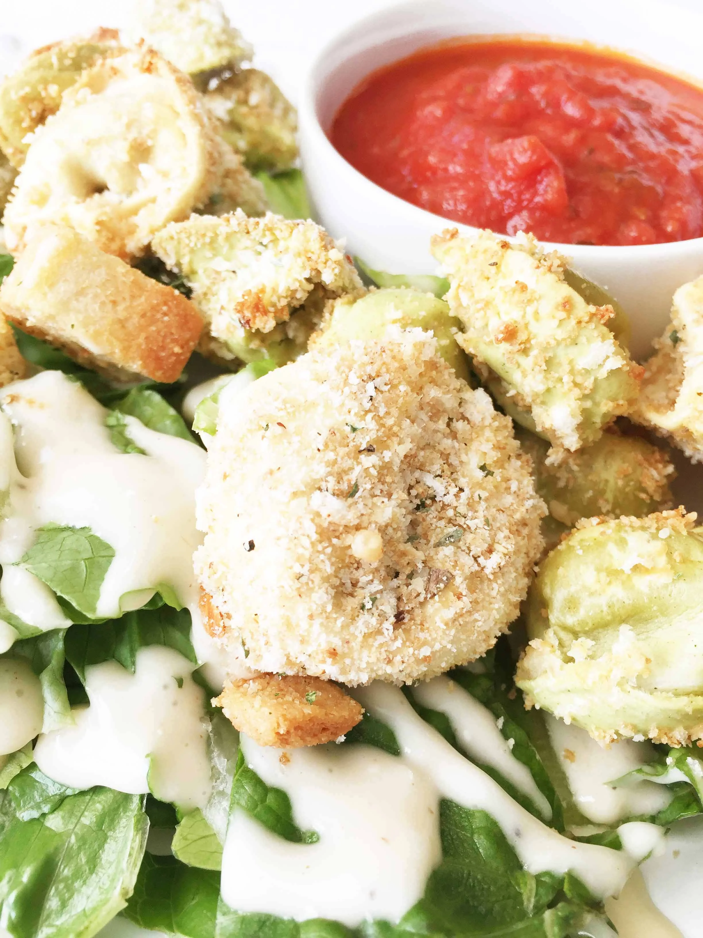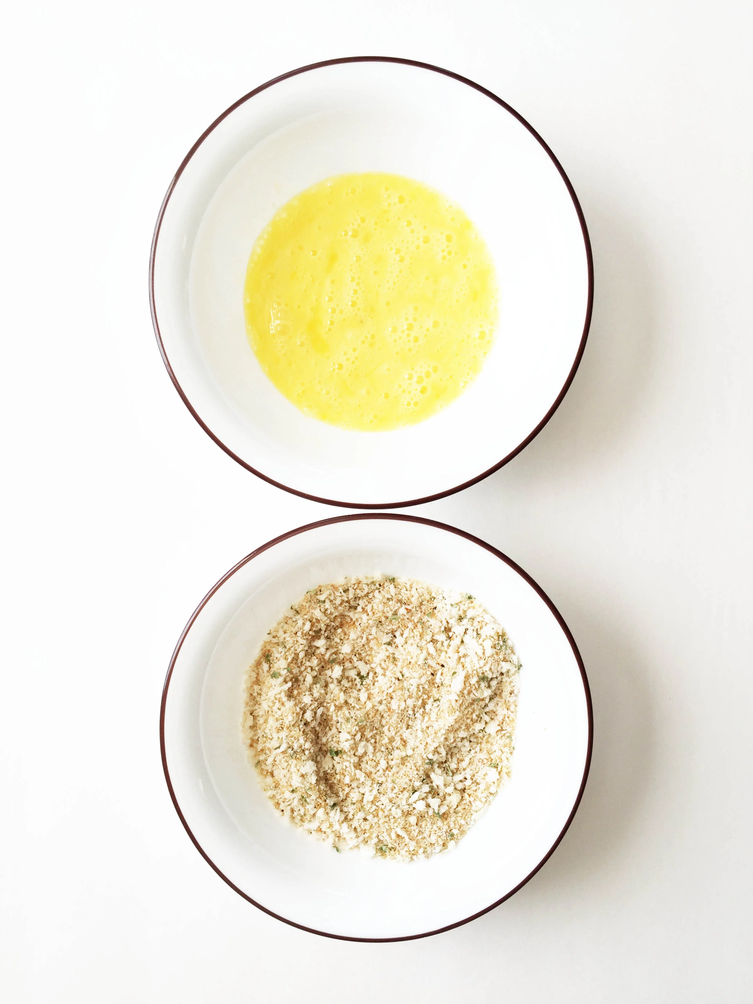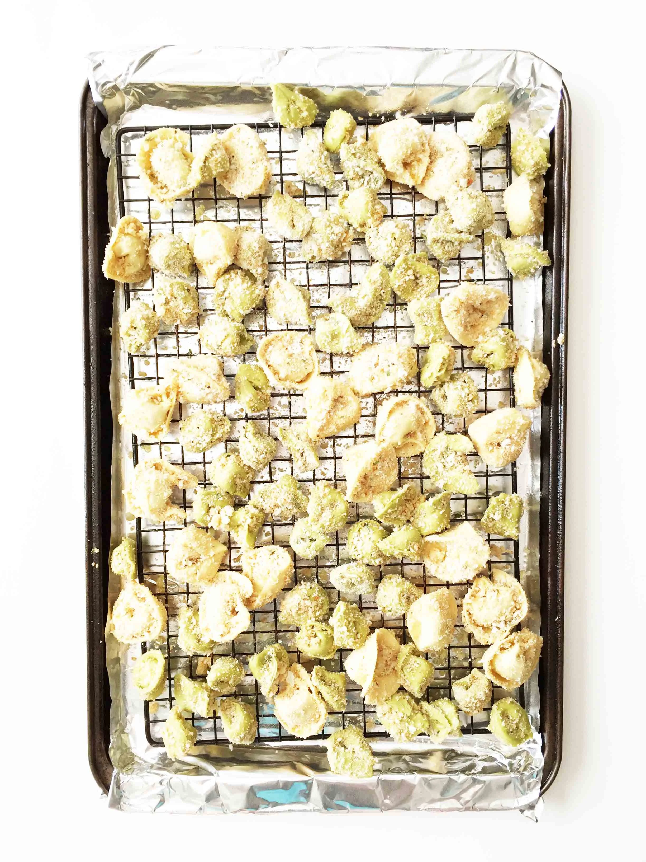 To keep these tortellini bites lightened up, I started with picking up some of my favorite flavors of BUITONI® tortellini; Sweet Italian Sausage, Spinach Cheese, and Mixed Cheese. I then coated the tortellini in egg and dipped them into a breading mixture of panko (for crunch), and plenty of parmesan and whole wheat bread crumbs.
