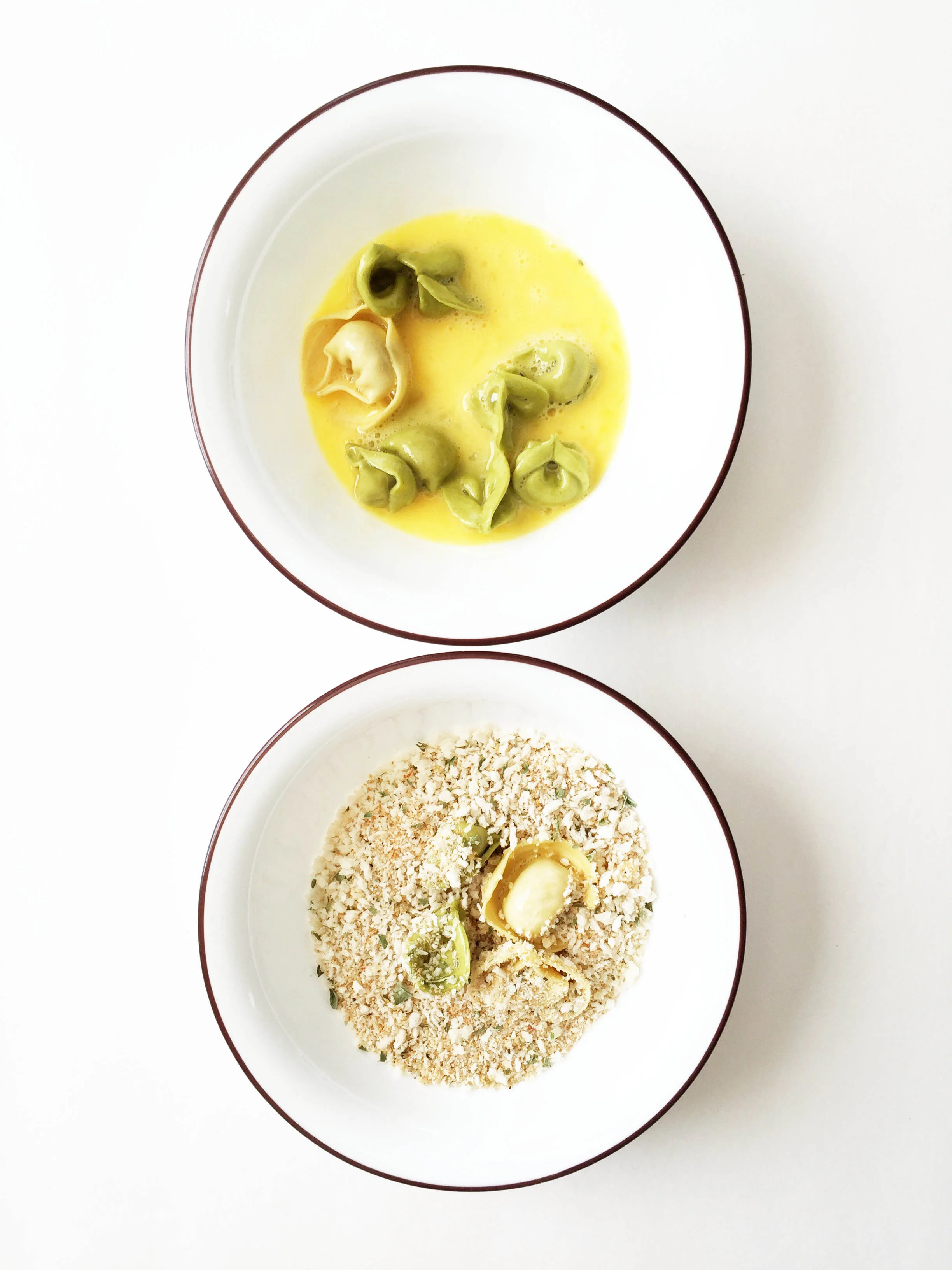 Set up your dredging station with the egg and breading mixture; dipping the tortellini into the egg to coat well before pressing into the breading.