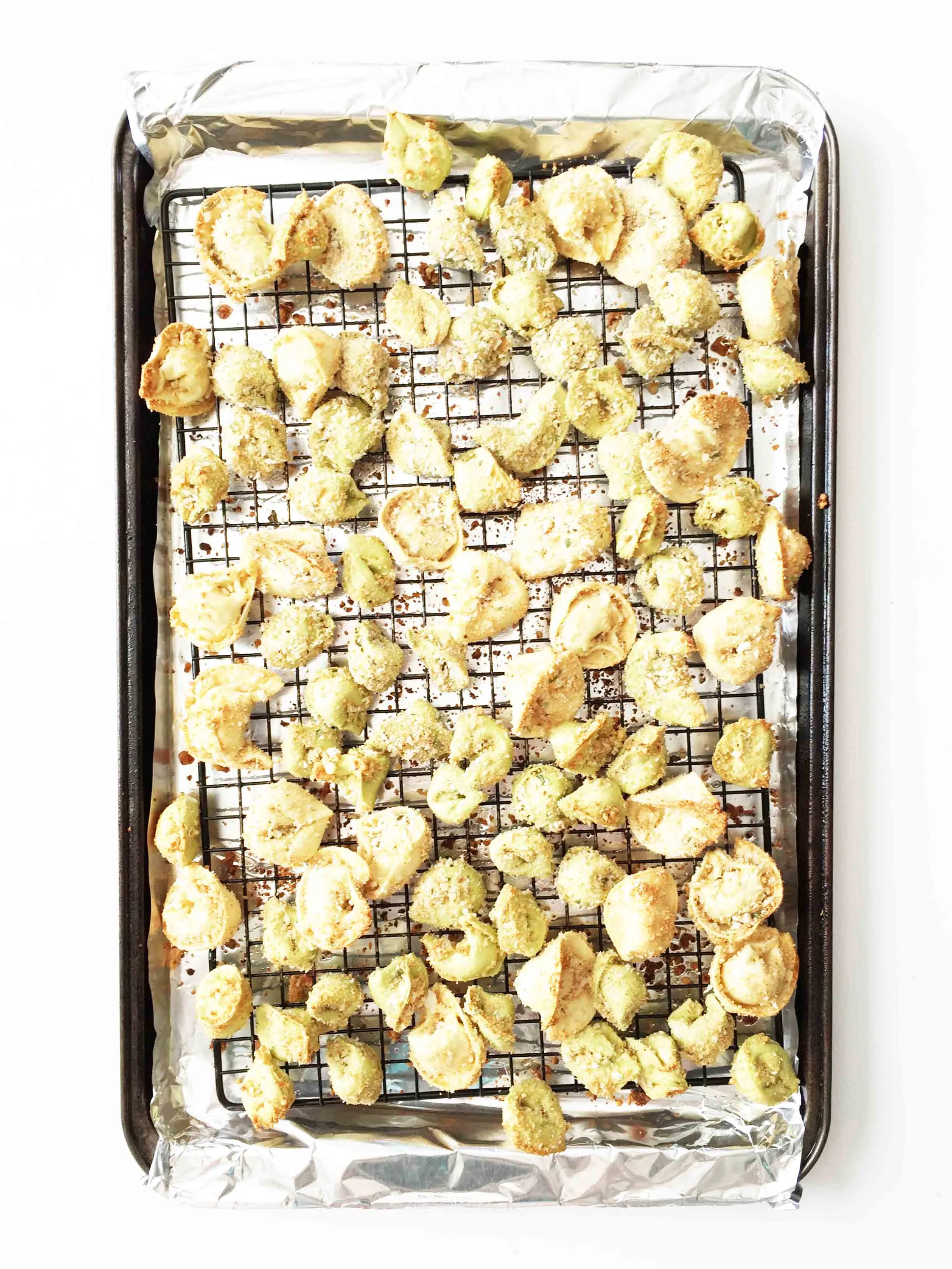 Transfer the tortellini onto the prepared baking sheet and place in the oven to bake for 15-20 minutes or until the edges of the tortellini are starting to brown and crisp.