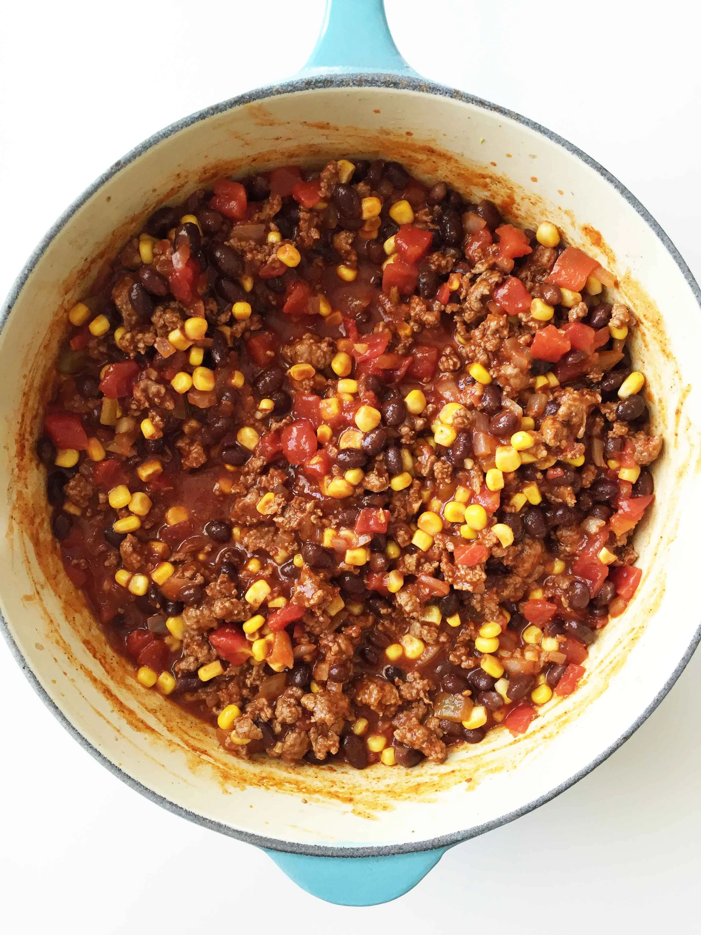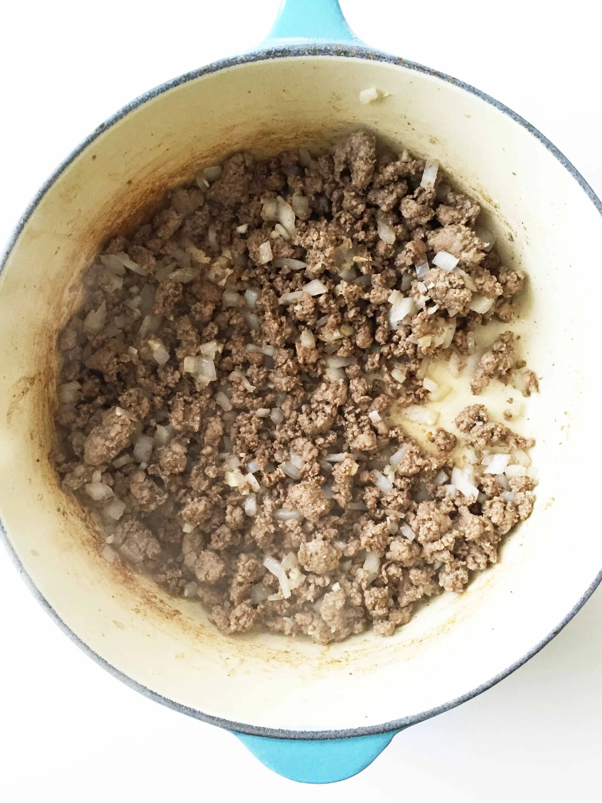 Cook the 1 lb. ground beef, onion and garlic in a large non-stick pan until the ground beef browned and the onion is tender; drain any excess liquid from the pan.