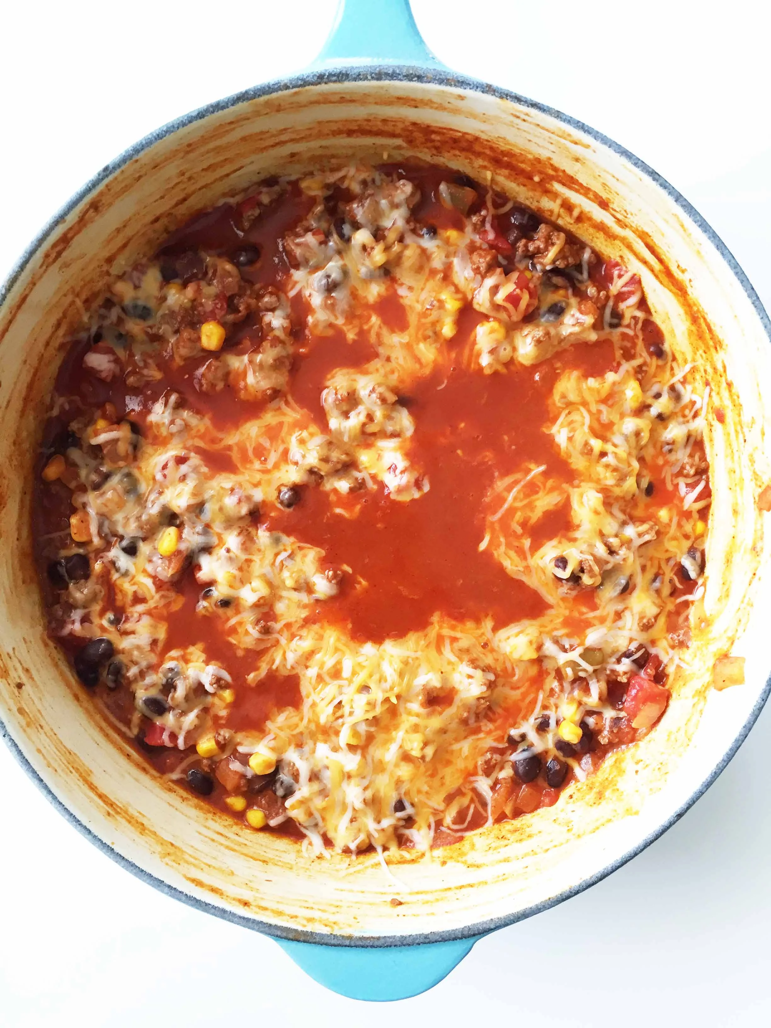 Add the 2 C. red enchilada sauce, corn, Rosaria Premium Seasoned Black Beans, and RO*TEL. Bring the mixture to a boil and simmer on medium heat for 3-5 minutes or until the sauce starts to thicken.