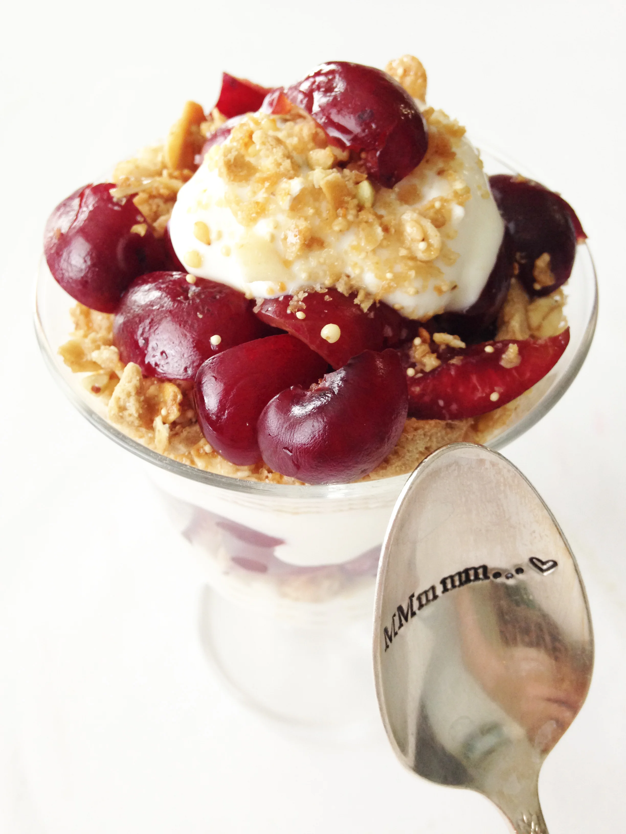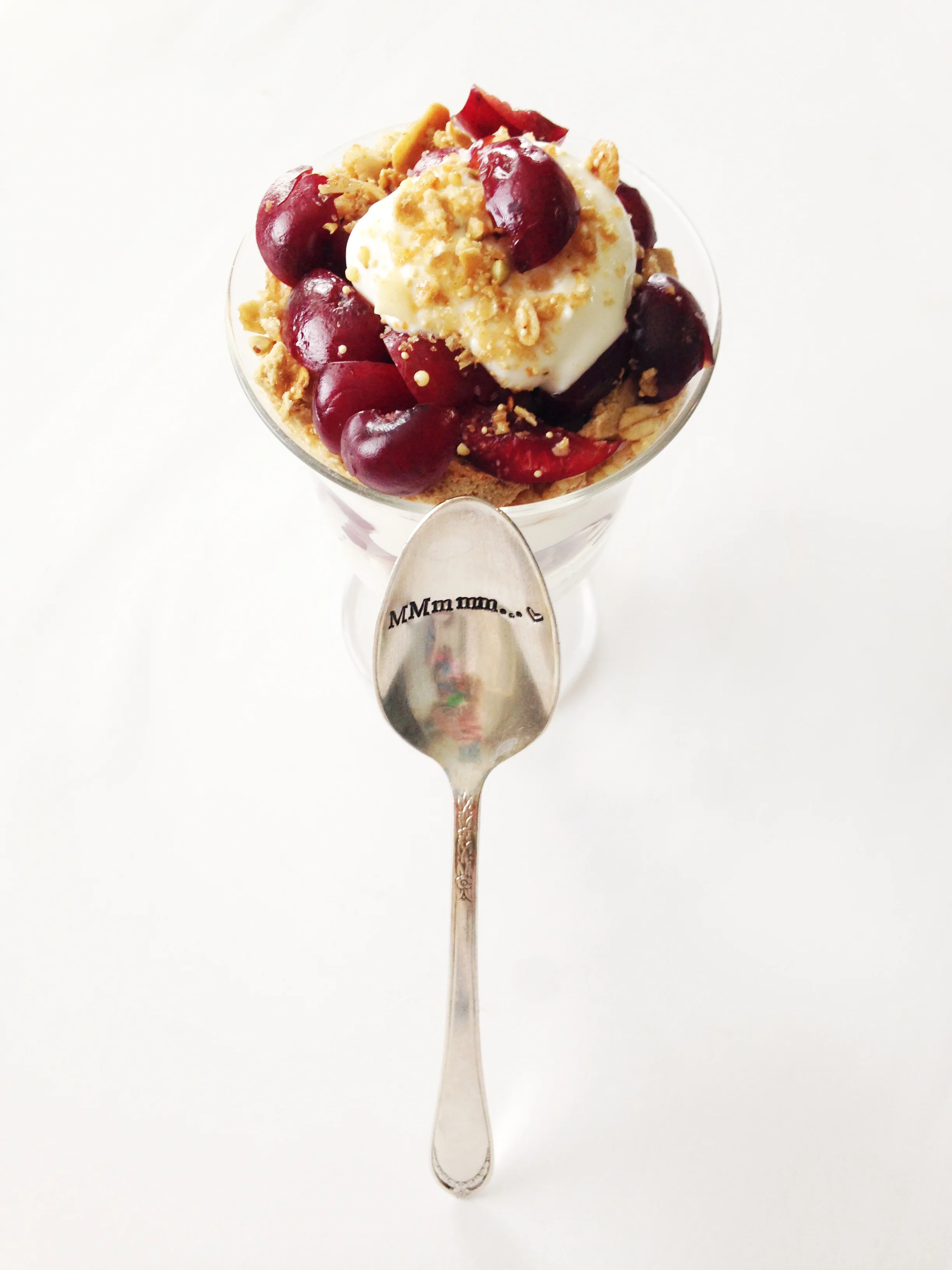 I've given the greek yogurt here a bit of an upgrade by adding a wedge of laughing cow cream cheese spread to it, giving it that cheesecake flavor while remaining guiltless. And since it's cherry season, I took advantage and used fresh cherries rather than anything out of a can. Good. Stuff.