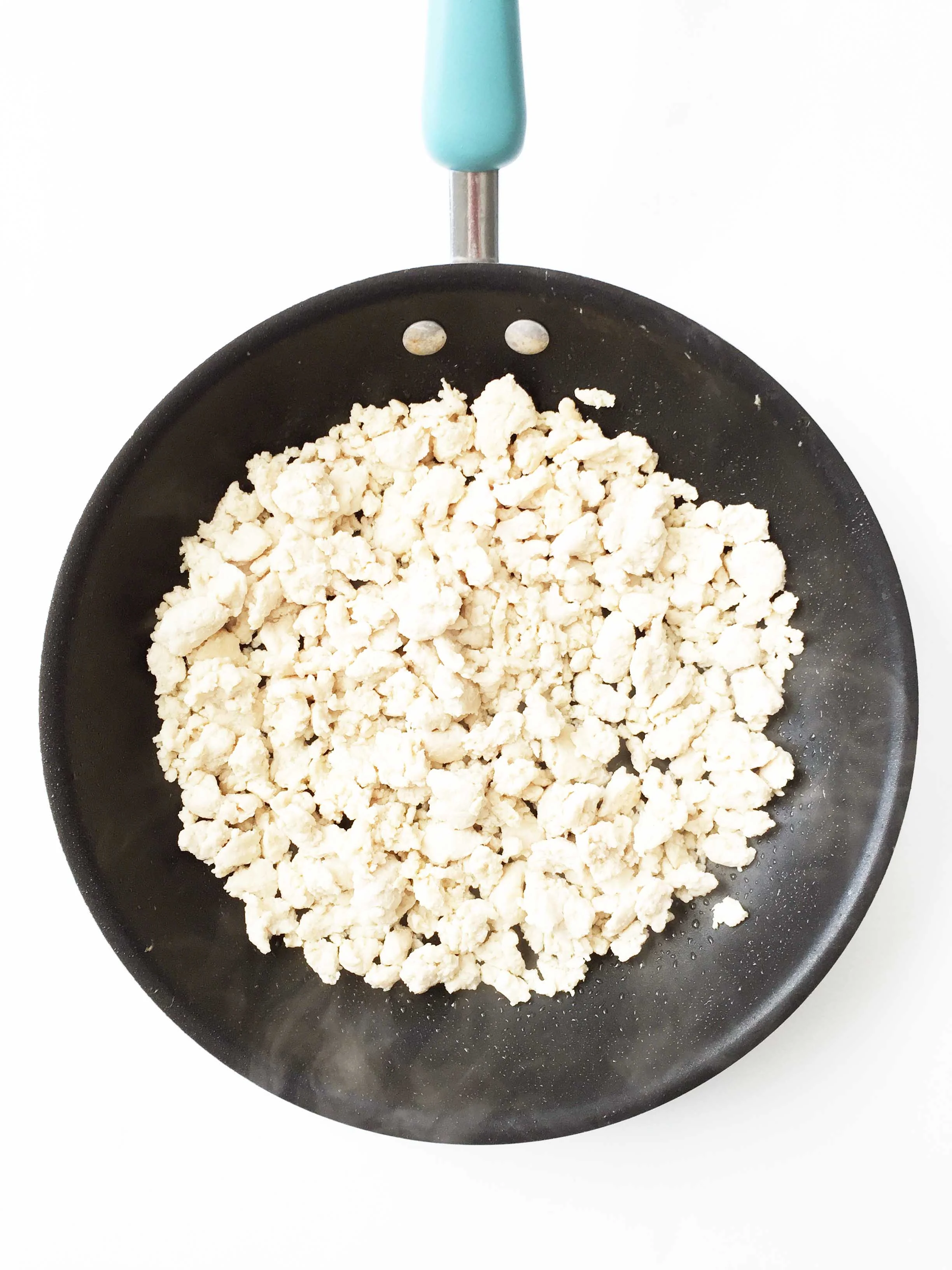 Add in the 1 Tsp. Extra Virgin Olive Oil and 1 Lb. Ground Chicken Breast to cook.