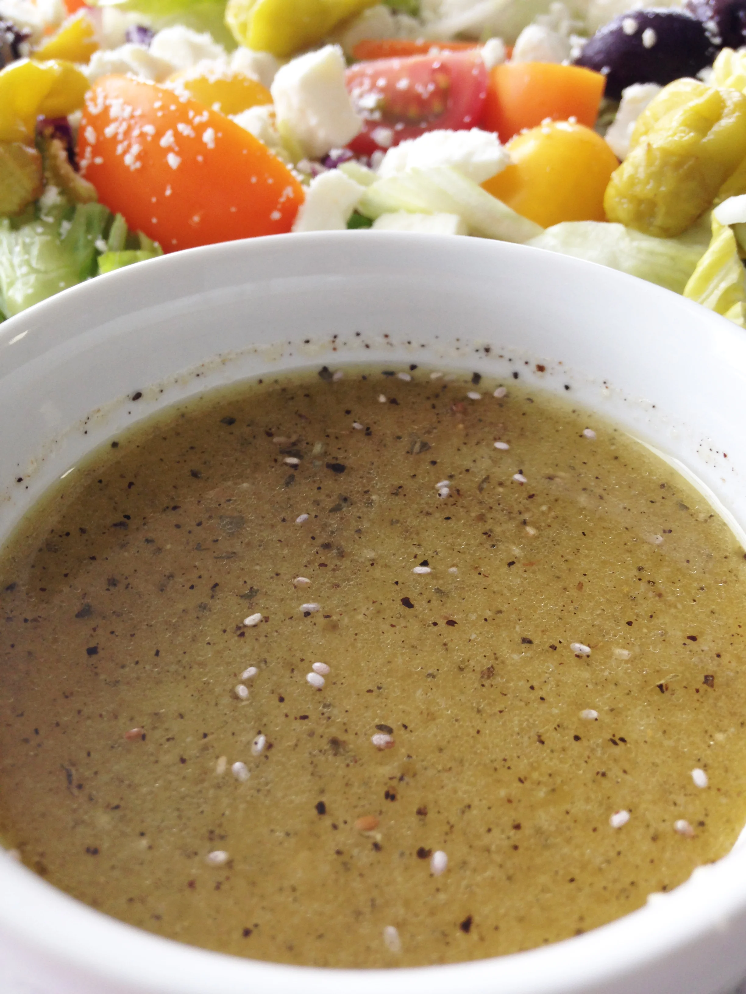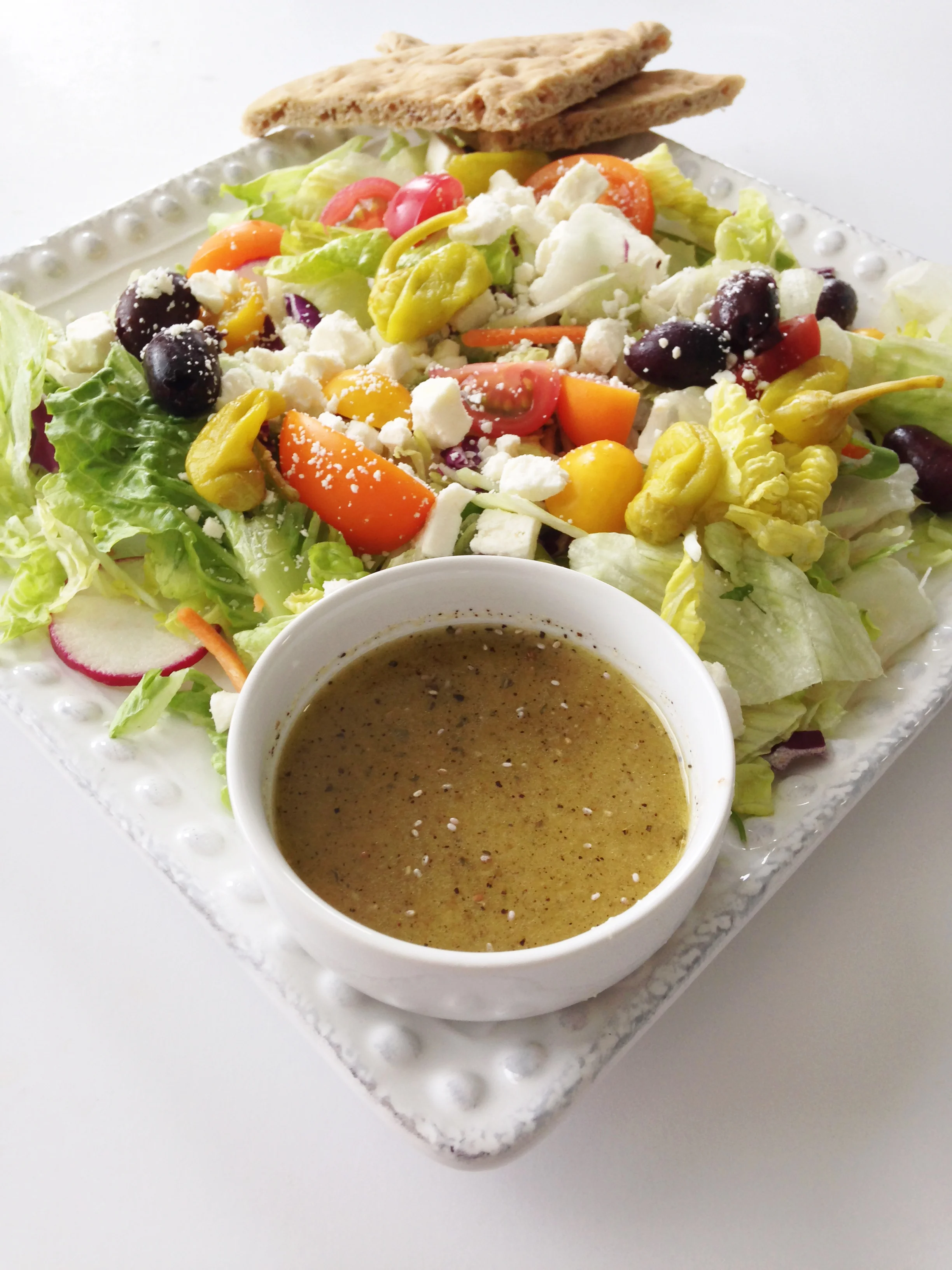 I put my dressing over a nice greek salad and served it with a side of pita bread and some yummy hummus, but this vinaigrette would make for a great marinade for chicken too!