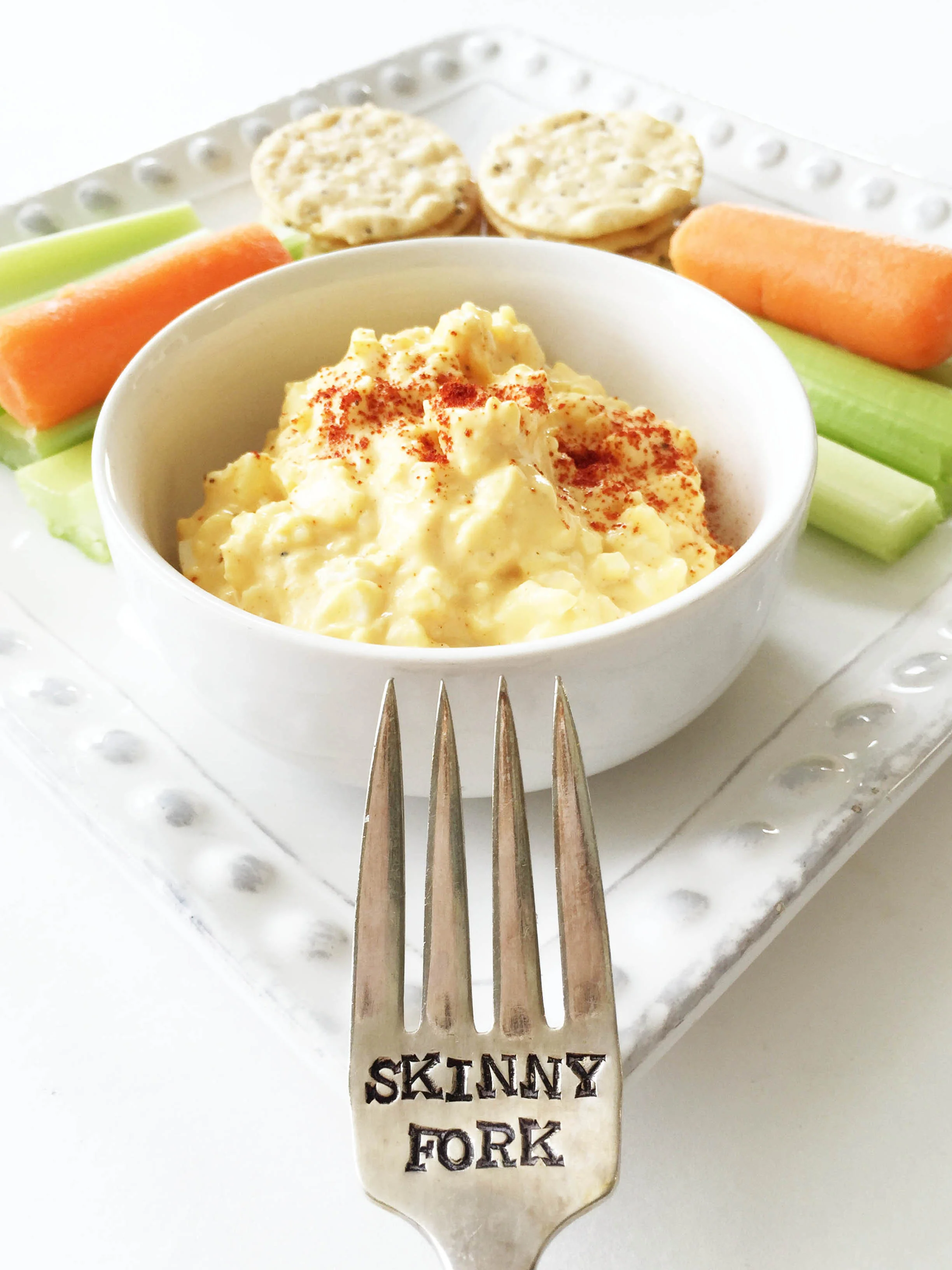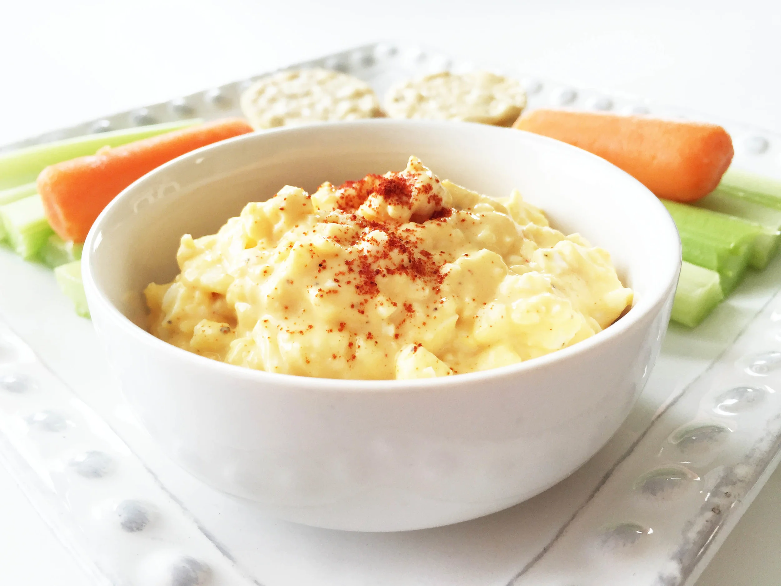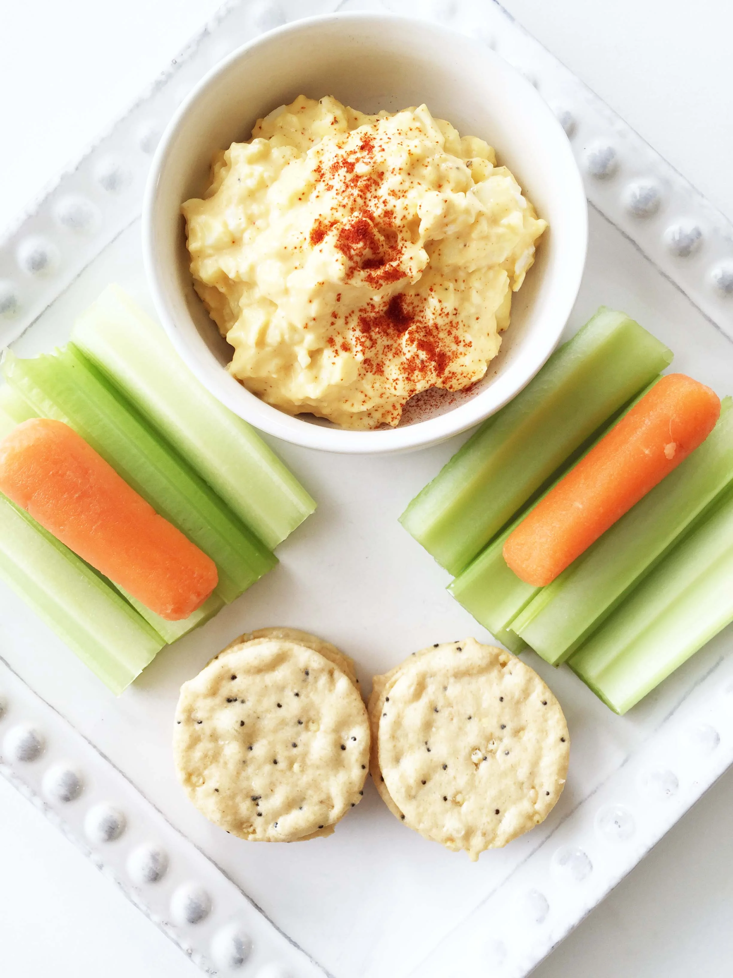 To serve this egg salad as a snack, I added a few cuts of fresh celery, baby carrots, and some almond crackers. It's easy, it's fast, and it's super healthy. One of the best parts is that you can pack this up and take it as a grab-n-go wholesome snack when you're on the run during a busy day.