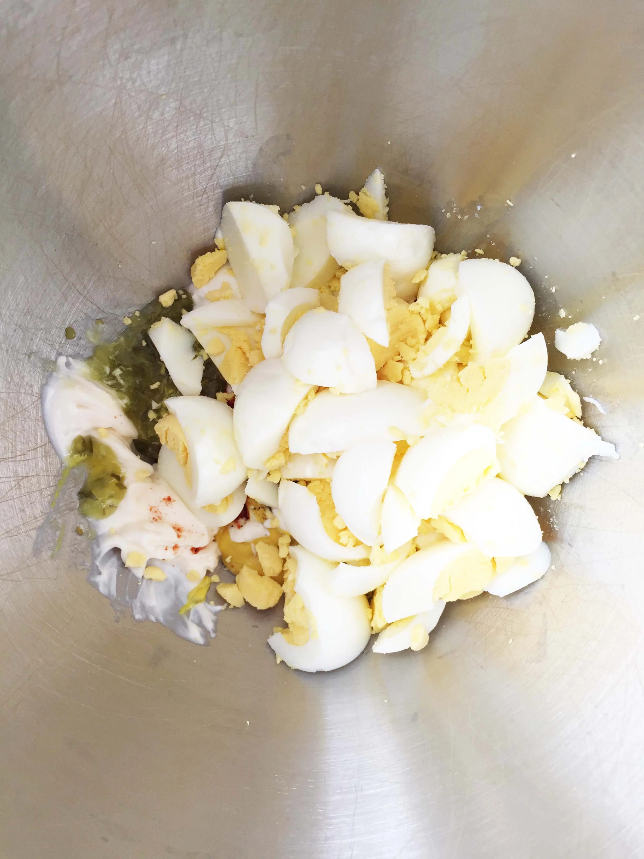 Combine the eggs, yogurt, mayonnaise, mustard, relish, and paprika together.