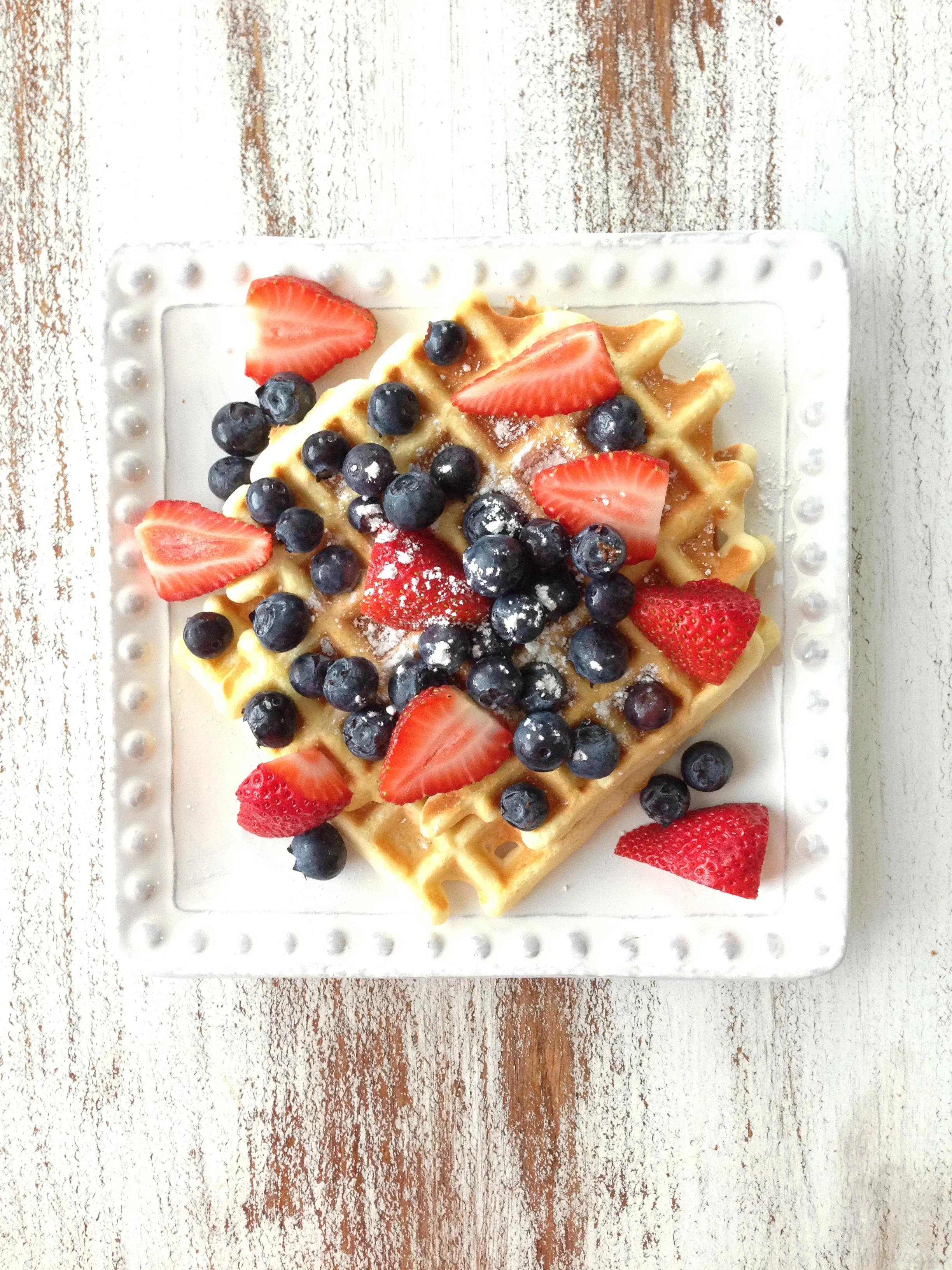 Plate the finished waffles and top with about 1 1/2 tbsp. strawberries, 1 1/2 tbsp. blueberries and a squeeze of fresh lemon juice. Dust with some powdered sugar if desired. Ta-da!