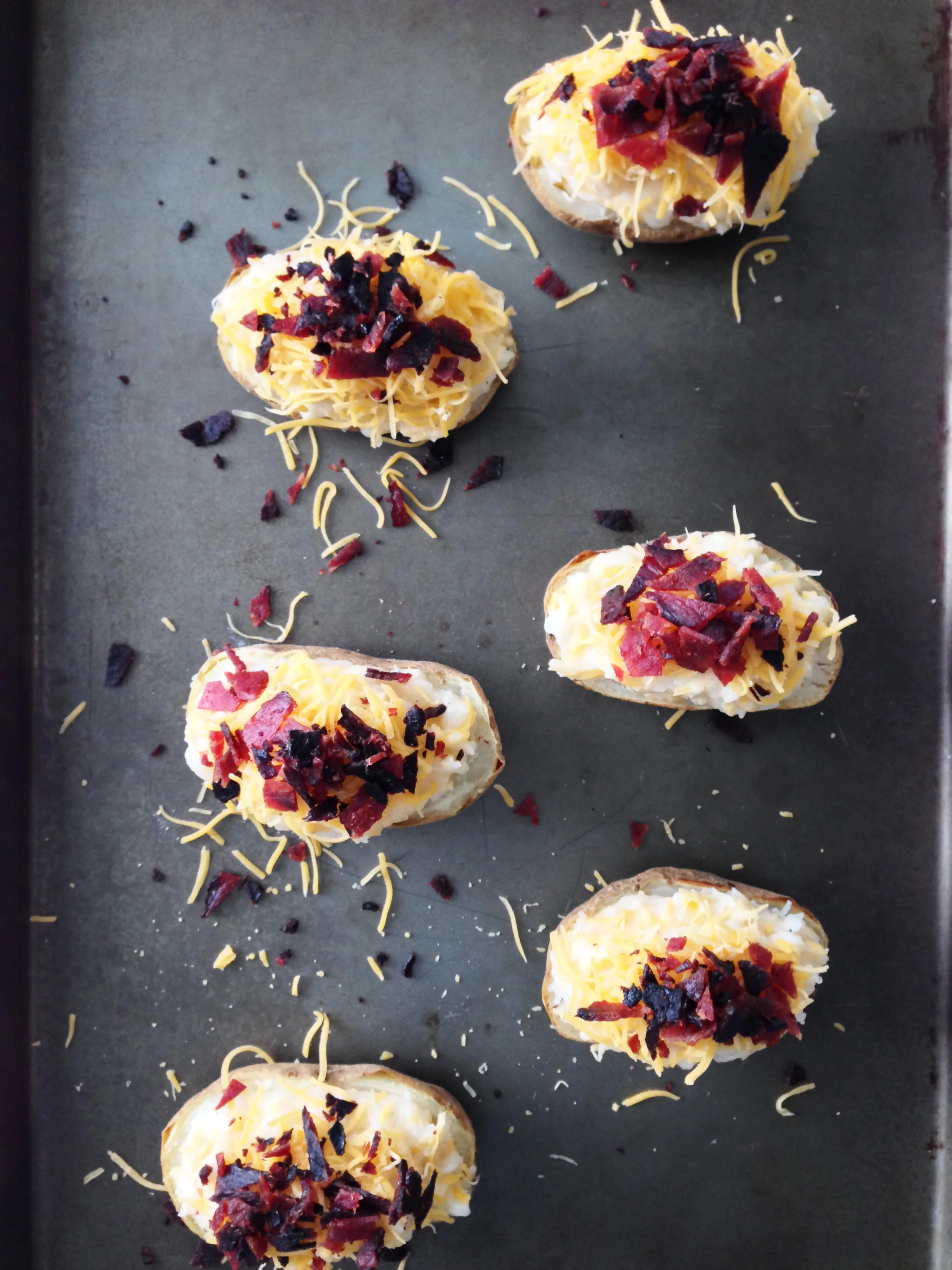 He had no idea that these loaded spuds were full of another sneaky veggie... cauliflower! Muahahaha! That's my 'evil' cackle there.