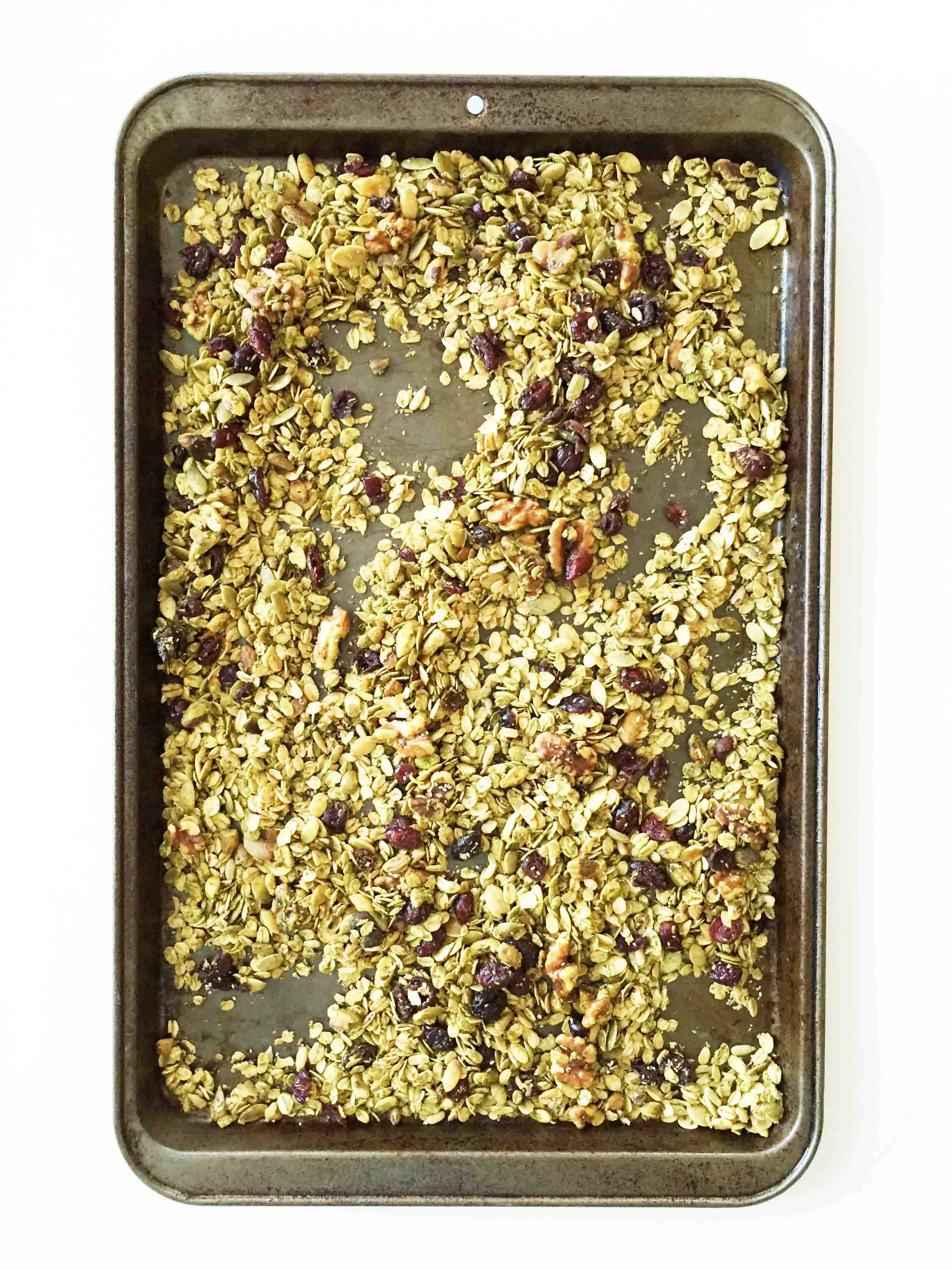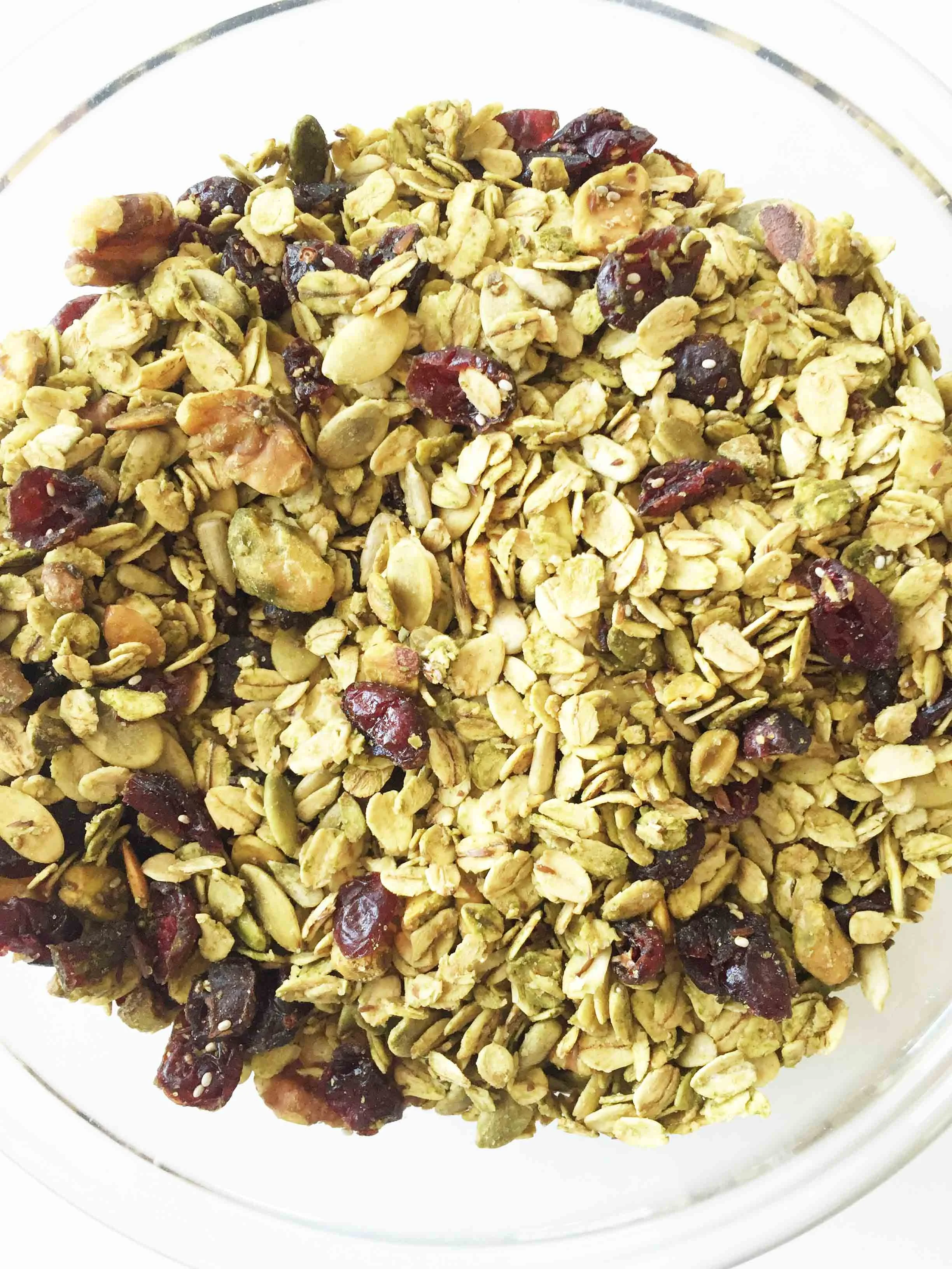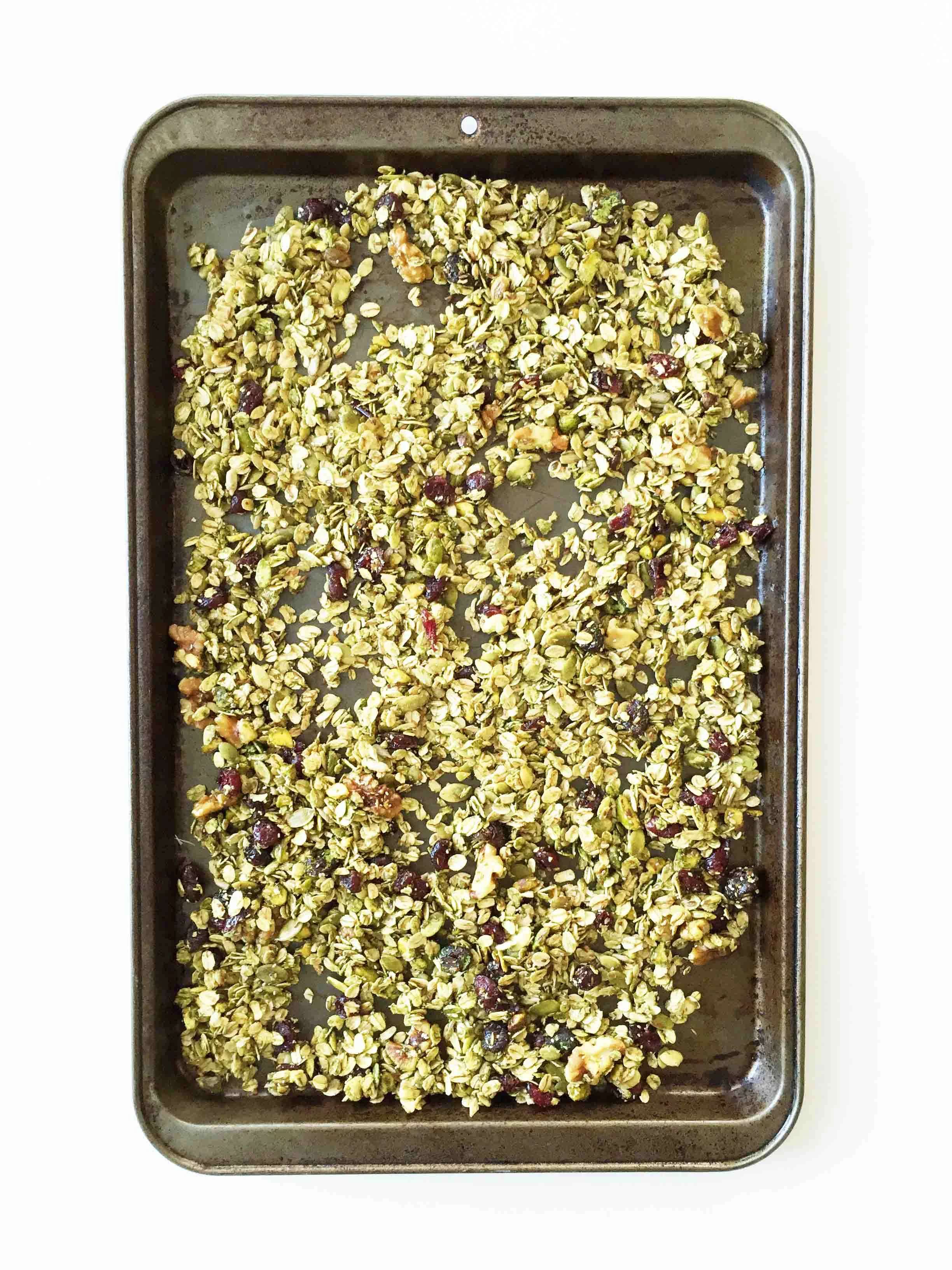This batch of granola turned out pretty amazing. I wanted to use the bright red cranberries to stand out among the green tint of the matcha powder, but really you could use any dried berry that you enjoy most.