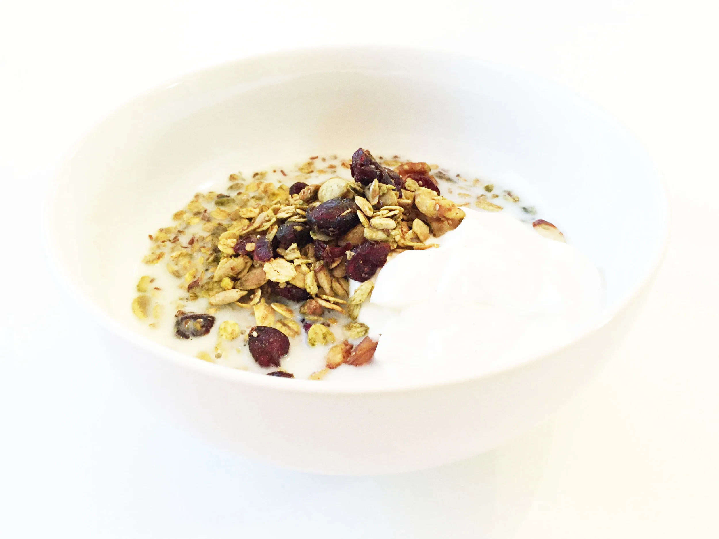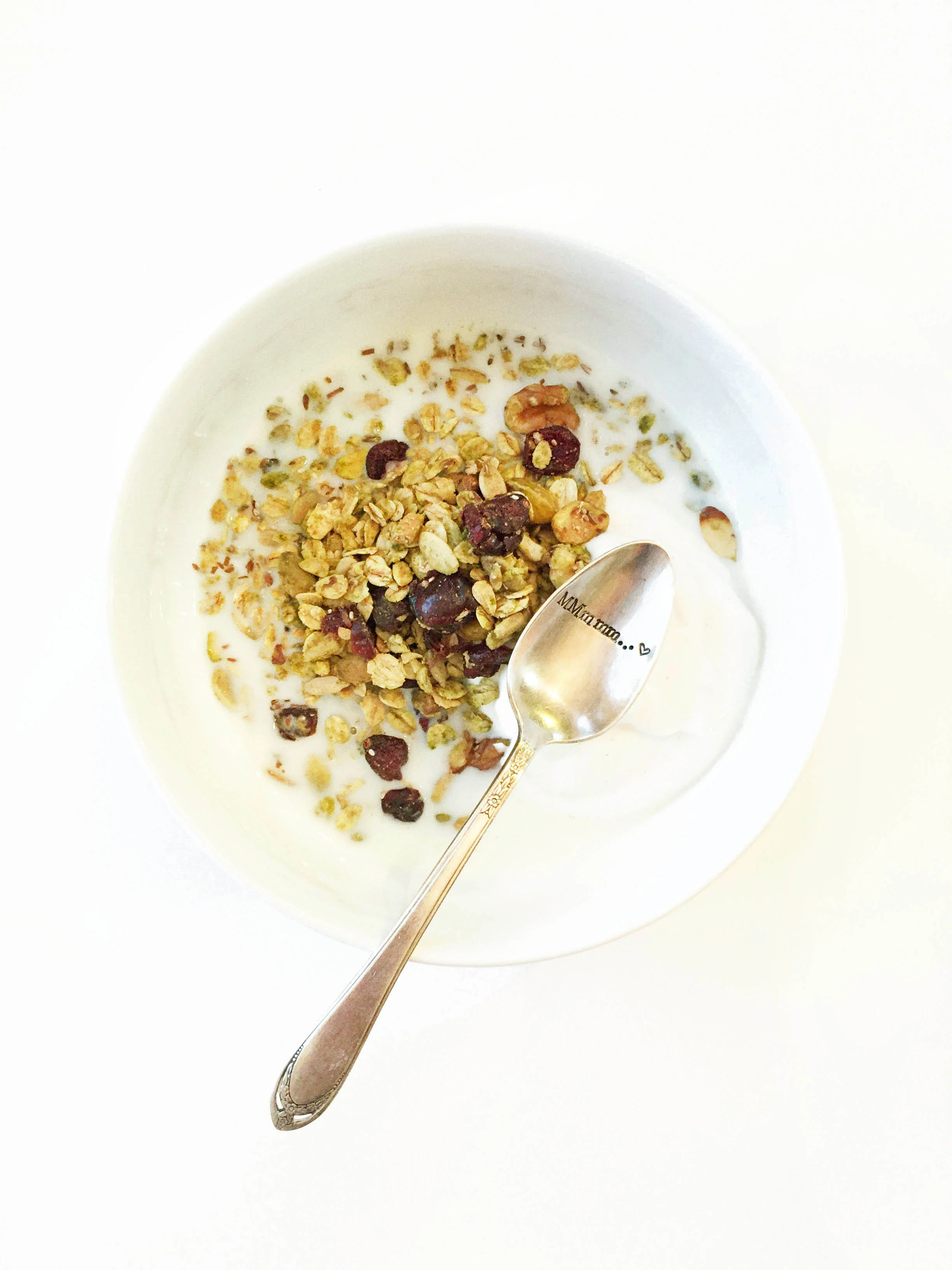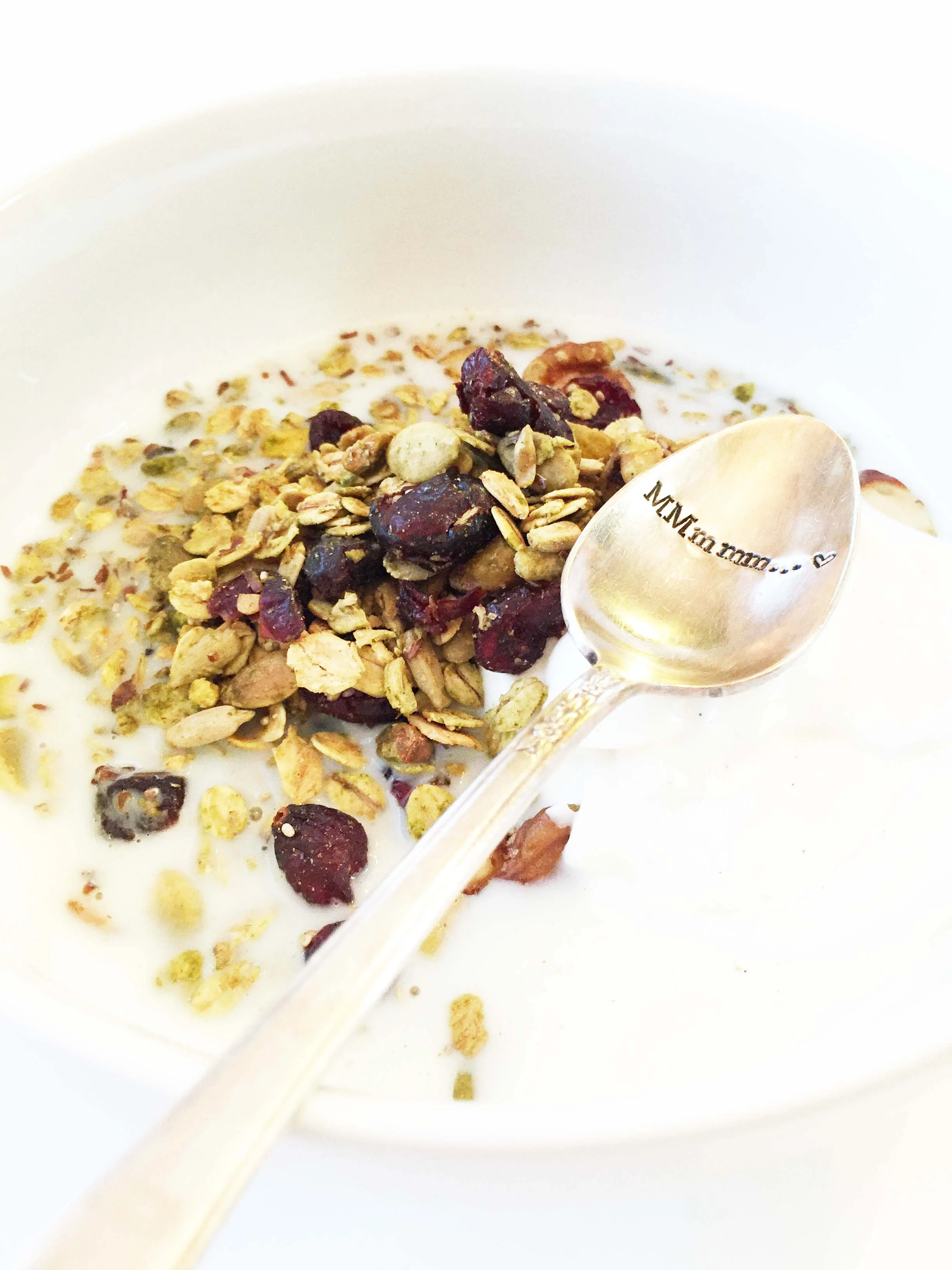 This batch of granola turned out pretty amazing. I wanted to use the bright red cranberries to stand out among the green tint of the matcha powder, but really you could use any dried berry that you enjoy most.