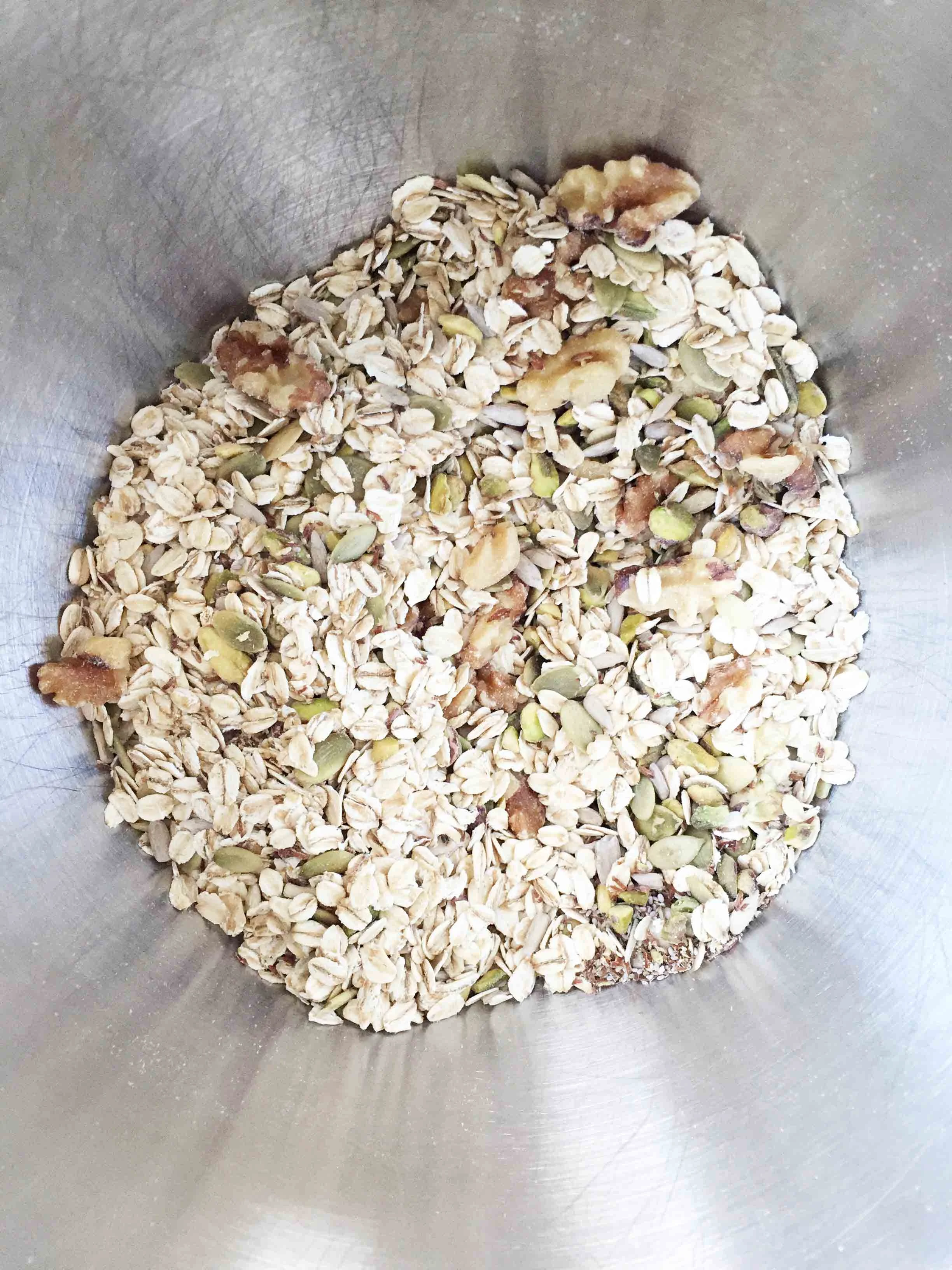 Combine the 3 C. oats, 1 C. nuts, and 1 C. seeds together in a large bowl; set aside.