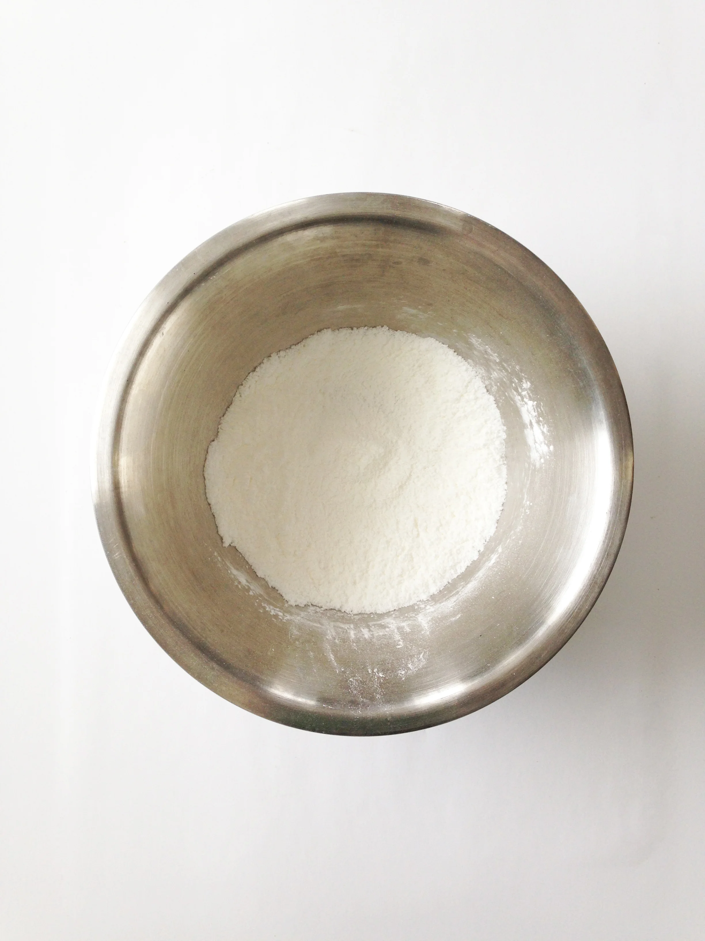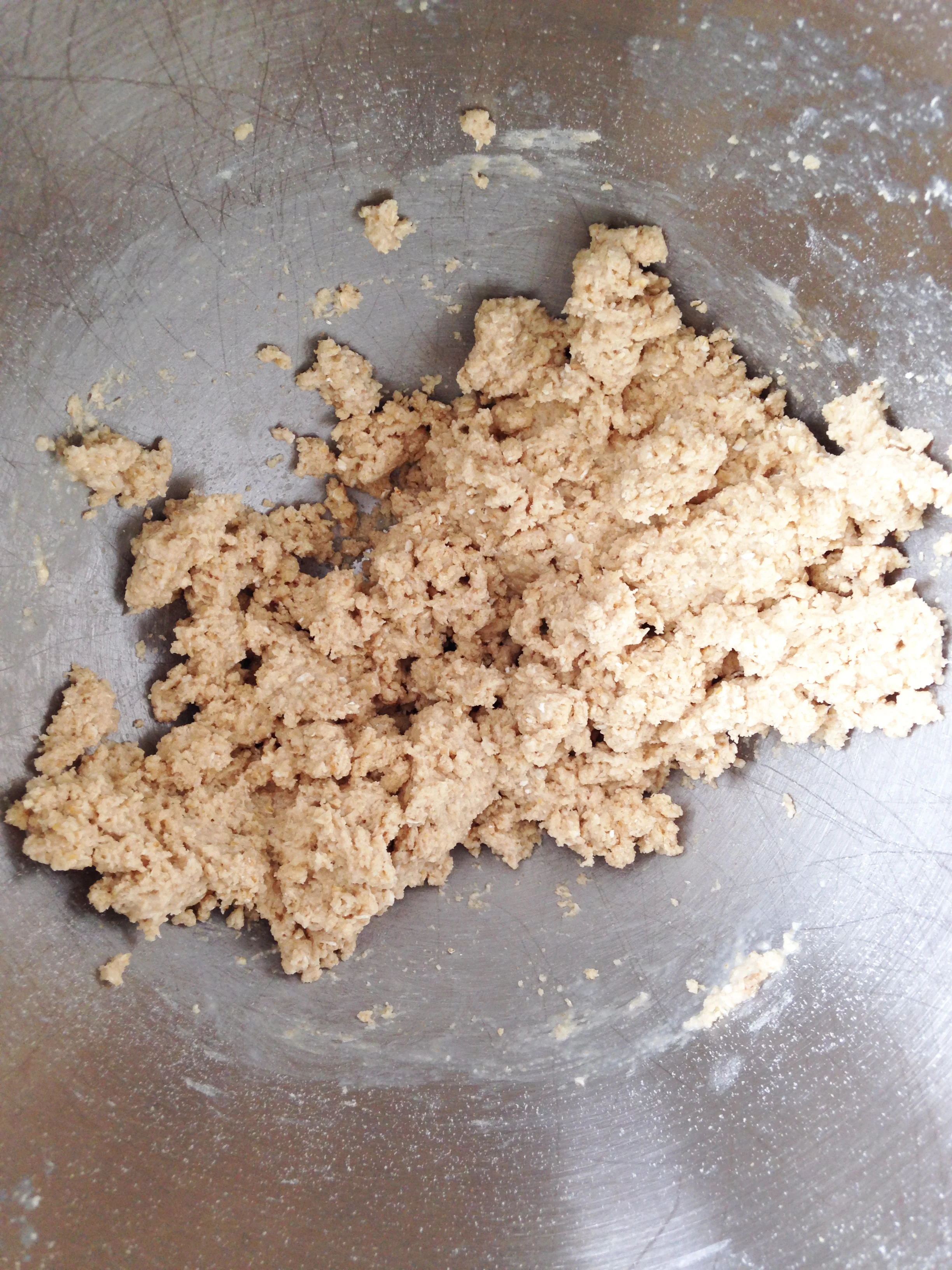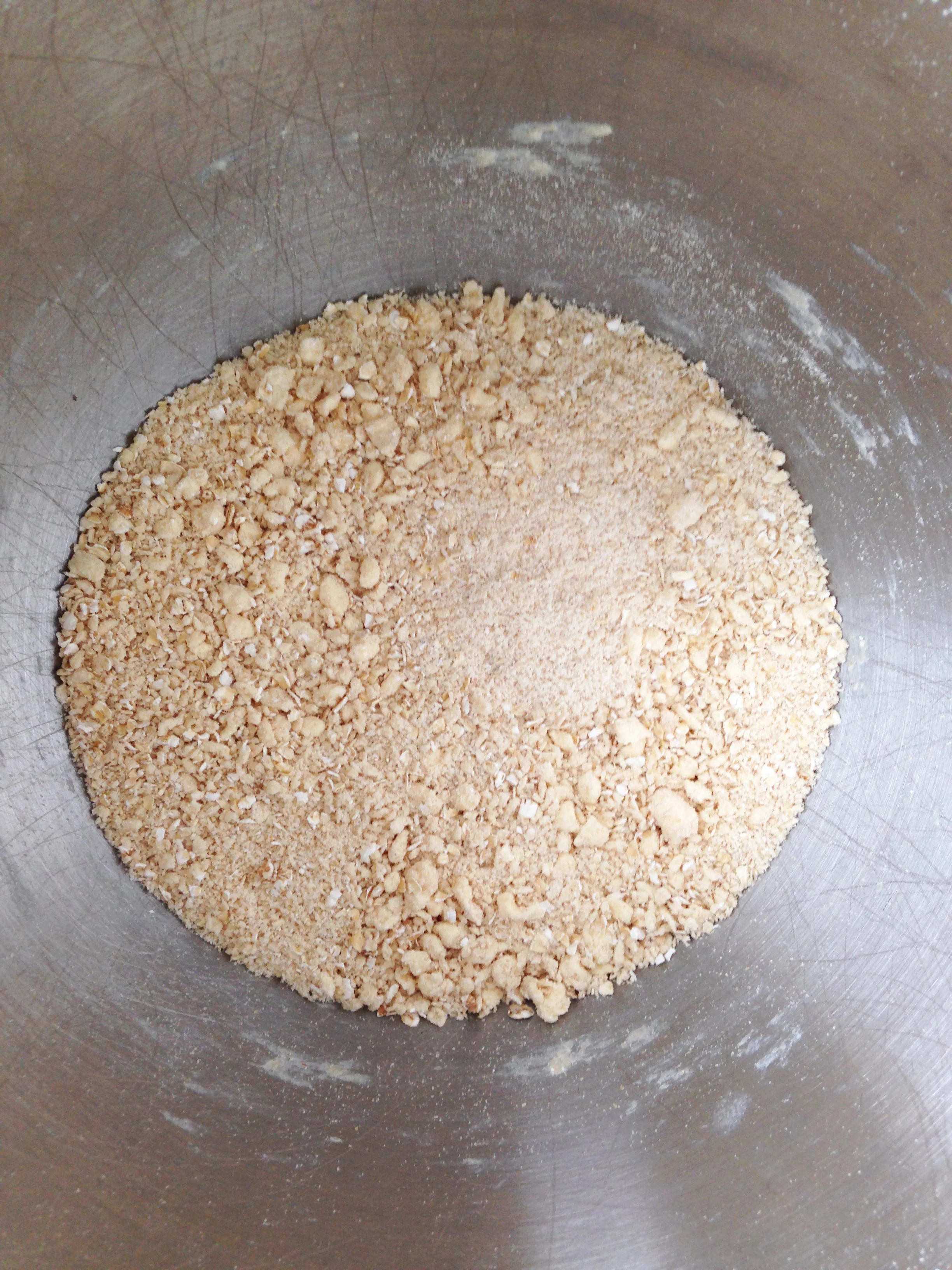 Whisk the flours, oats, sugar, sweetener, baking powder and salt together. Add in the butter and combine until starting to form a grainy texture.