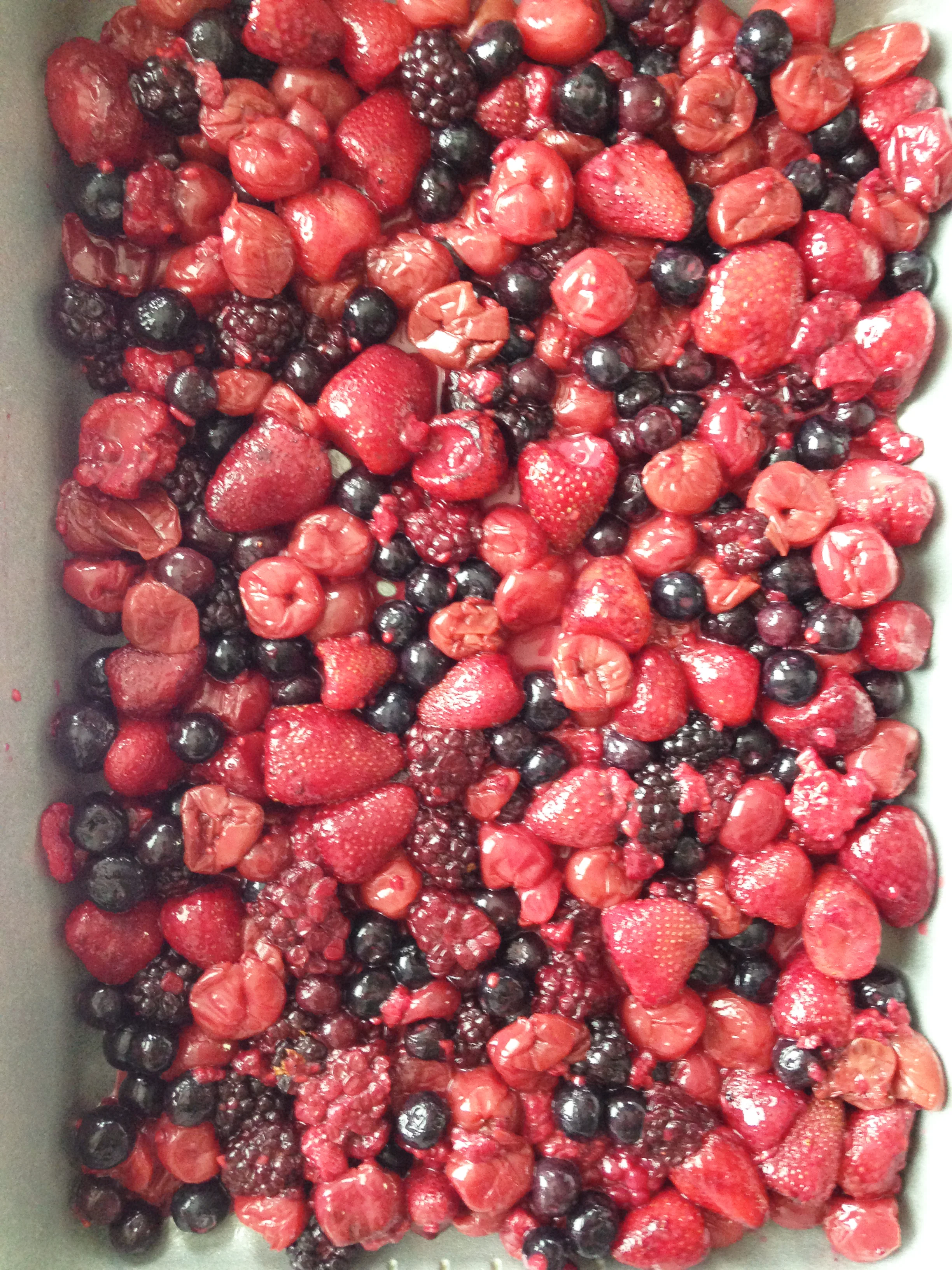 7 C. Mixed Berries (I used frozen-thawed, cherries, black-blue-raspberries, and strawberries.)