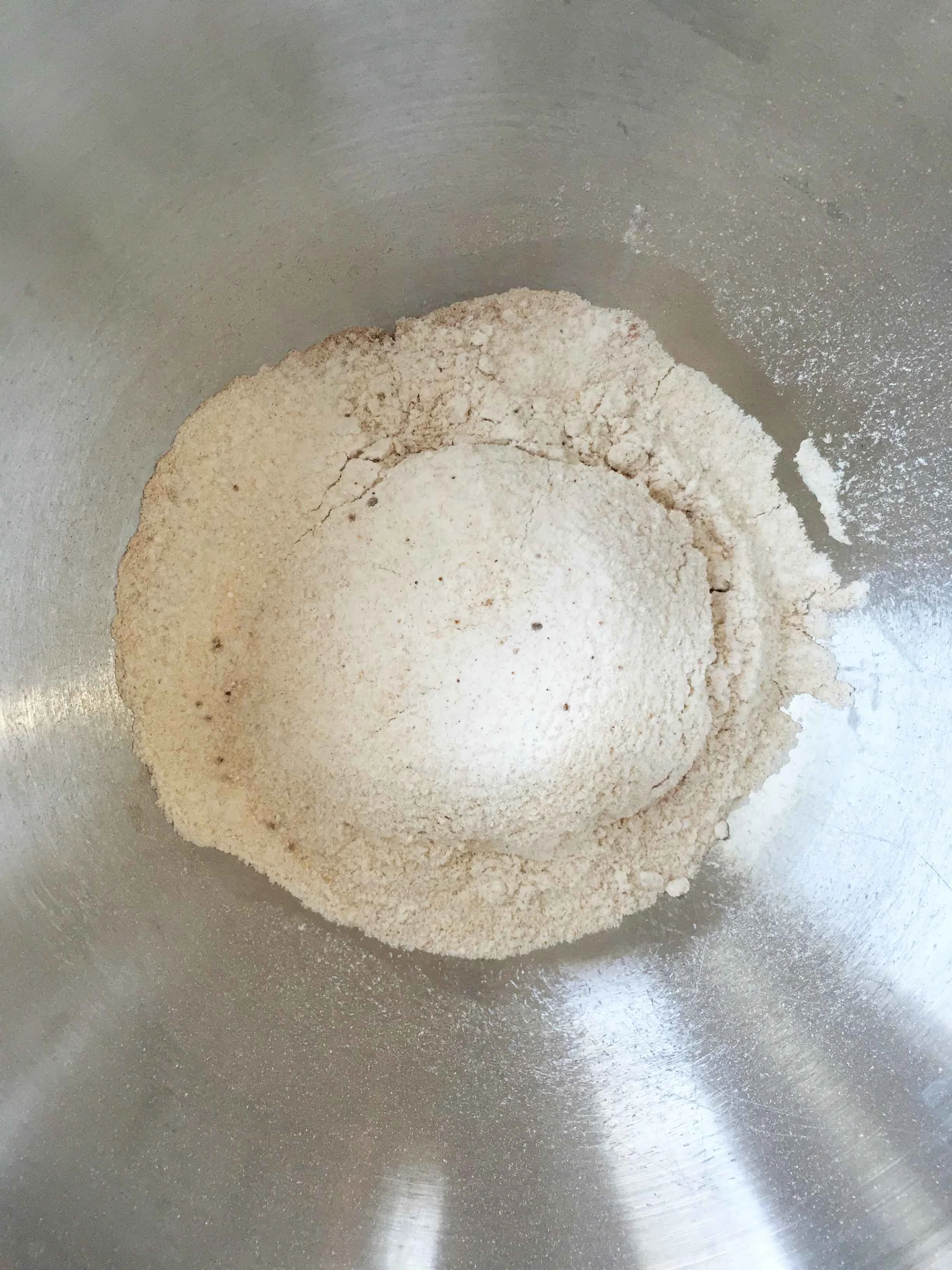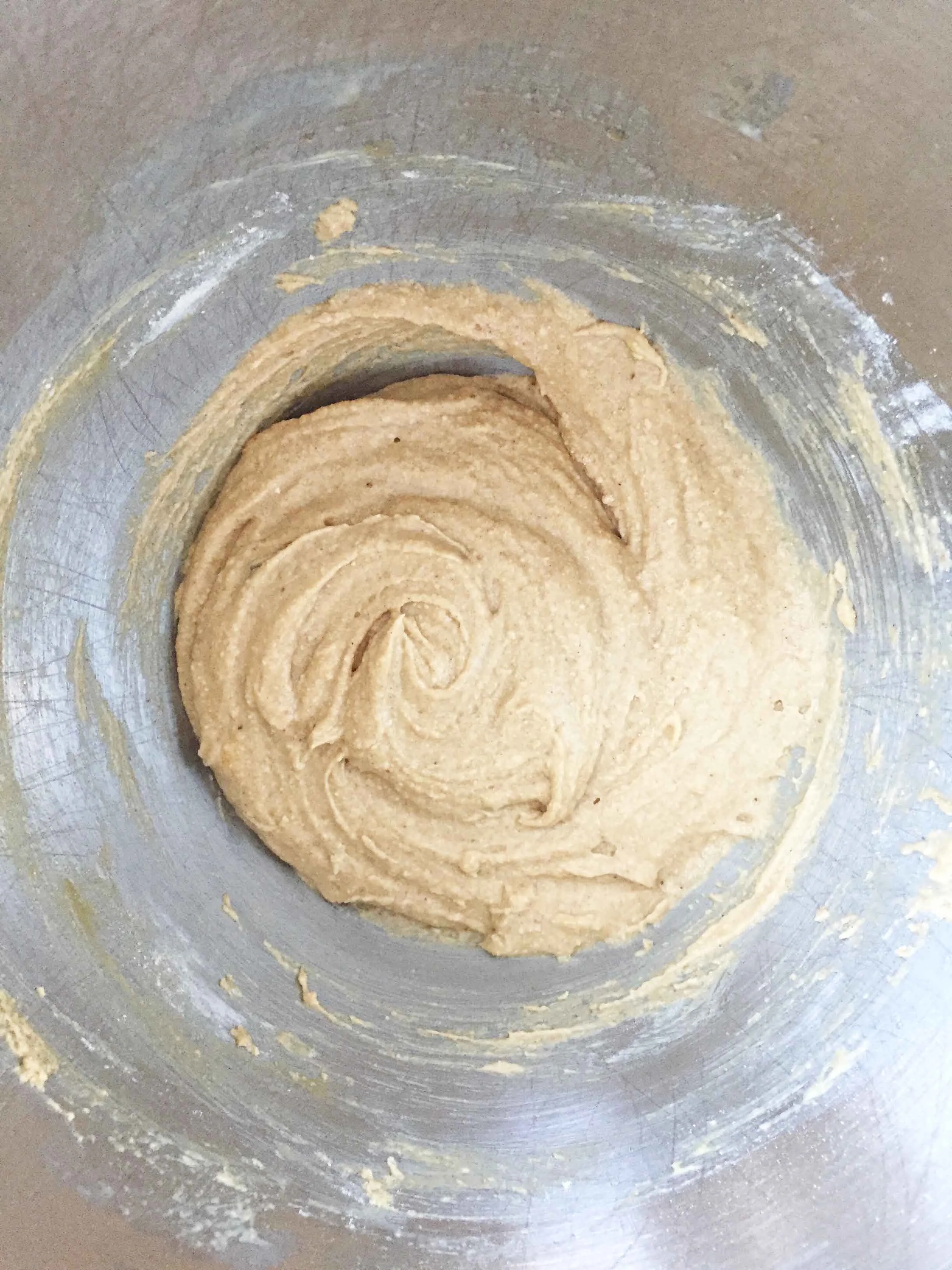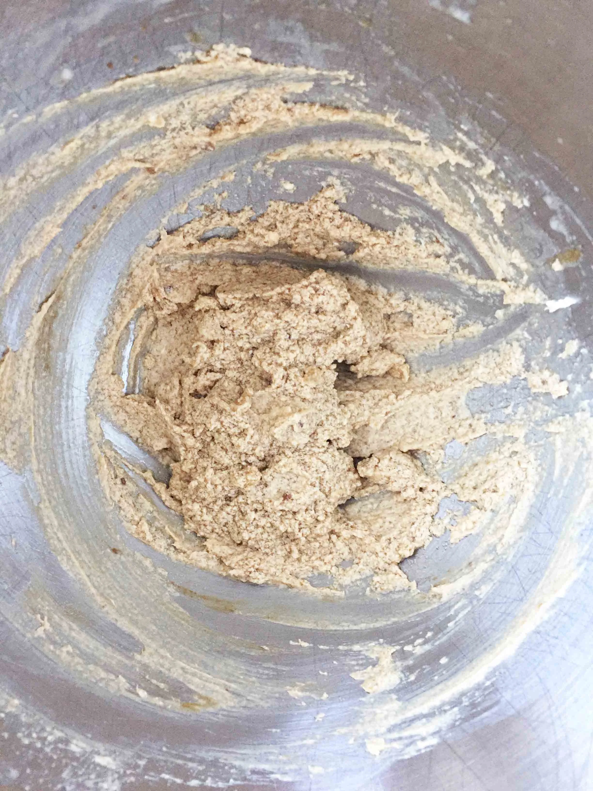 Sift 1/2 C. flour, 1/2 C. white wheat flour, 1/2 Tsp. baking powder, 1/4 tsp. nutmeg, and 1/4 tsp. cinnamon into a medium bowl together; side aside as well.