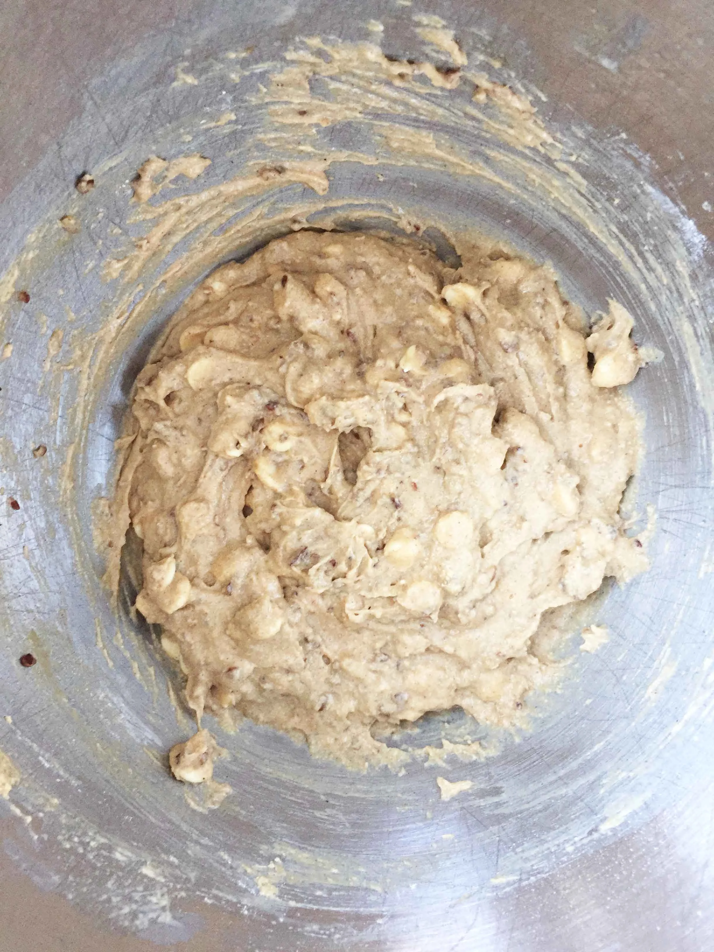 Fold in the 1/3 C. pecan pieces and 2/3 C. white chocolate chips.