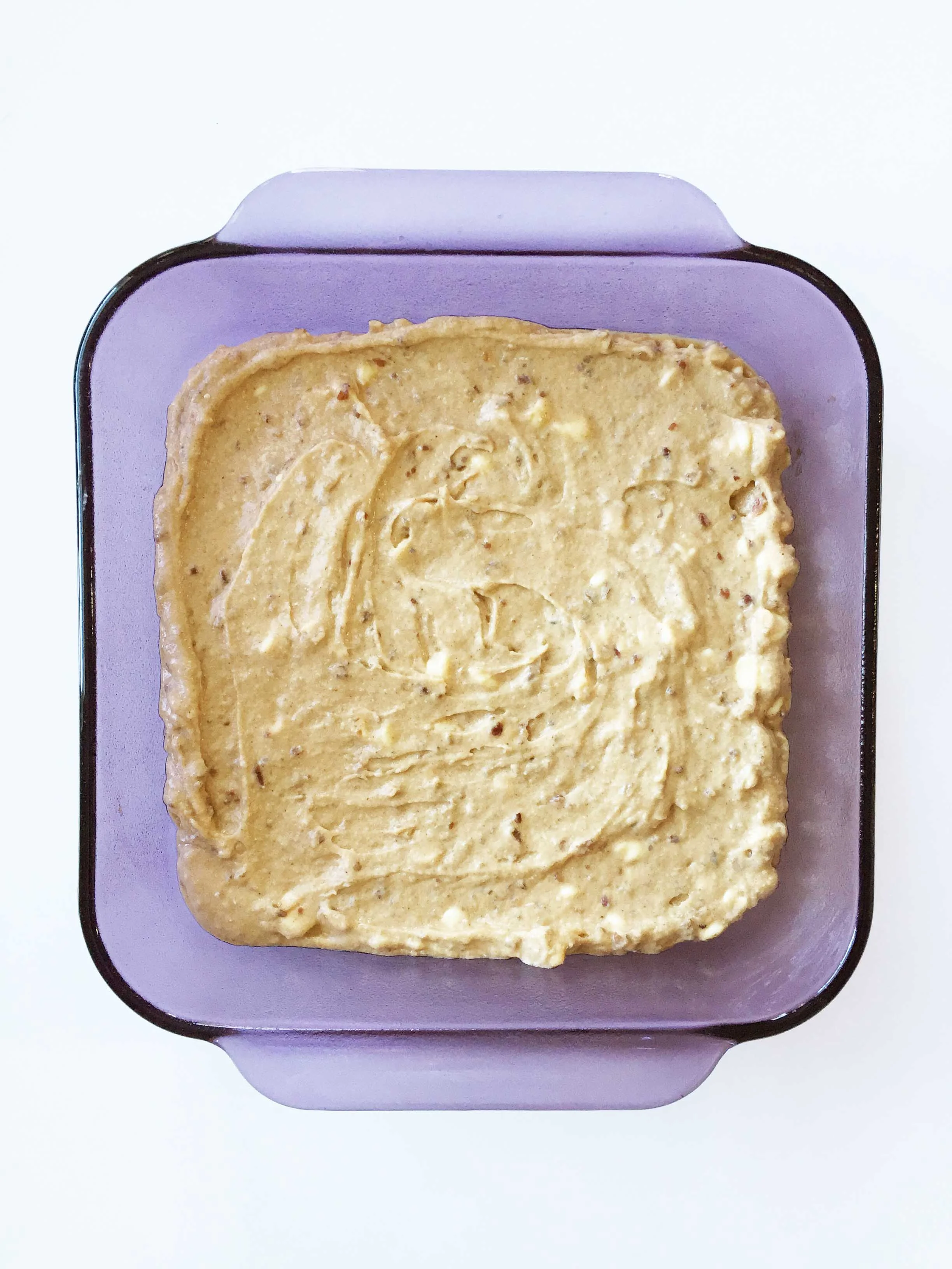 Spread the mixture out into the bottom of the prepared baking dish and place it into the oven to bake for about 30-34 minutes; or until an inserted toothpick comes out clean.