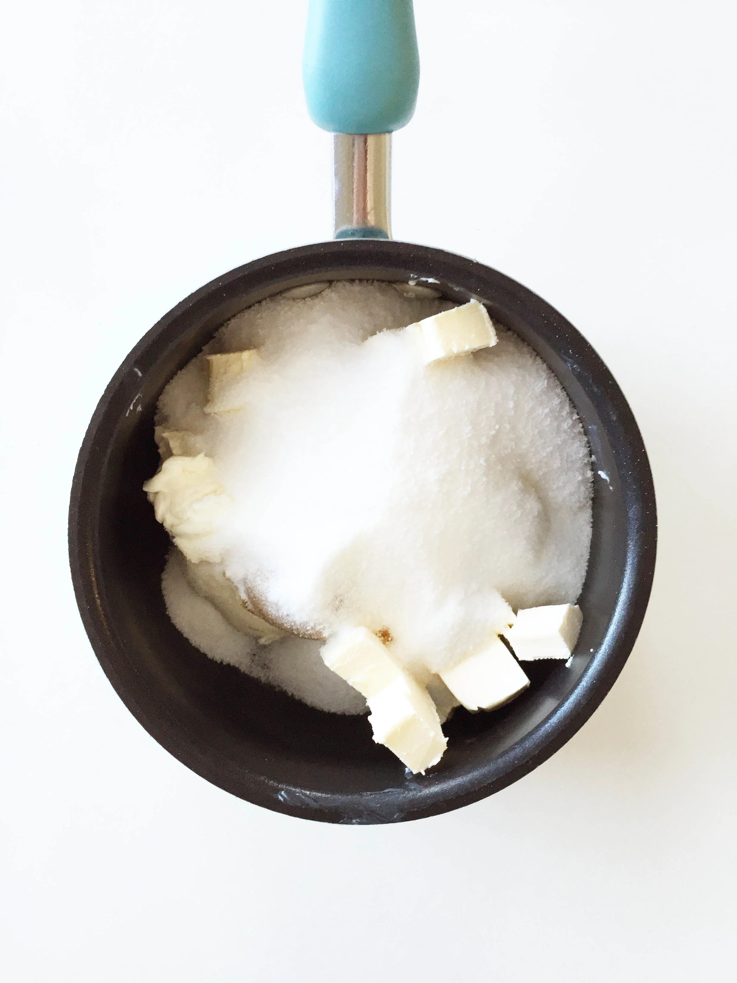 Combine 2 1/2 Tbsp. butter, 1/4 C. sugar, 2 Tbsp. sweetener, 4 Oz. cream cheese, 2 Tbsp. Almond Egg Nog, and 1 Tbsp. brown sugar blend in a medium sauce pan.