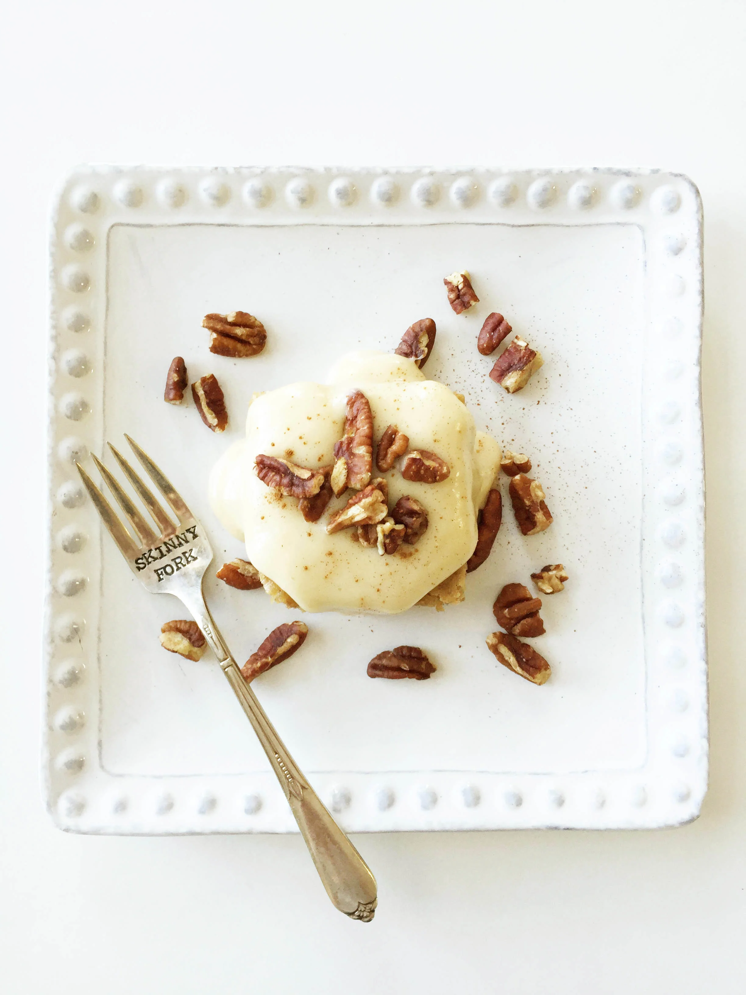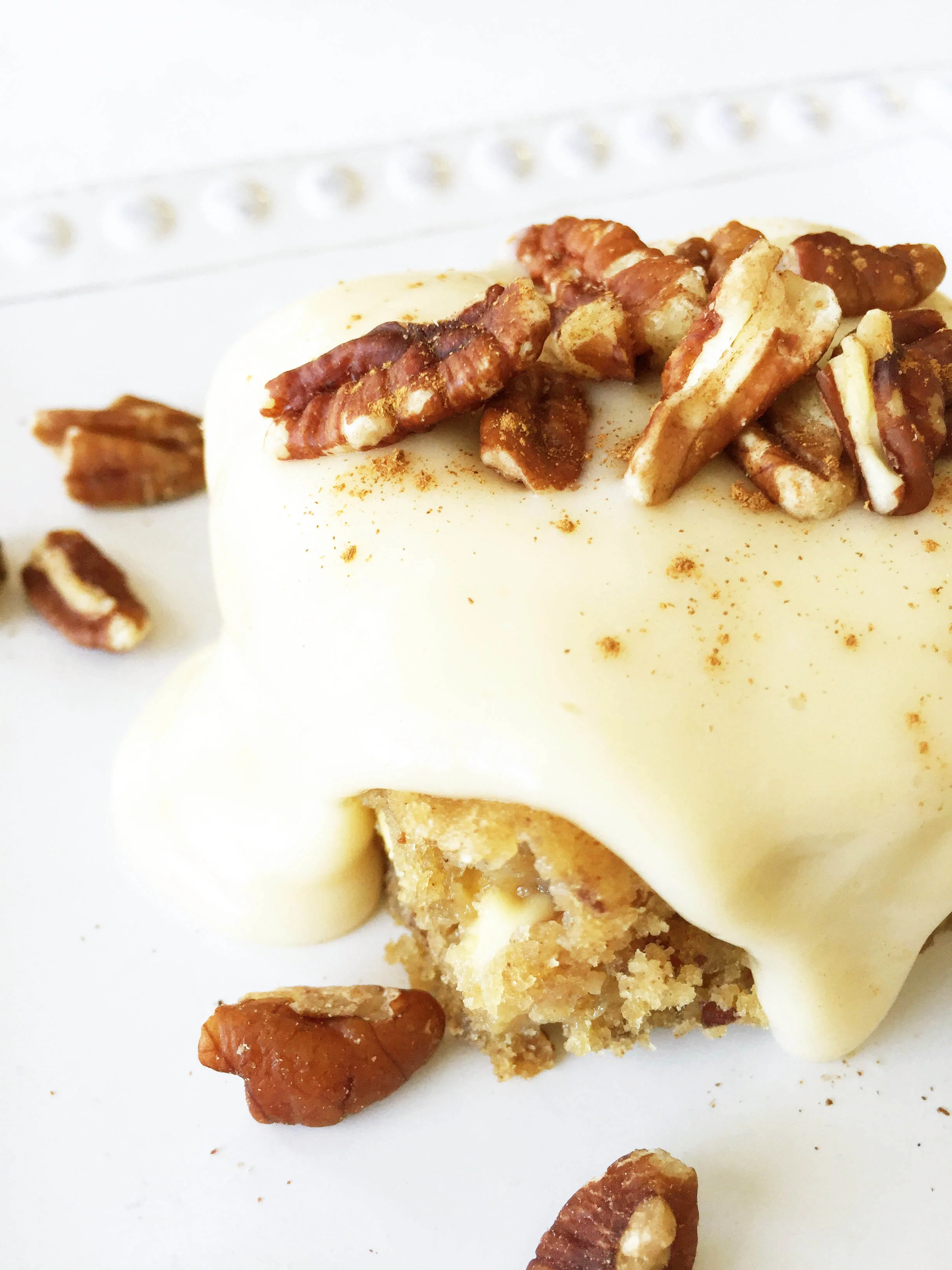 As we're getting into the thick of the holiday season, I wanted to step out of the box again and create a lighter take on one of my most favorite desserts in the world, a blondie! Any blondie just won't do. It had to be full of pecans, white chocolate, spice, and topped off with a decadent cream cheese sauce.