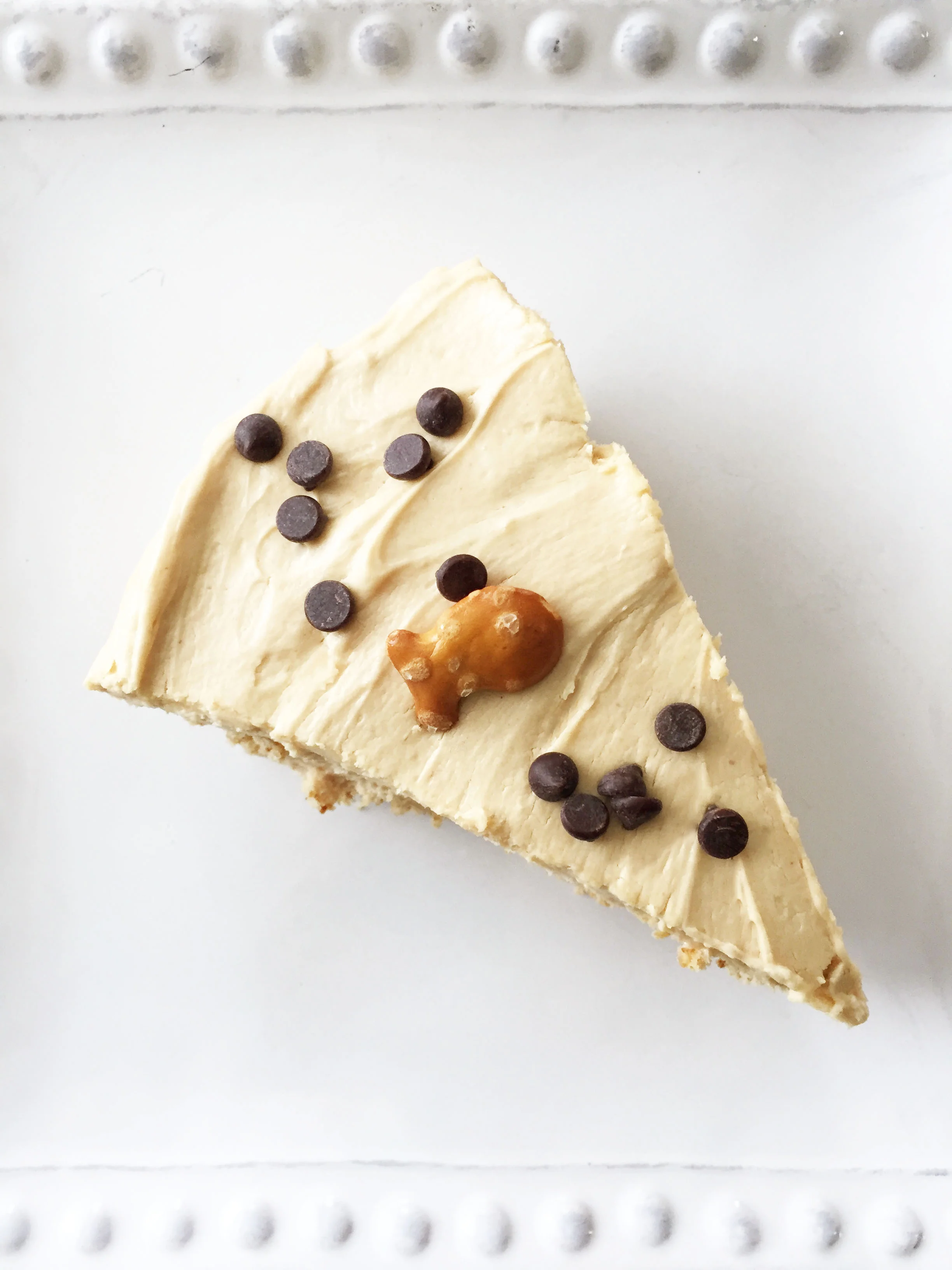 Did you know that most peanut butter cheesecakes clock in at over 500 calories in a single slice? Never mind the 51+ in total carbohydrates. Yikes! Since I was also going for something lighter and rather wholesome, I immediately went for the pretzel Goldfish snacks for a crust! I also used a greek yogurt cream cheese to give an added boost of protein. It didn't hurt that it was 1/3 less fat that regular cream cheese too.