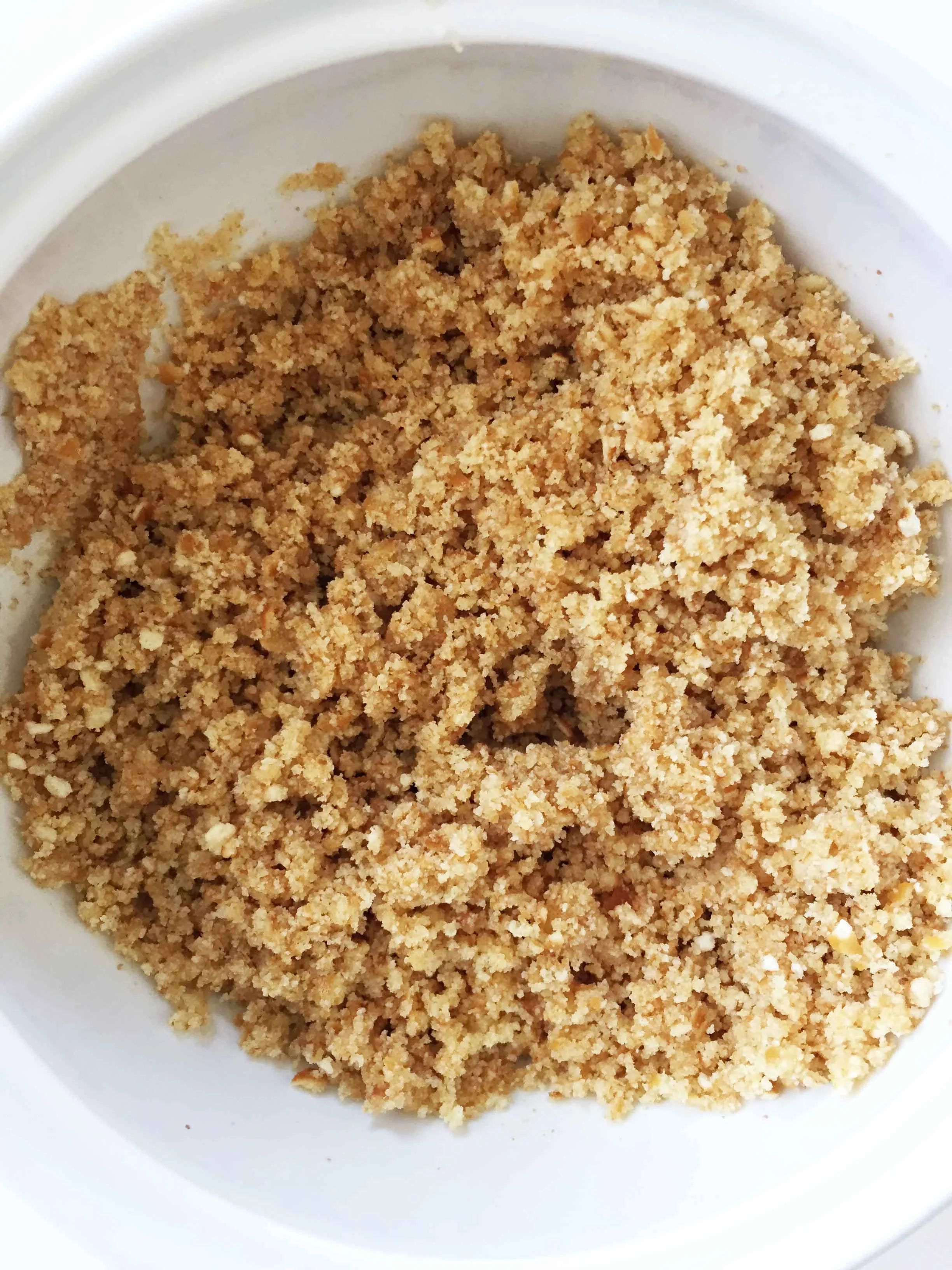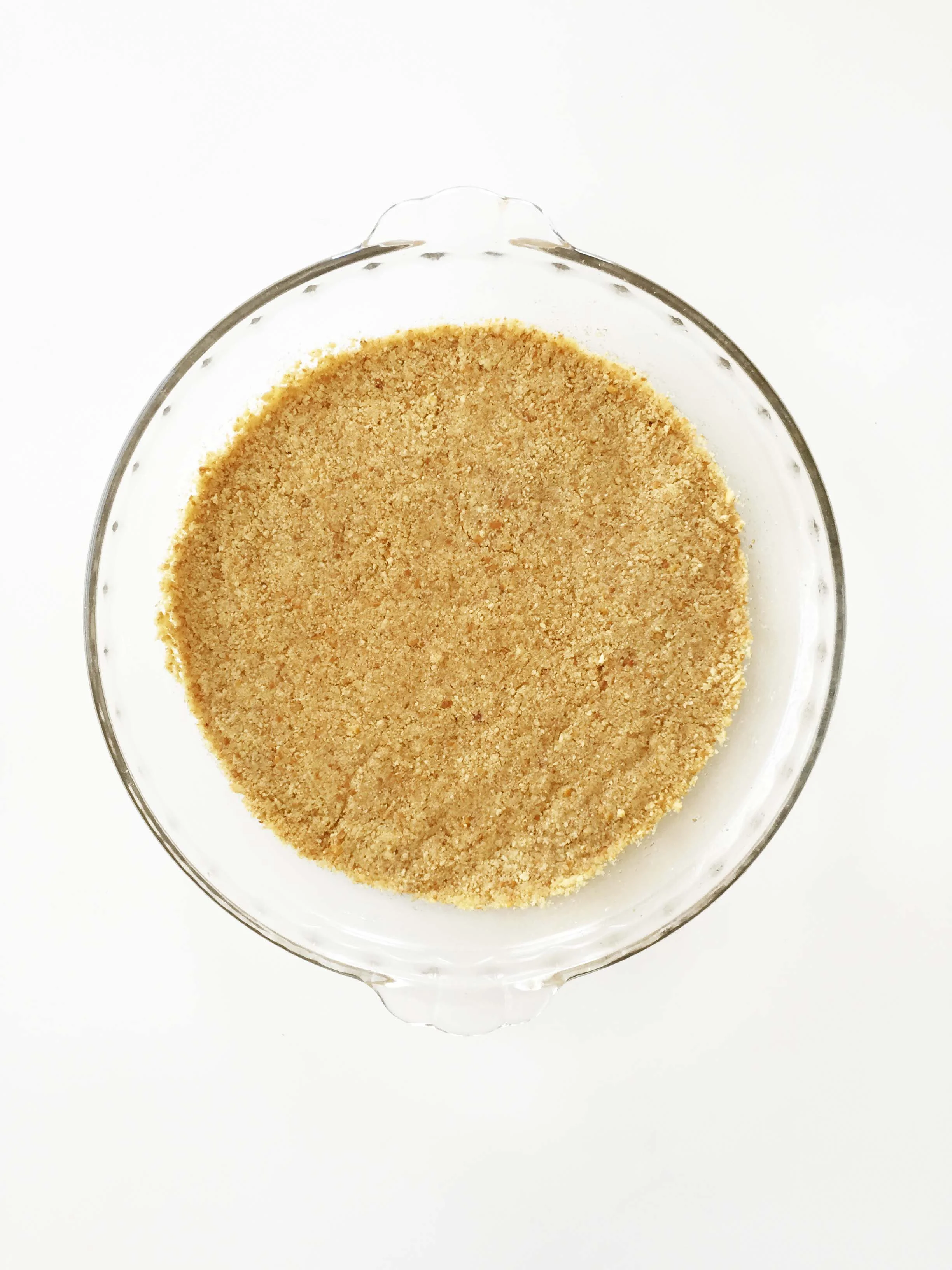 Press the crumb mixture into the bottom of the prepared pie dish and place in the oven to bake for about 15 minutes or until the edges are starting to brown.