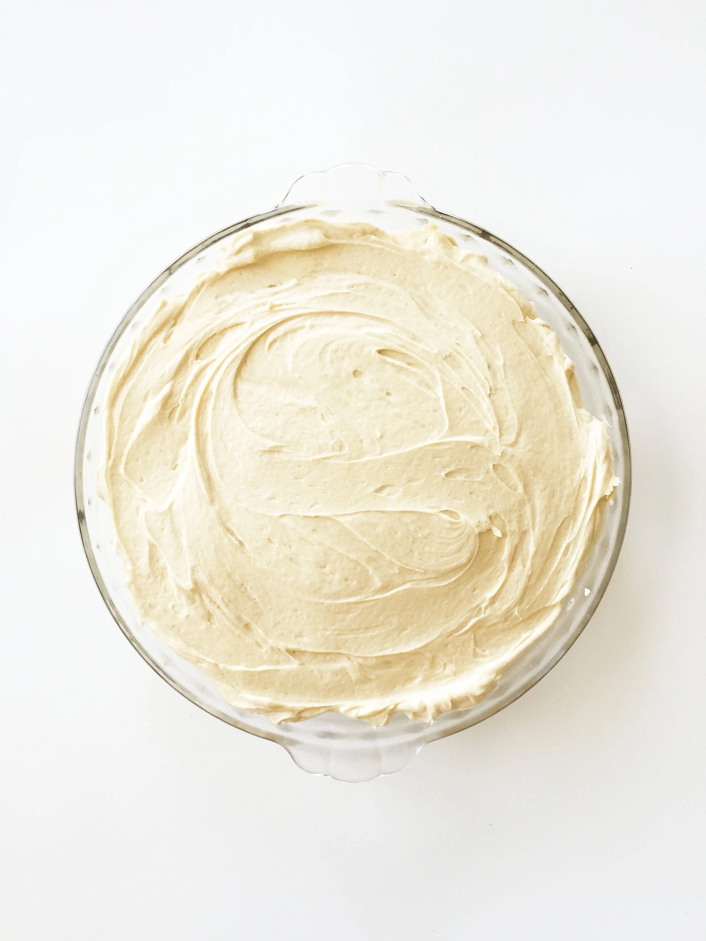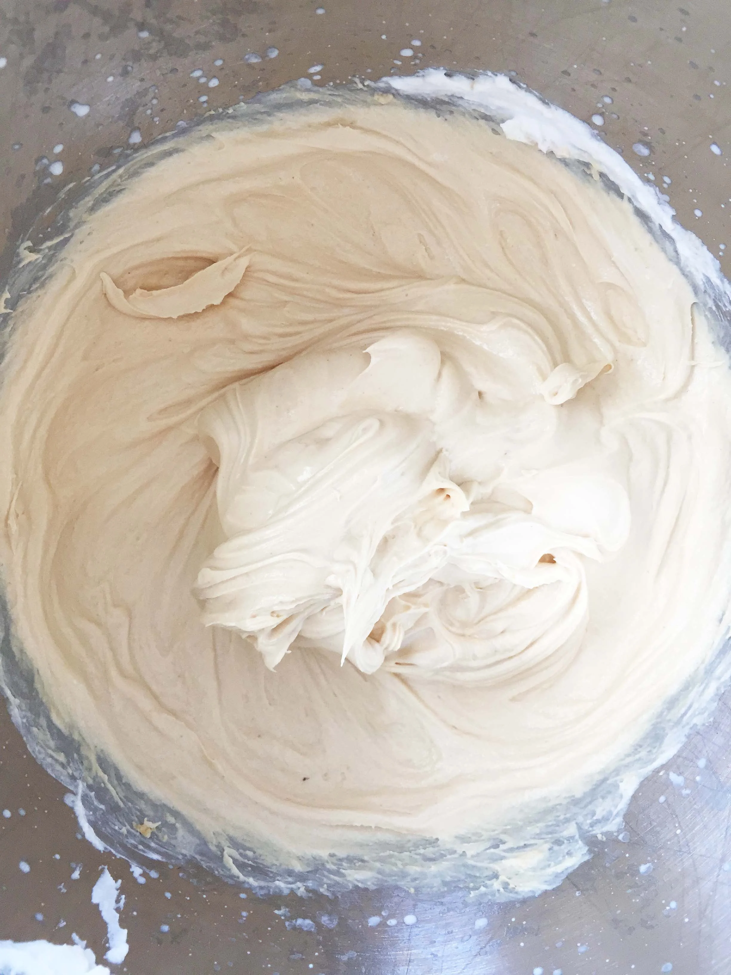 Add the peanut butter mixture to the whipped cream and beat on a slow speed until smooth and creamy.