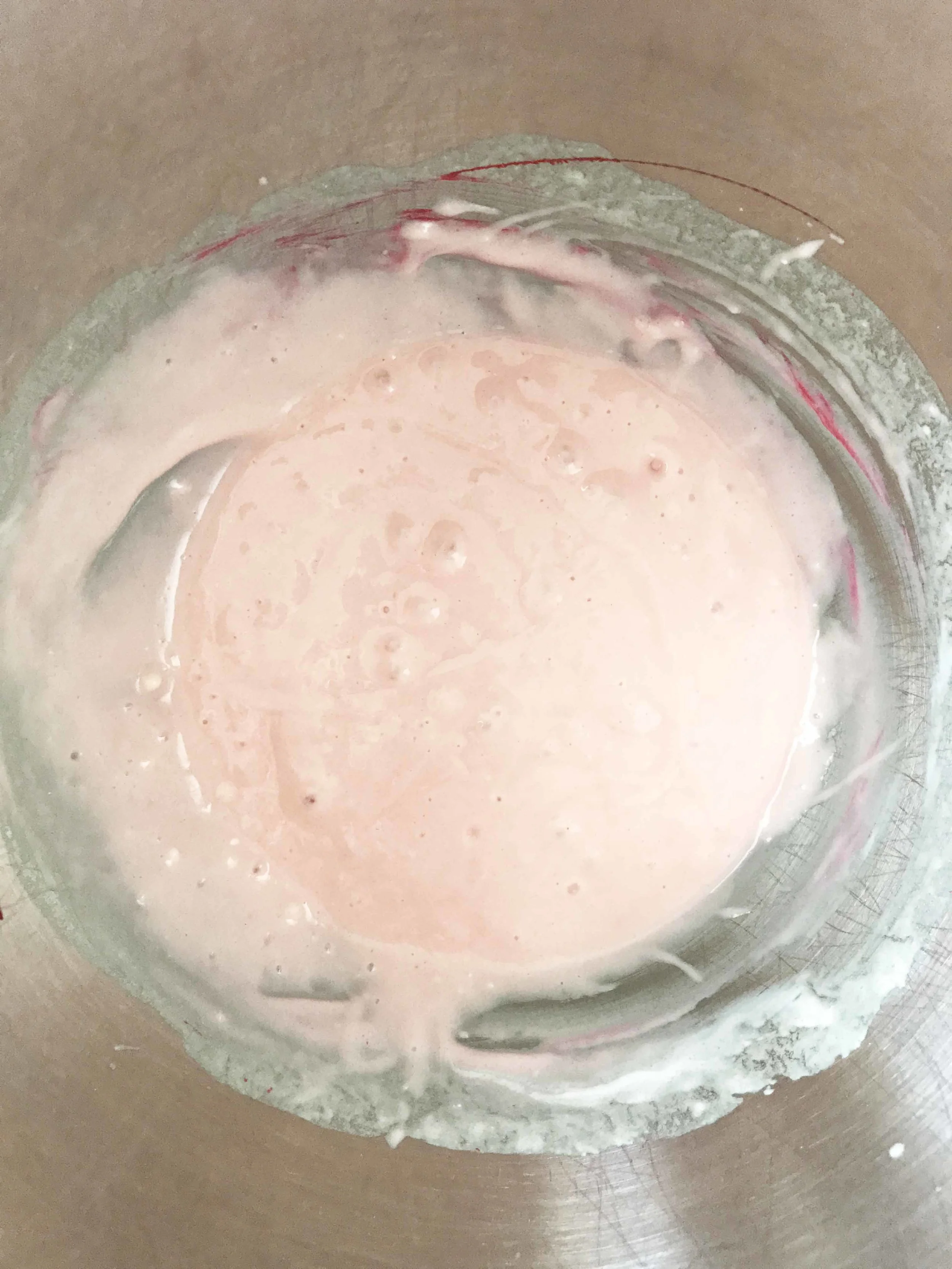 Mix together the 1 Box White Cake Mix, 1 1/4 C. Champagne, 6 Oz. Fat Free Plain Greek Yogurt, 2 Egg Whites, 1 1/2 Tsp. Vanilla Extract and the Pink Food Coloring into a large bowl until well combined.