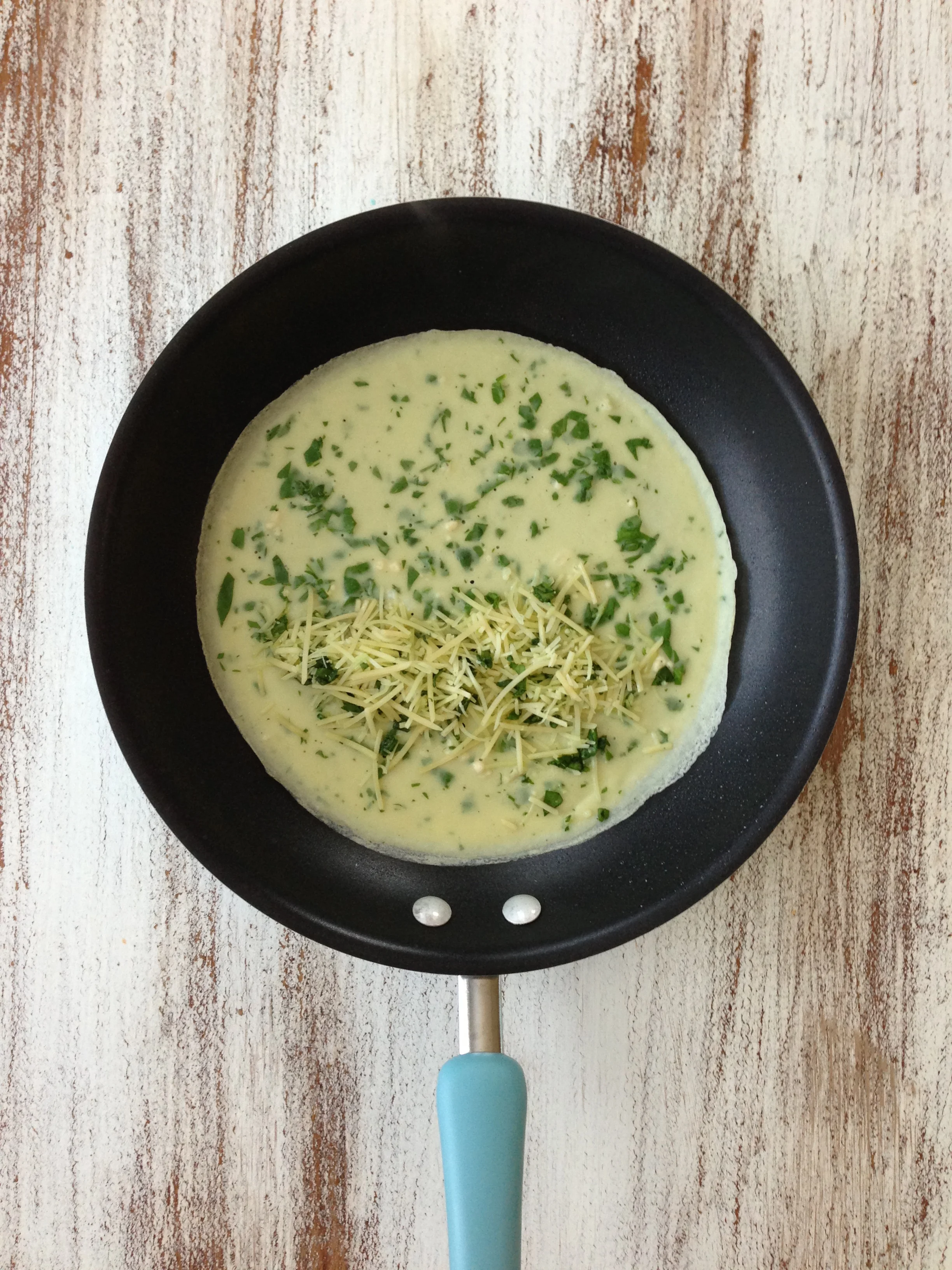 Place about 6 tbsp. (1/3 c.) of the batter to the pan. Gently roll the batter around to coat the bottom of the skillet evenly and allow to cook. This won't take long! The crepe batter will be in the pan for a minute or less to cook through.