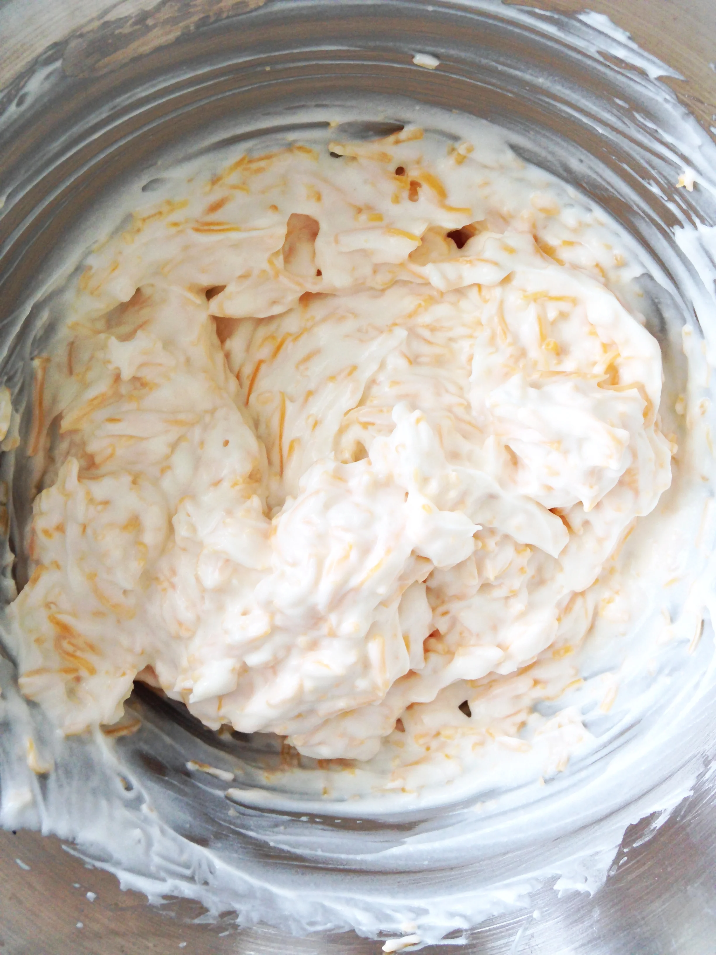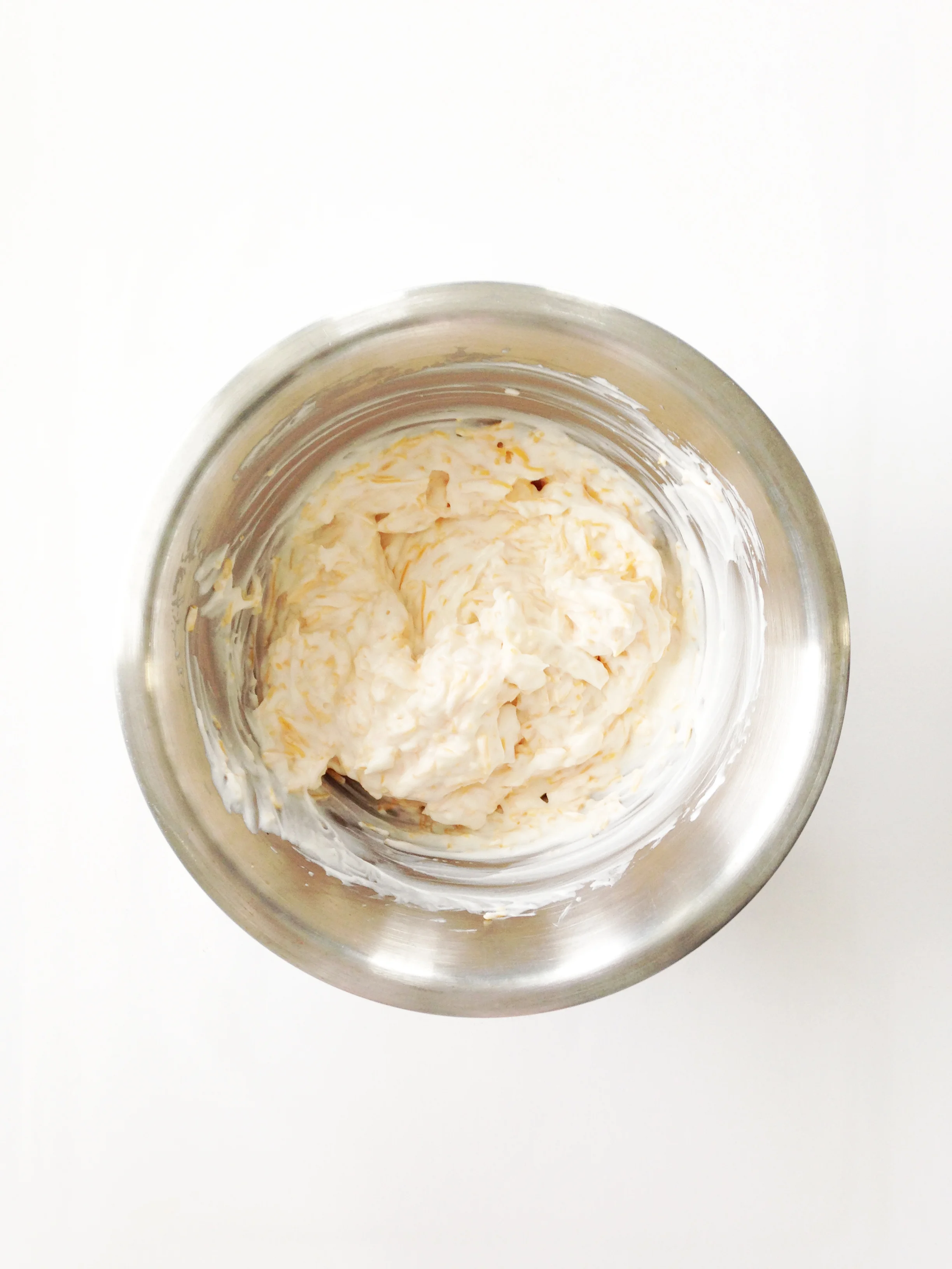 In a medium bow, mix together the mayo, cheese, and greek yogurt.