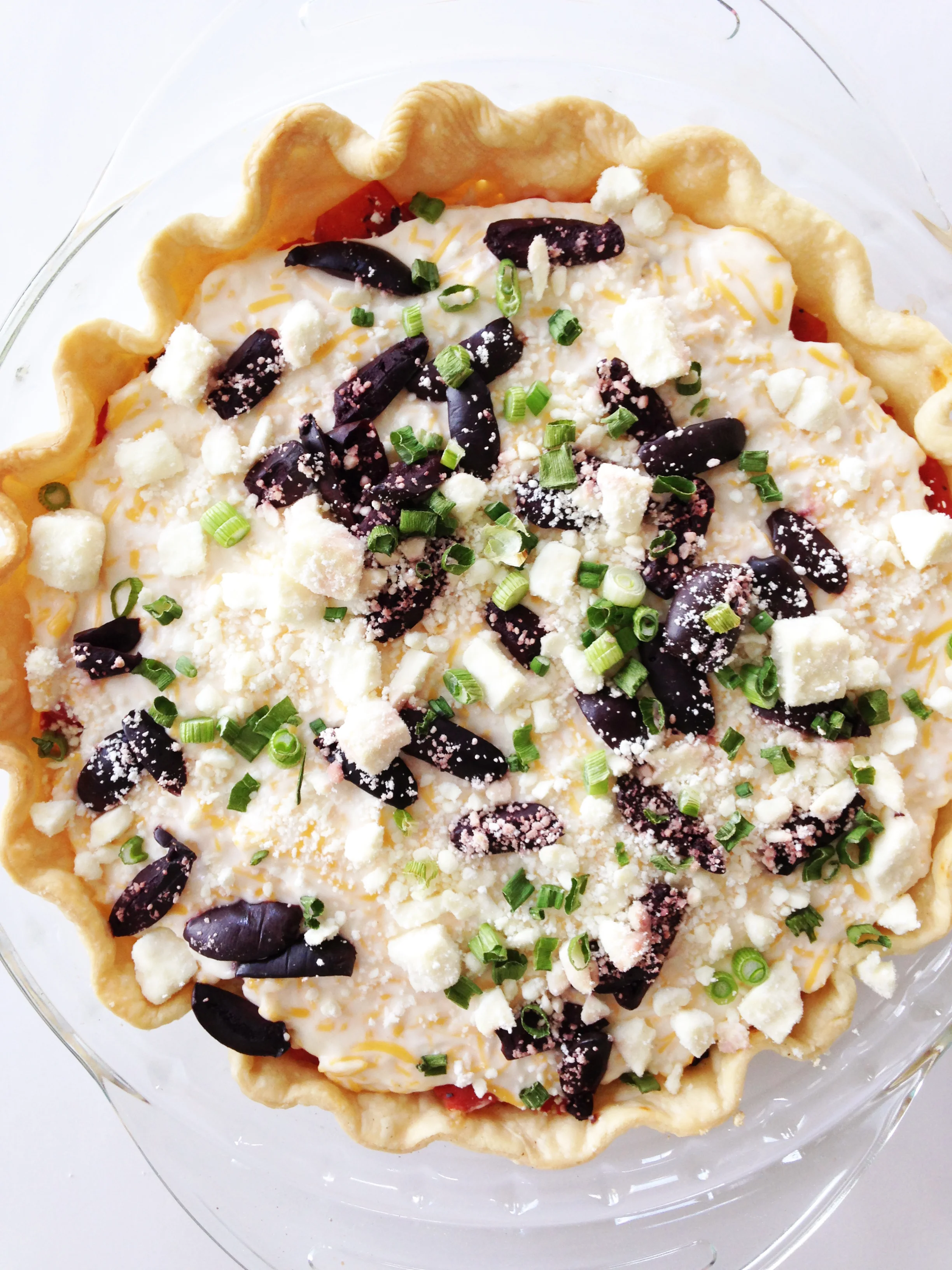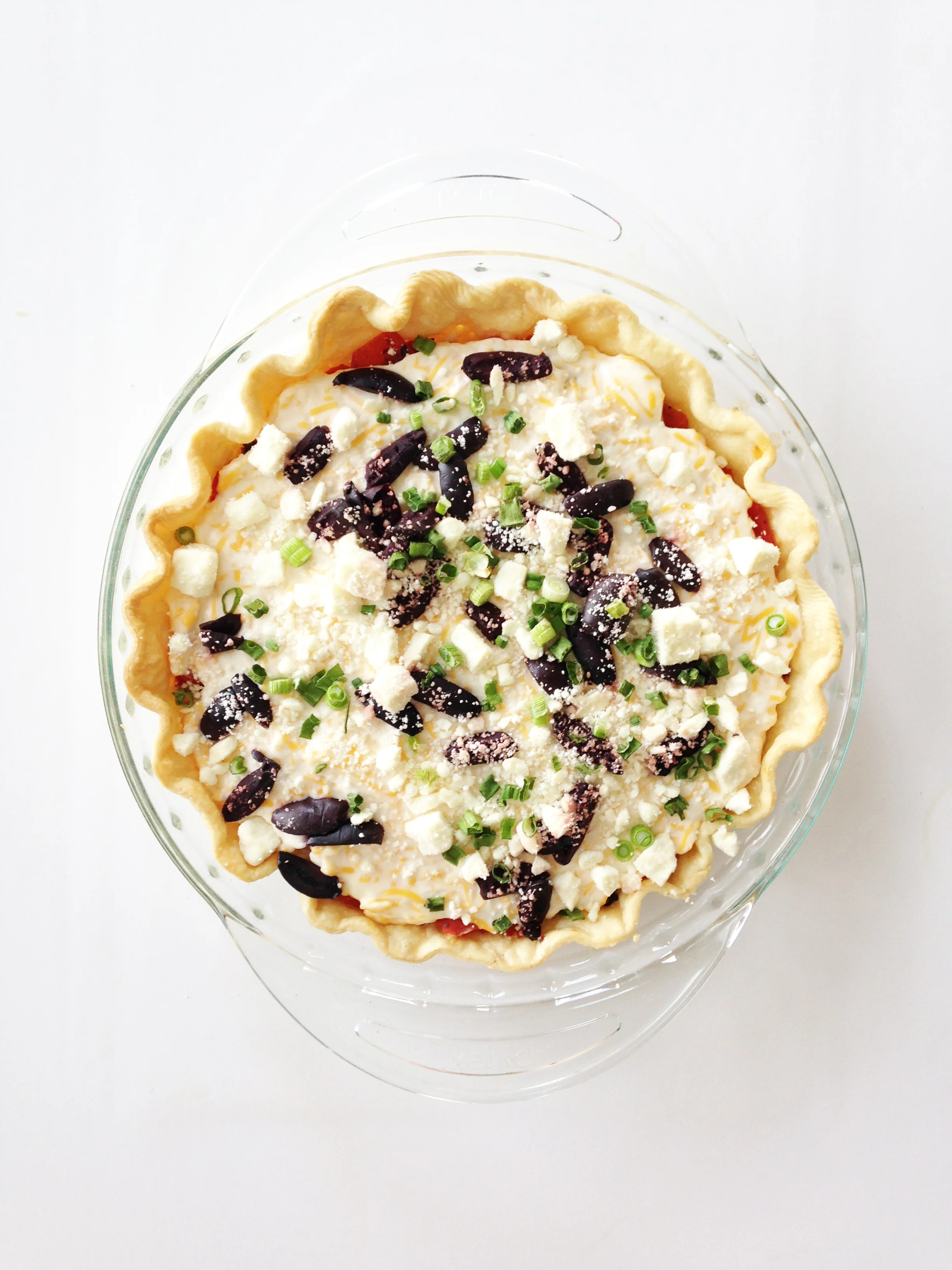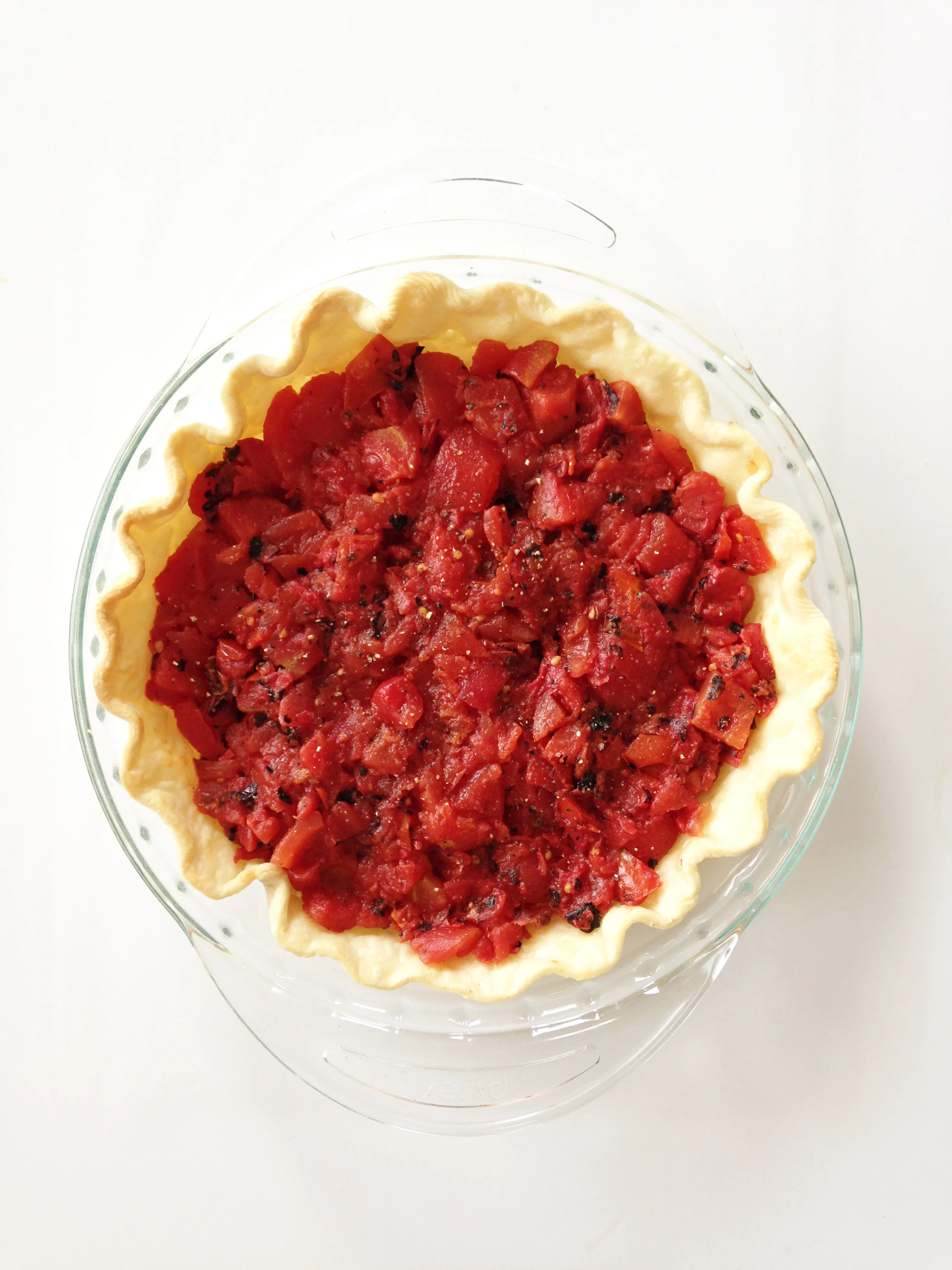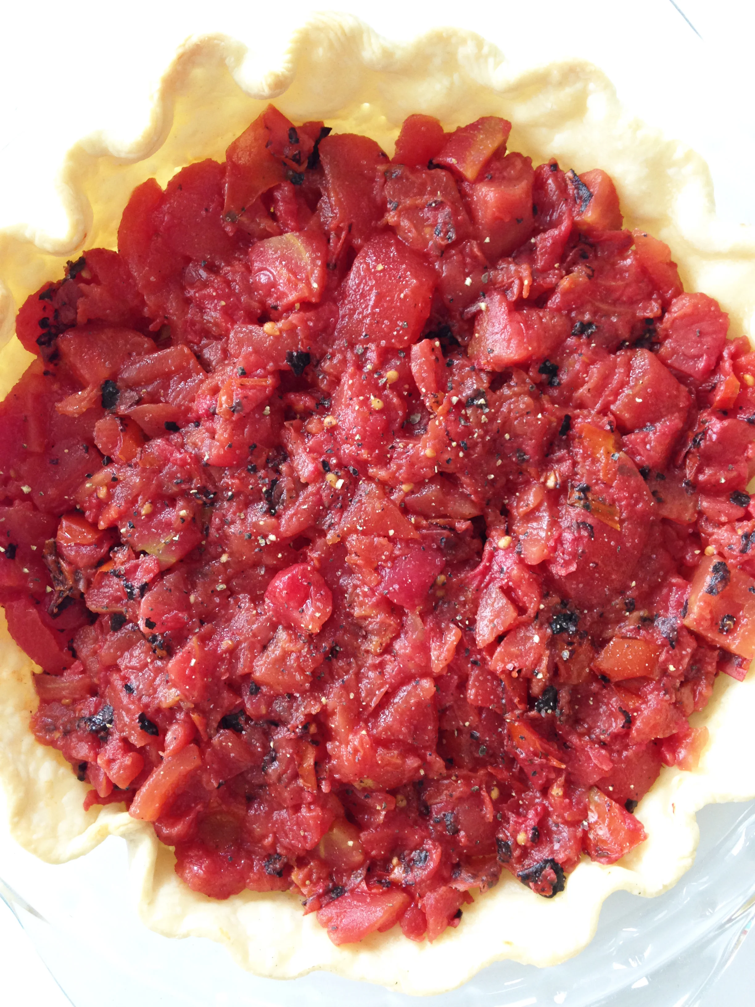 Once the tomatoes have drained, transfer them into the bottom of the pie shell and sprinkle with green onions and salt and pepper to taste. Set aside.