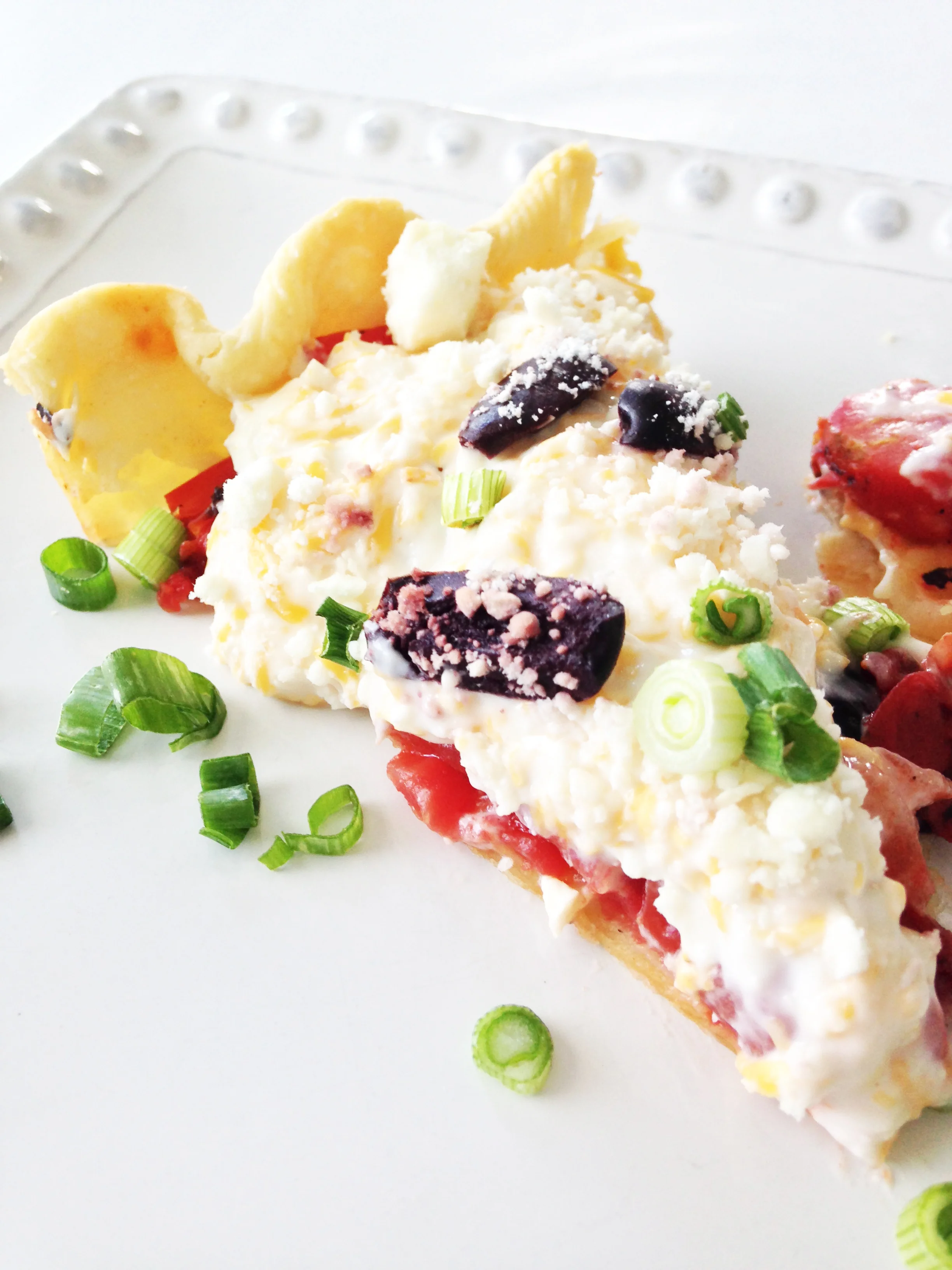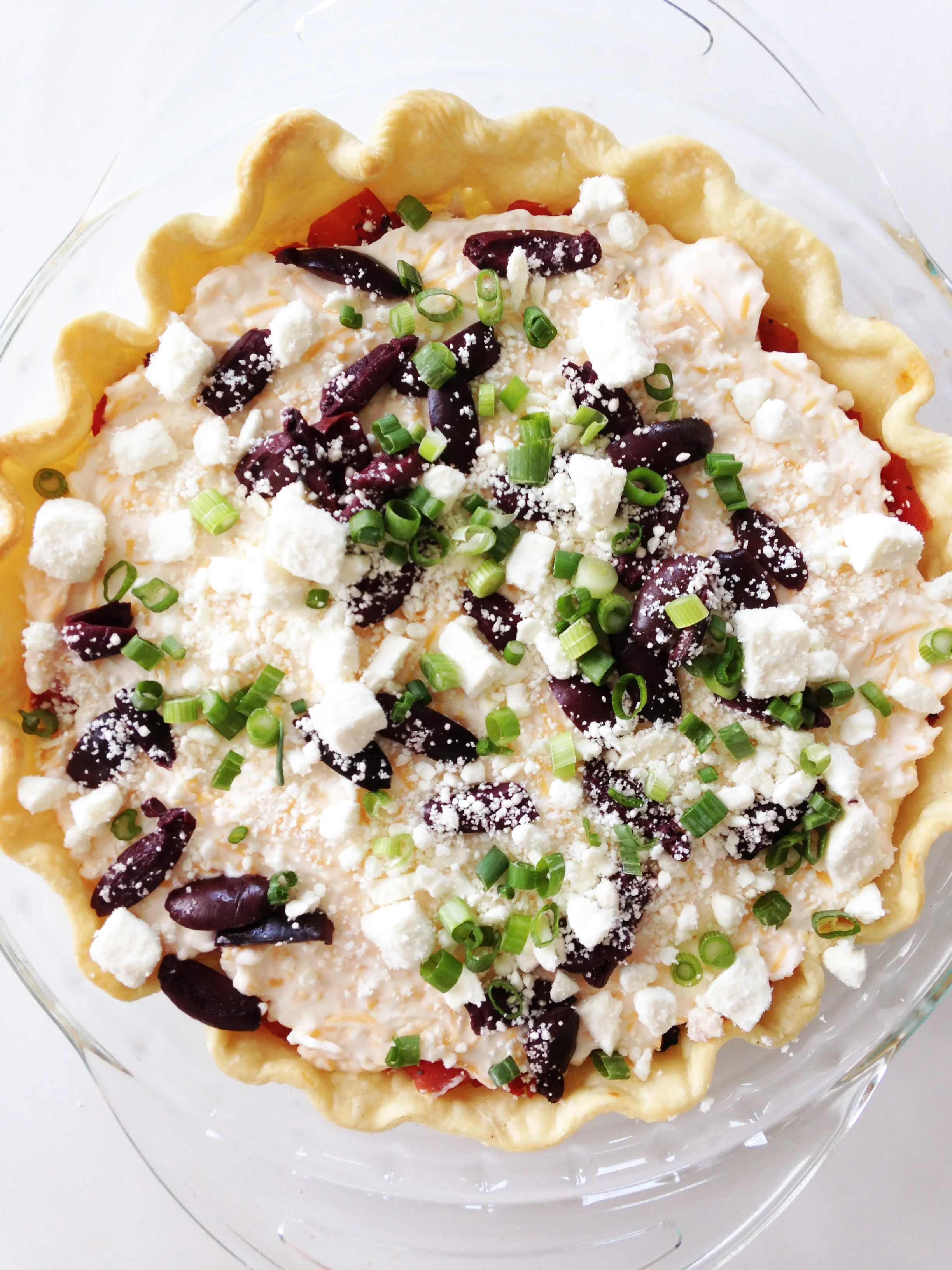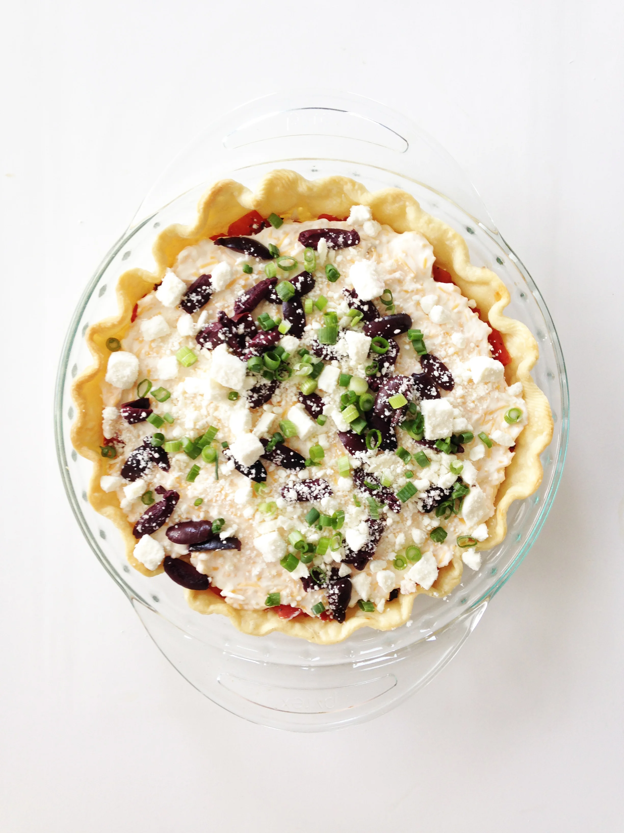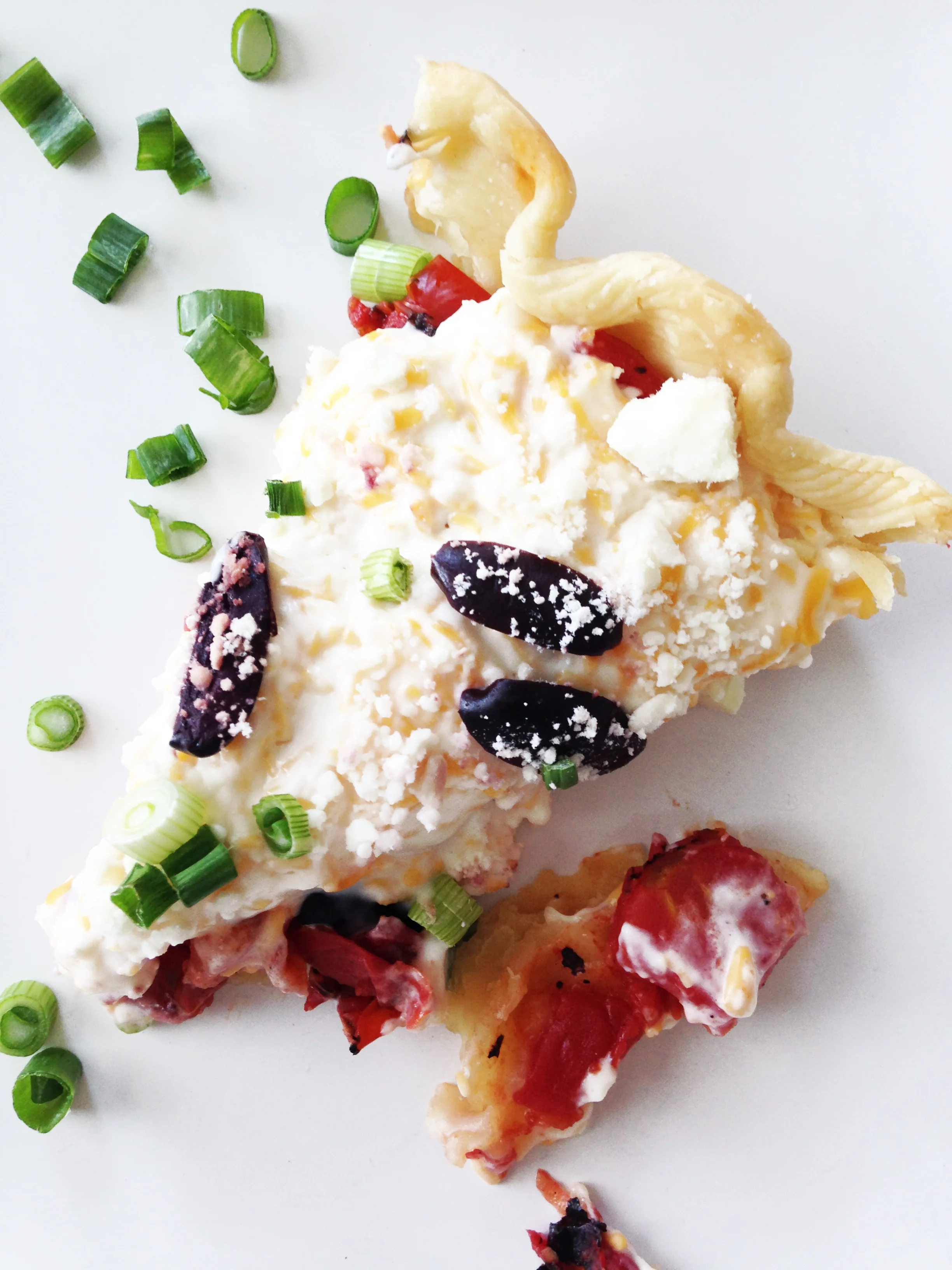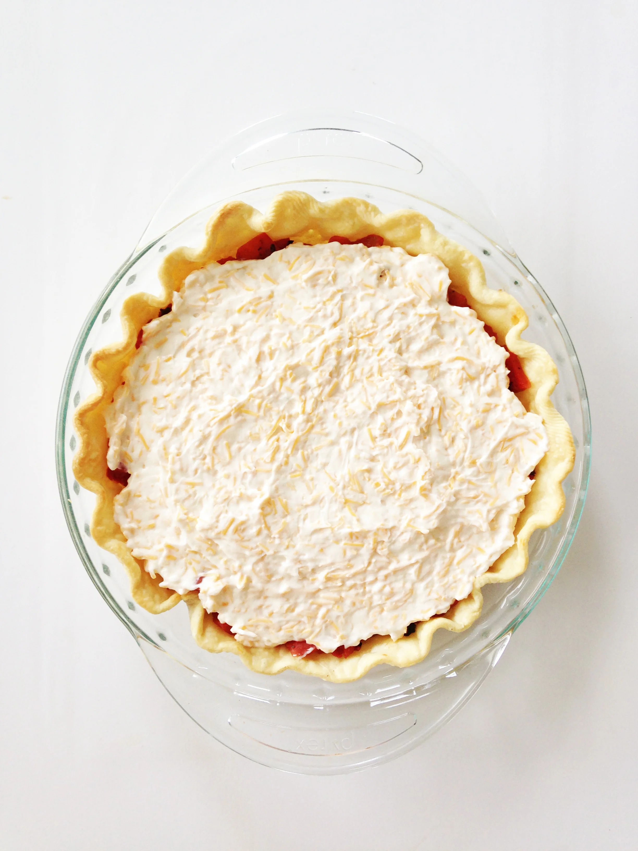 Once the tomatoes have drained, transfer them into the bottom of the pie shell and sprinkle with green onions and salt and pepper to taste. Set aside.