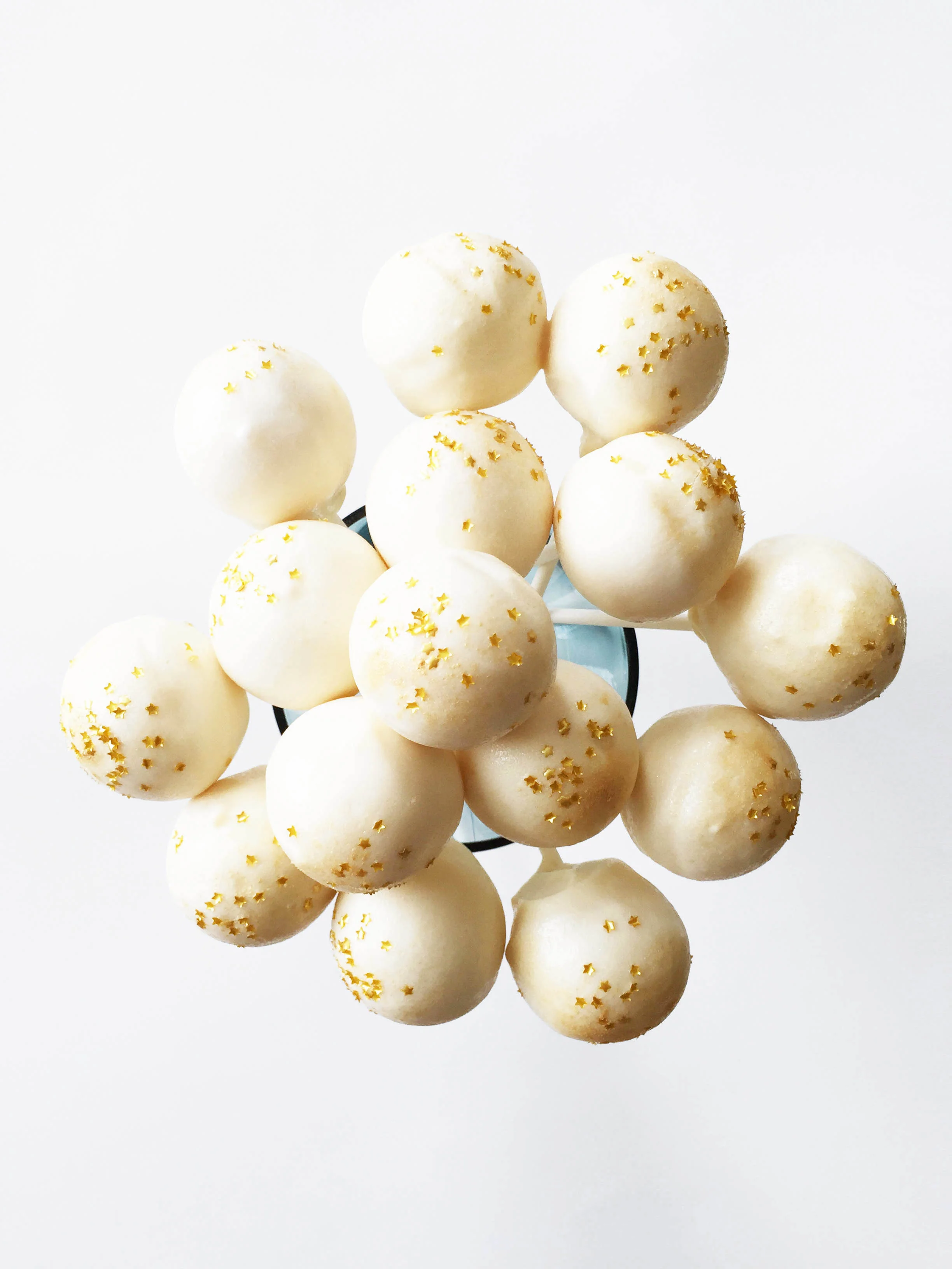 I decided to make these cake pops for New Year's Eve this year, so I went with a traditional vanilla flavor and some gold glittery decorations. Pretty nifty right? I mean... who doesn't enjoy the thought of eating sparkles and gold? It just makes you feel so fancy.