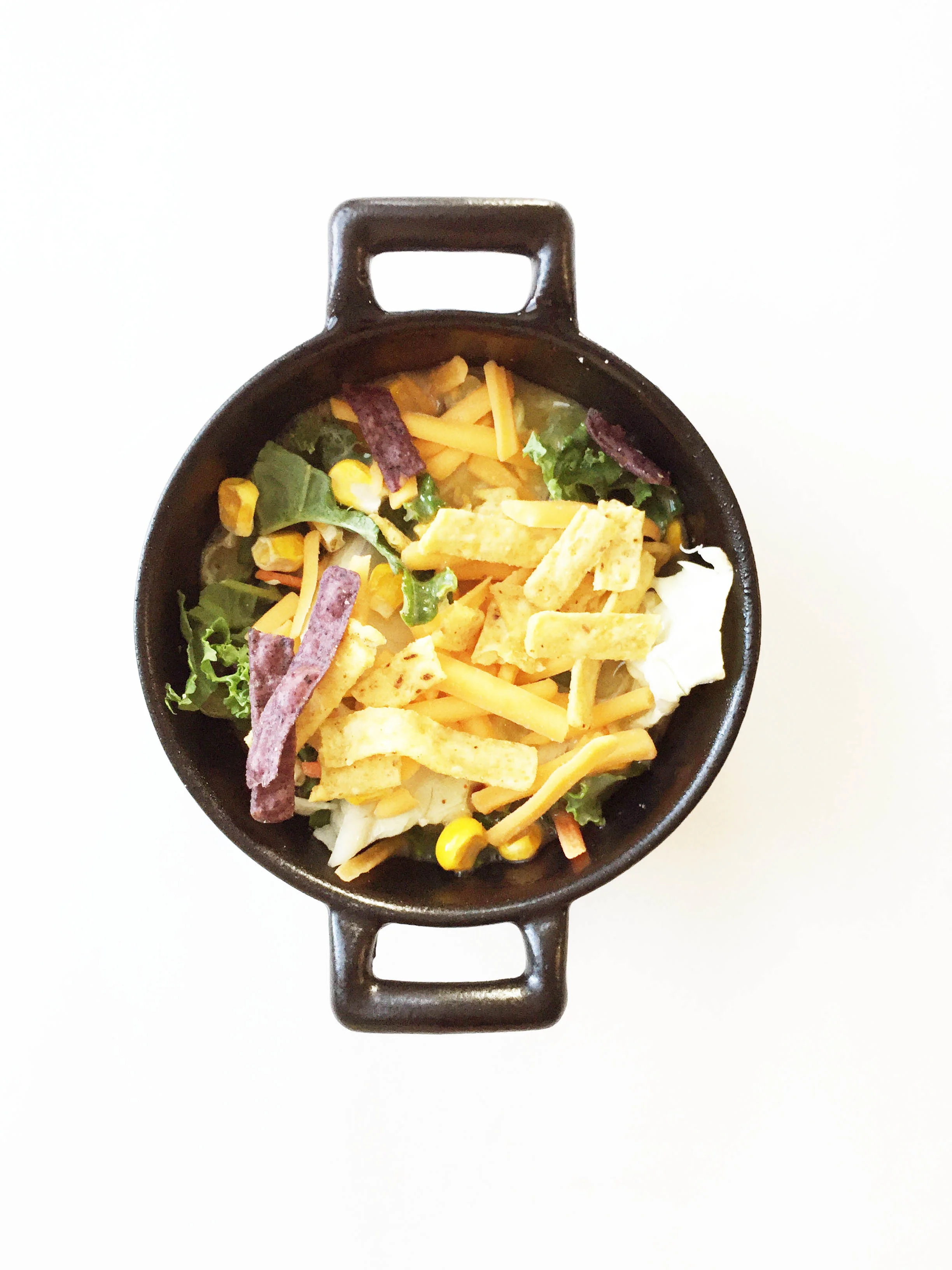 Pour the egg mixture over the greens and top with some of the corn, shredded cheddar, and tortilla strips from the Eat Smart Southwest Gourmet Vegetable Salad Kit.