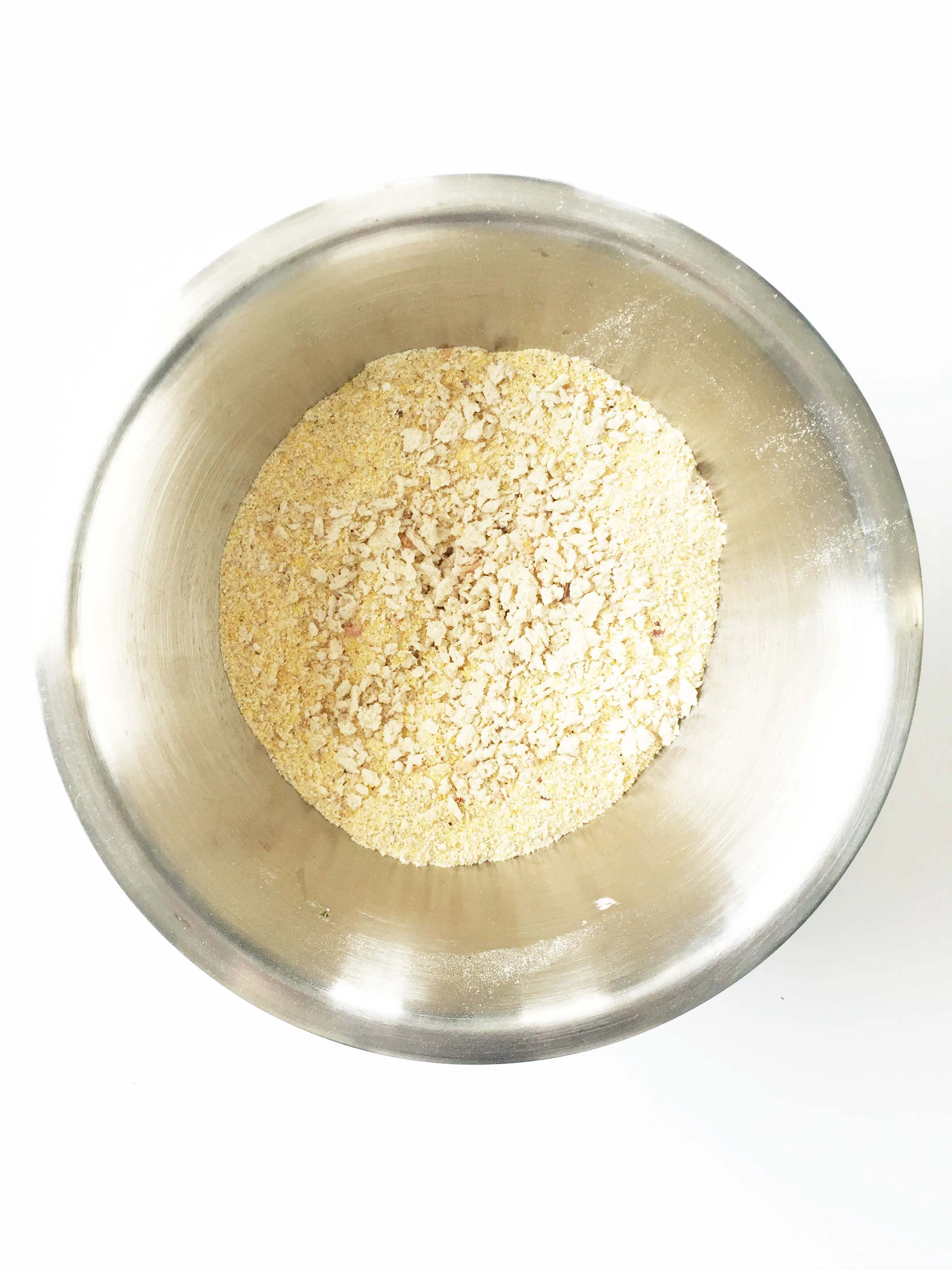 In a medium bowl, whisk together the 1/2 C. Yellow Cornmeal, 1/2 C. Panko Bread Crumbs, 2 Tbsp. Whole Wheat White Flour, 1 Tsp. Chili Powder, 1/2 Tsp. Ground Cumin, 1/4 Tsp. Paprika, 1/4 Tsp. Salt, and 1/4 Tsp. Black Pepper; set aside.