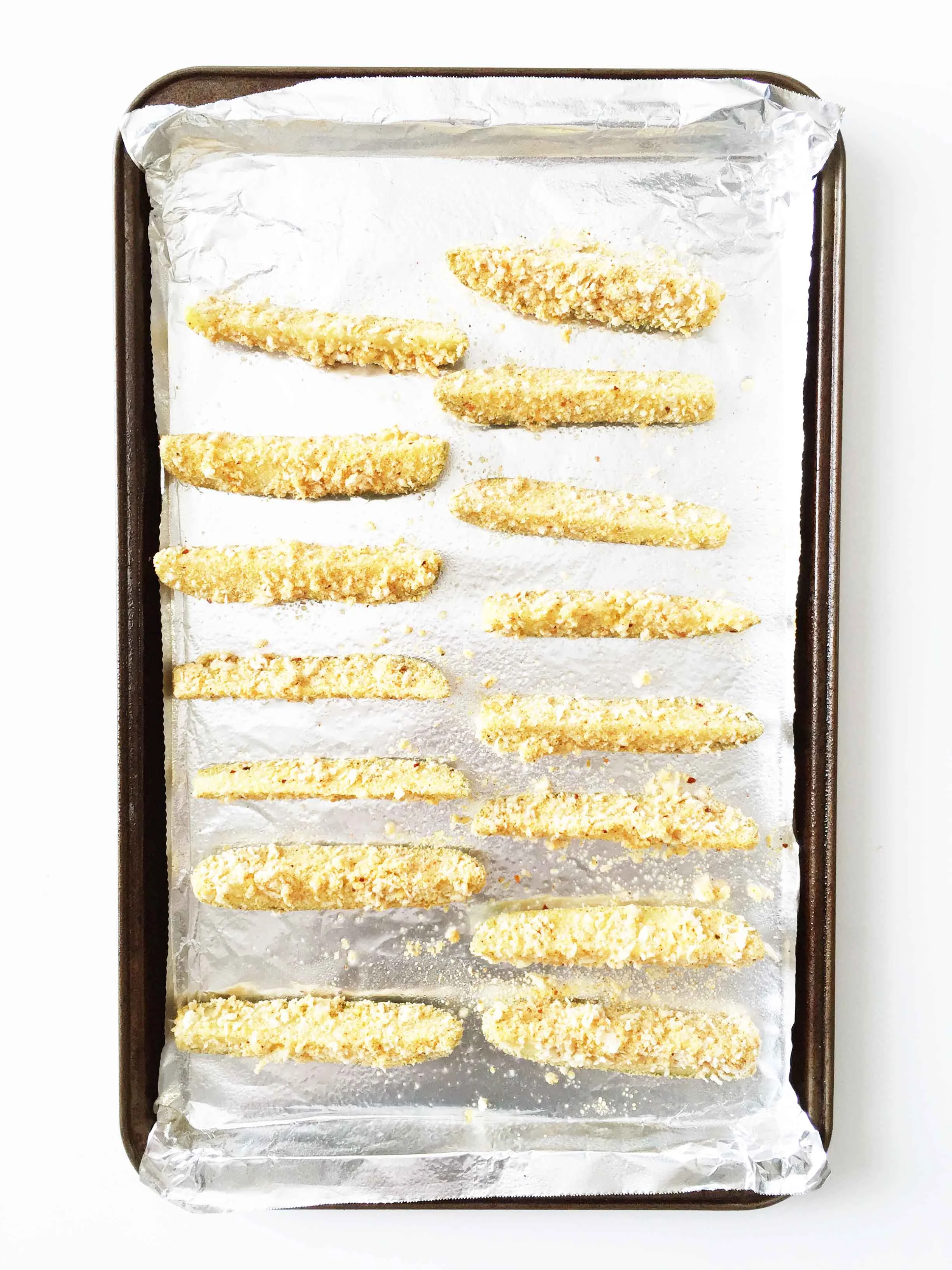 Place the breaded pickles onto the baking sheet and give them all a coat of non-stick cooking spray.